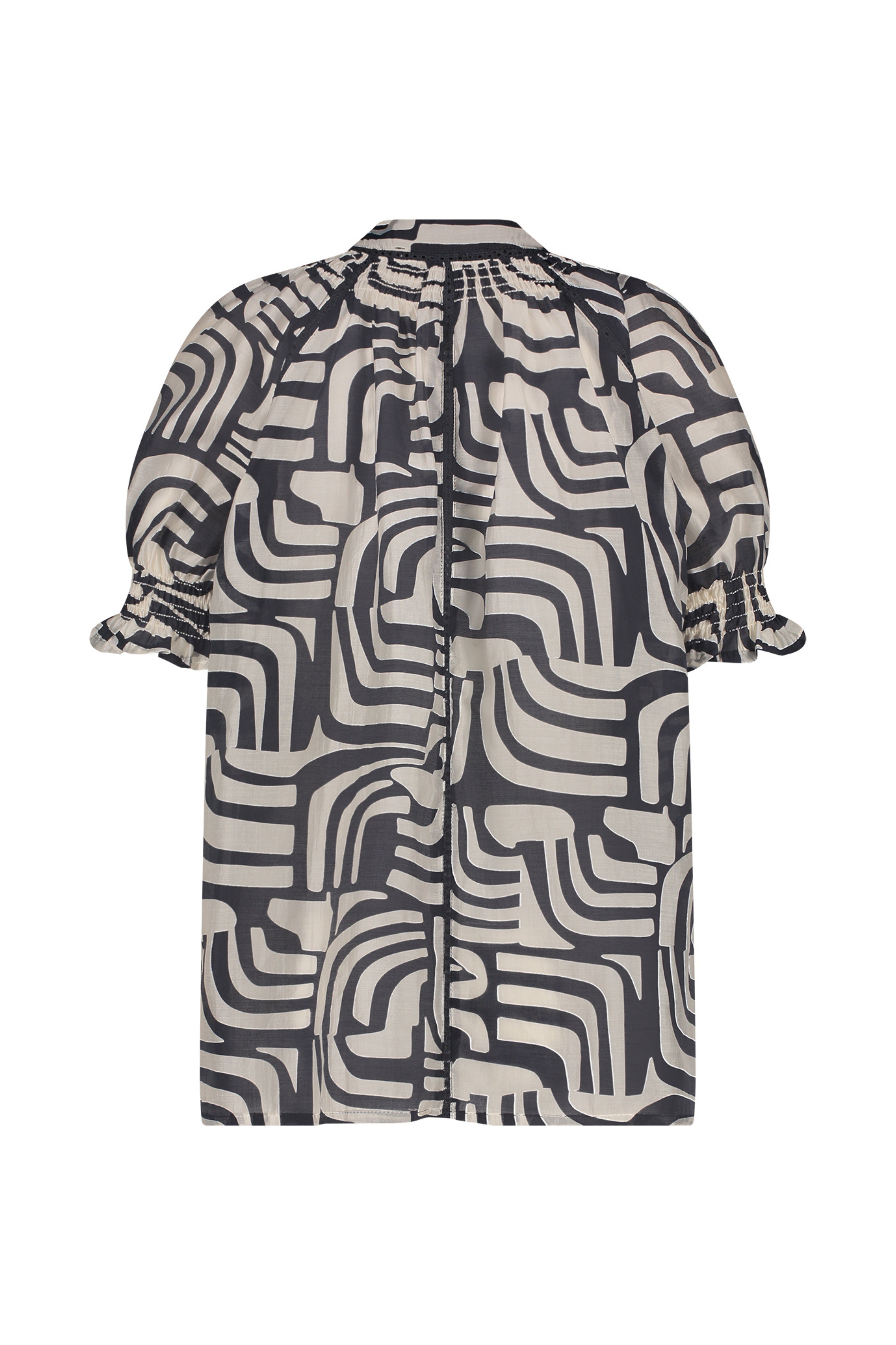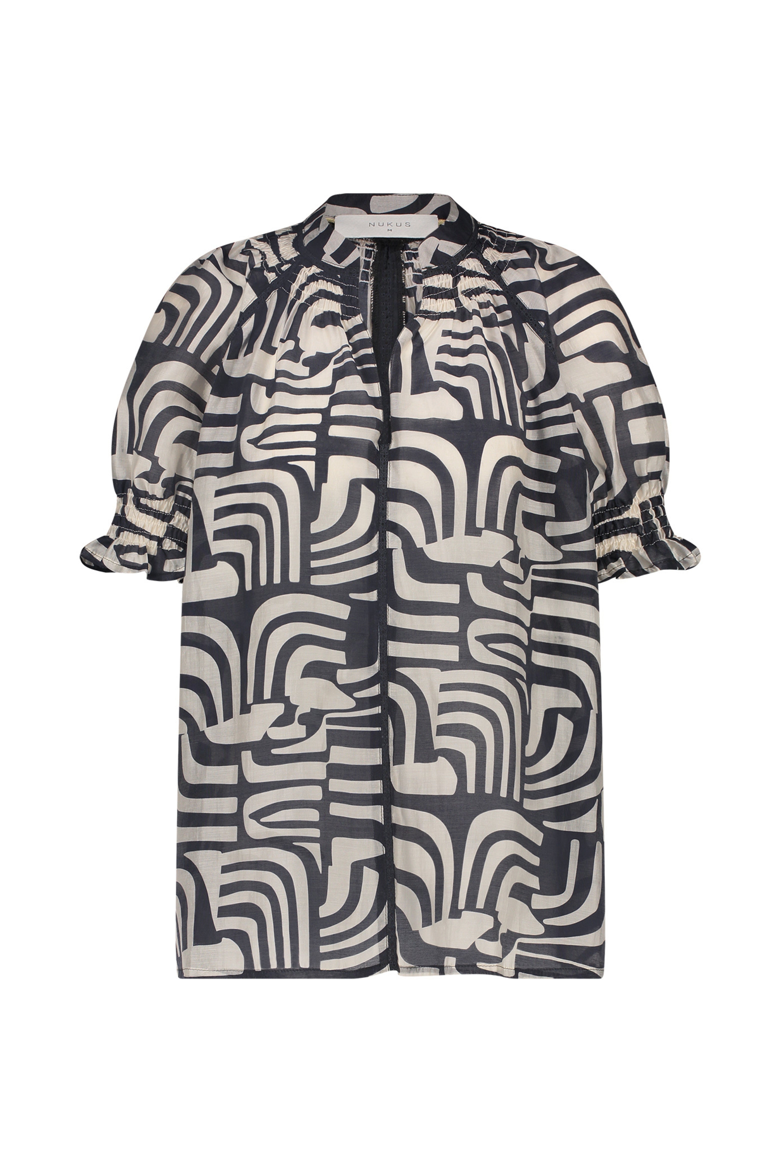 De Top Carolina Off White Navy van Nukus is een stijlvolle blouse met een speelse grafische print. De luchtige stof, pofmouwen en subtiele ruches geven een vrouwelijke touch aan elke outfit!