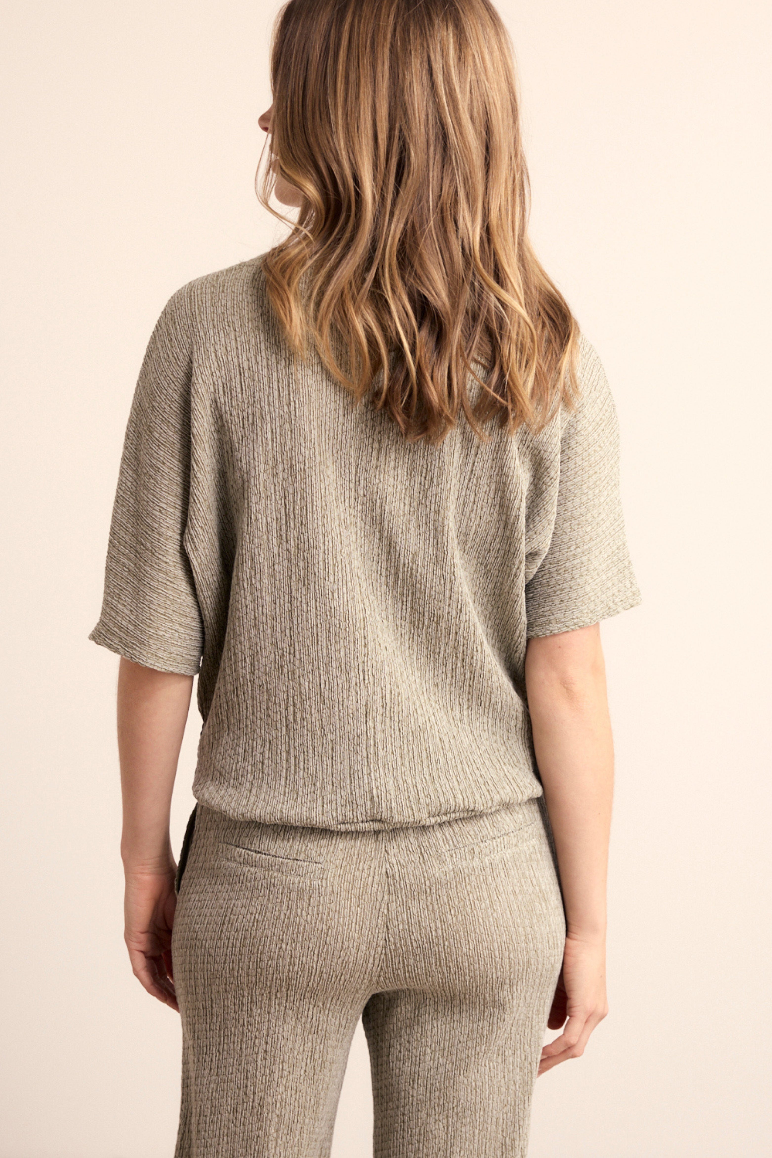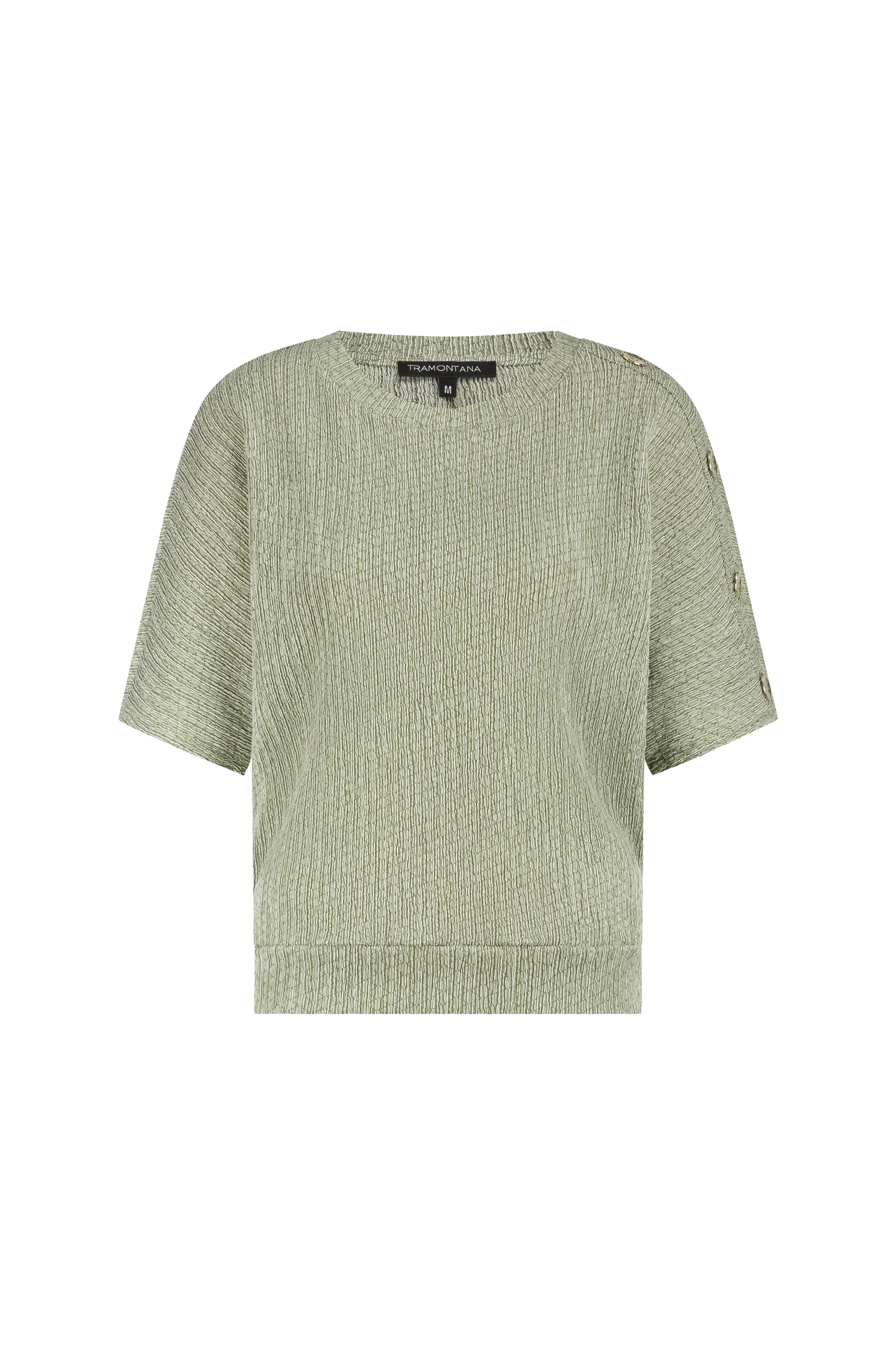 De Top Crinkled Button Detail Aloe Melange van Tramontana is een moderne top met een verfijnde crinkle structuur. De subtiele knoopdetails op de mouw geven dit item een stijlvolle twist, perfect voor comfortabele en eigentijdse najaarslooks.