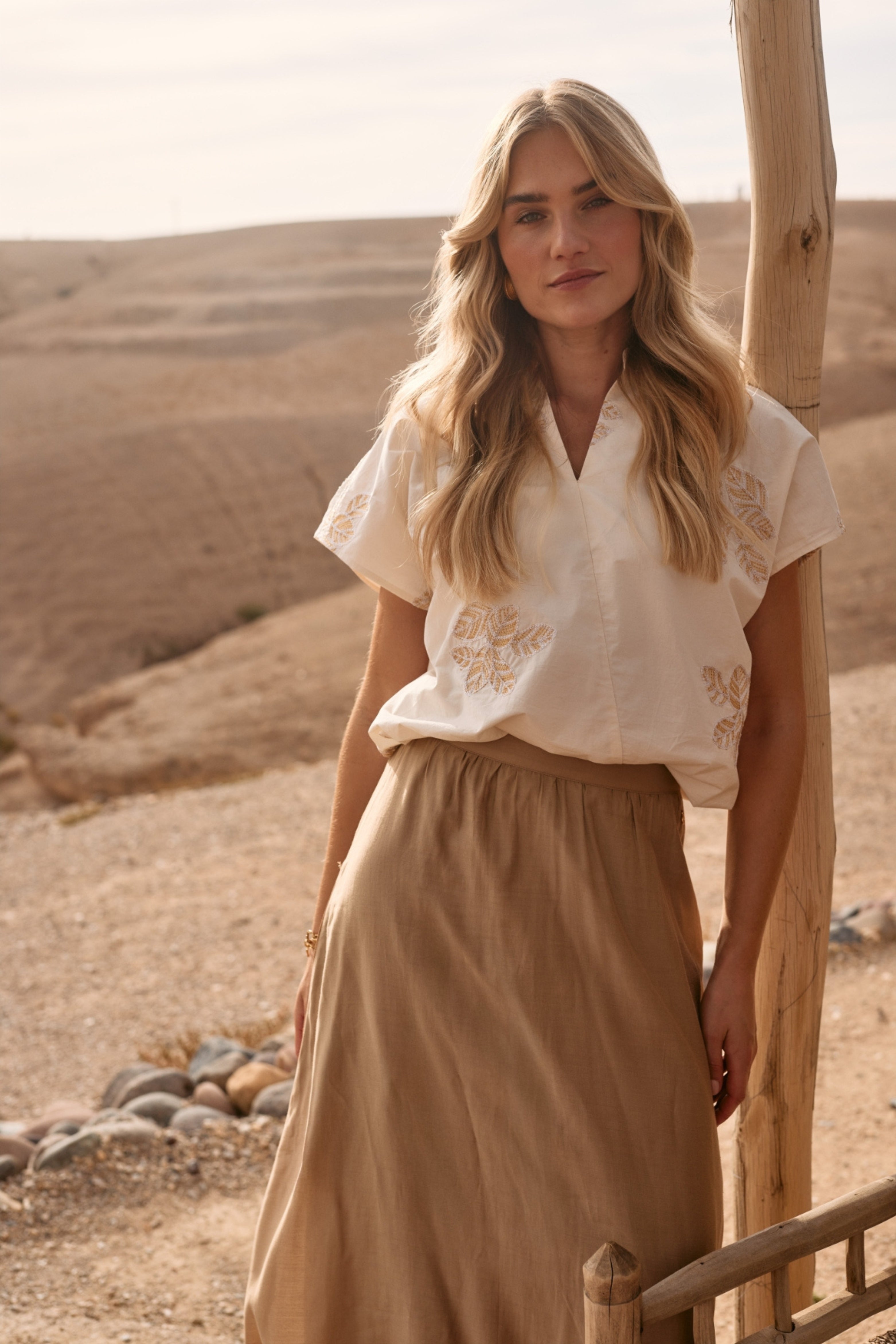 De Nukus Daniek Embroidery Light Sand Top straalt elegantie en verfijning uit met zijn subtiele borduurdetails. De lichte stof en losse pasvorm zorgen voor ultiem draagcomfort. Perfect voor een stijlvolle en moeiteloze look.