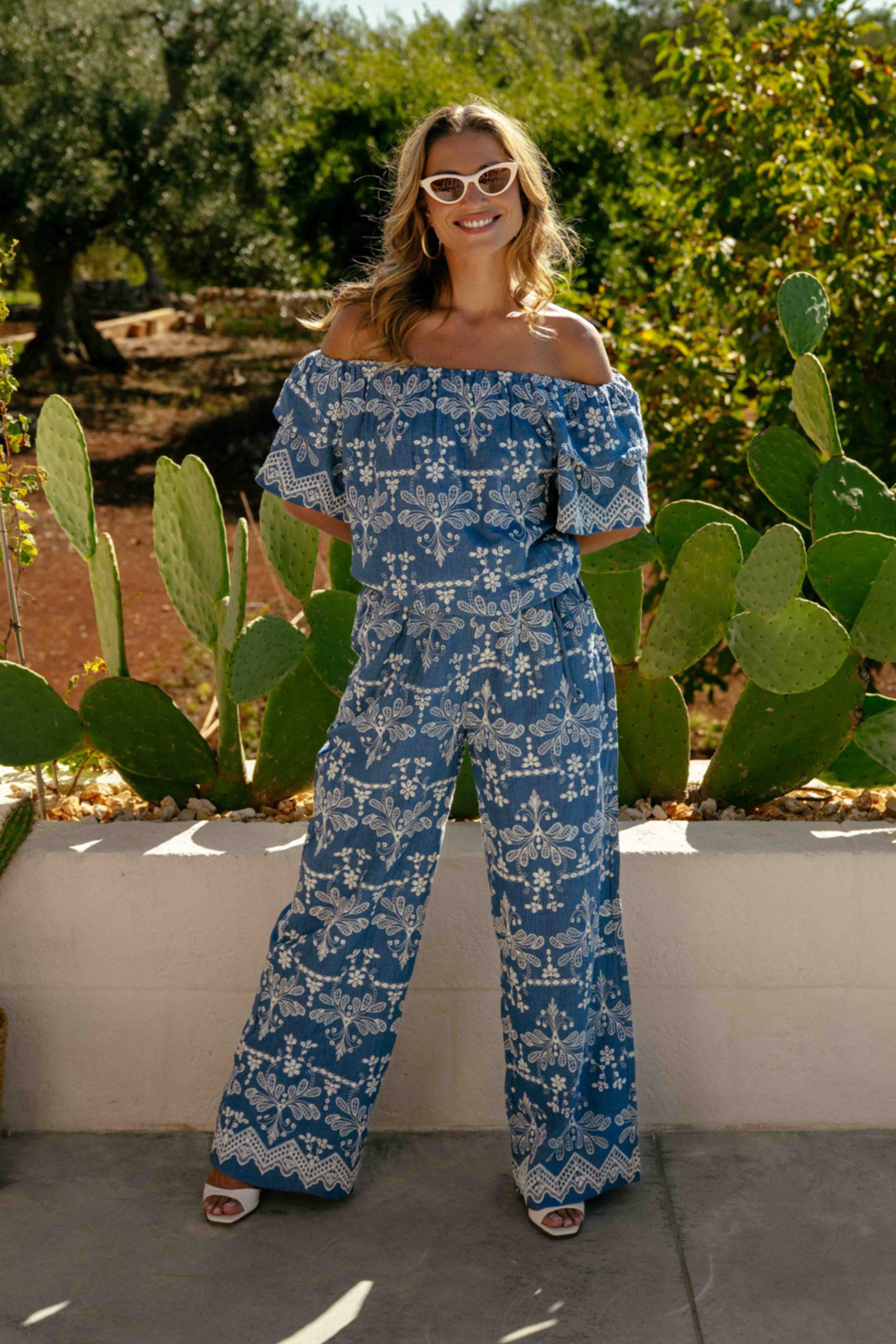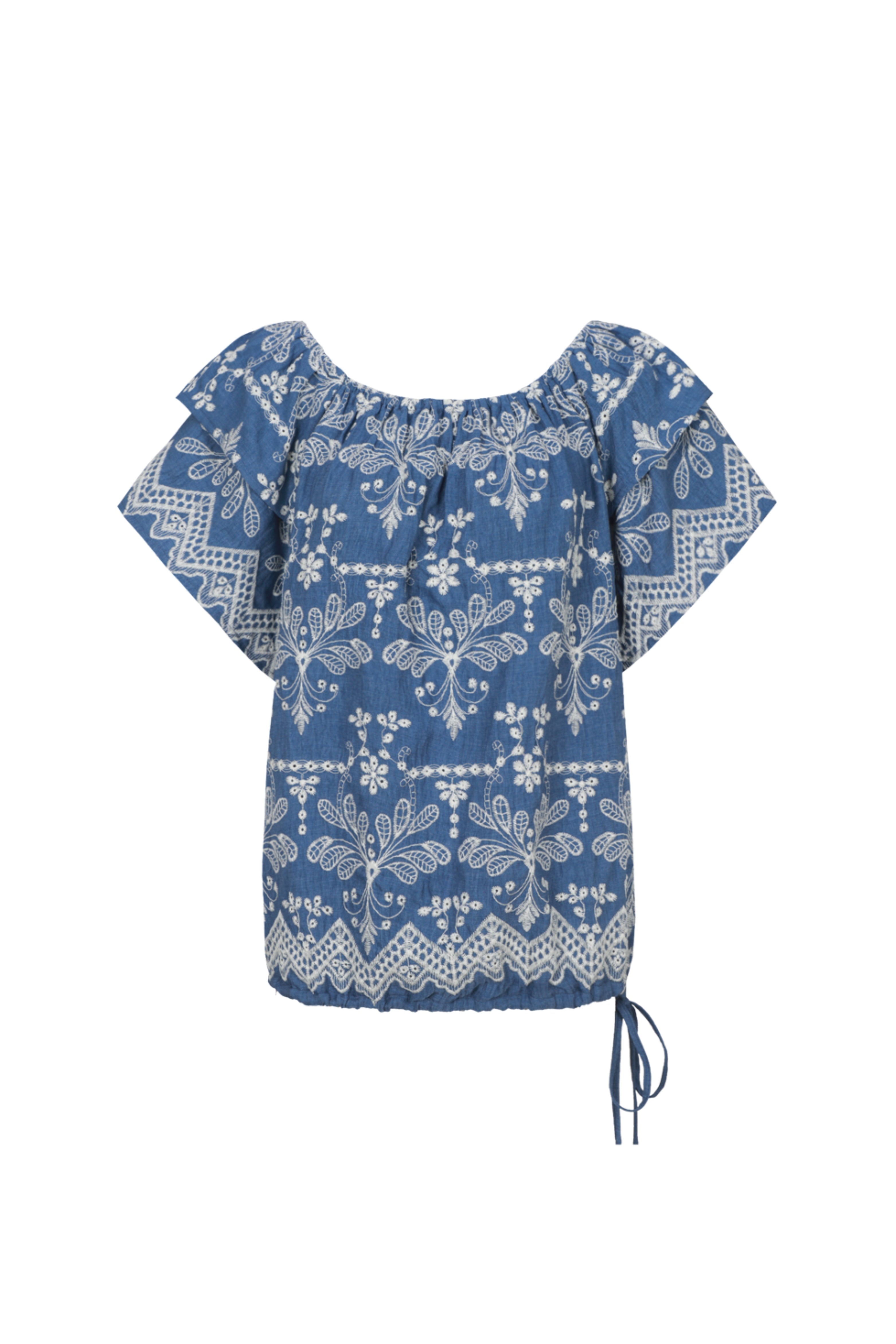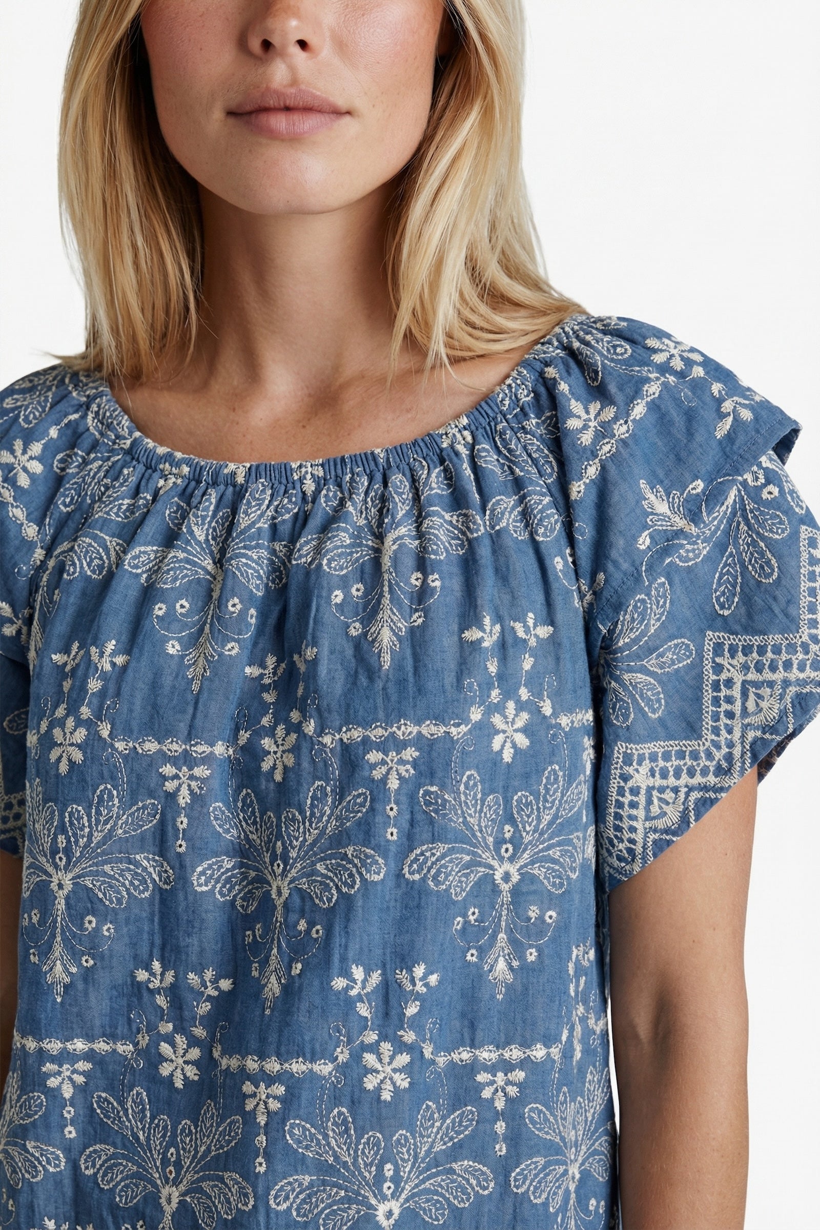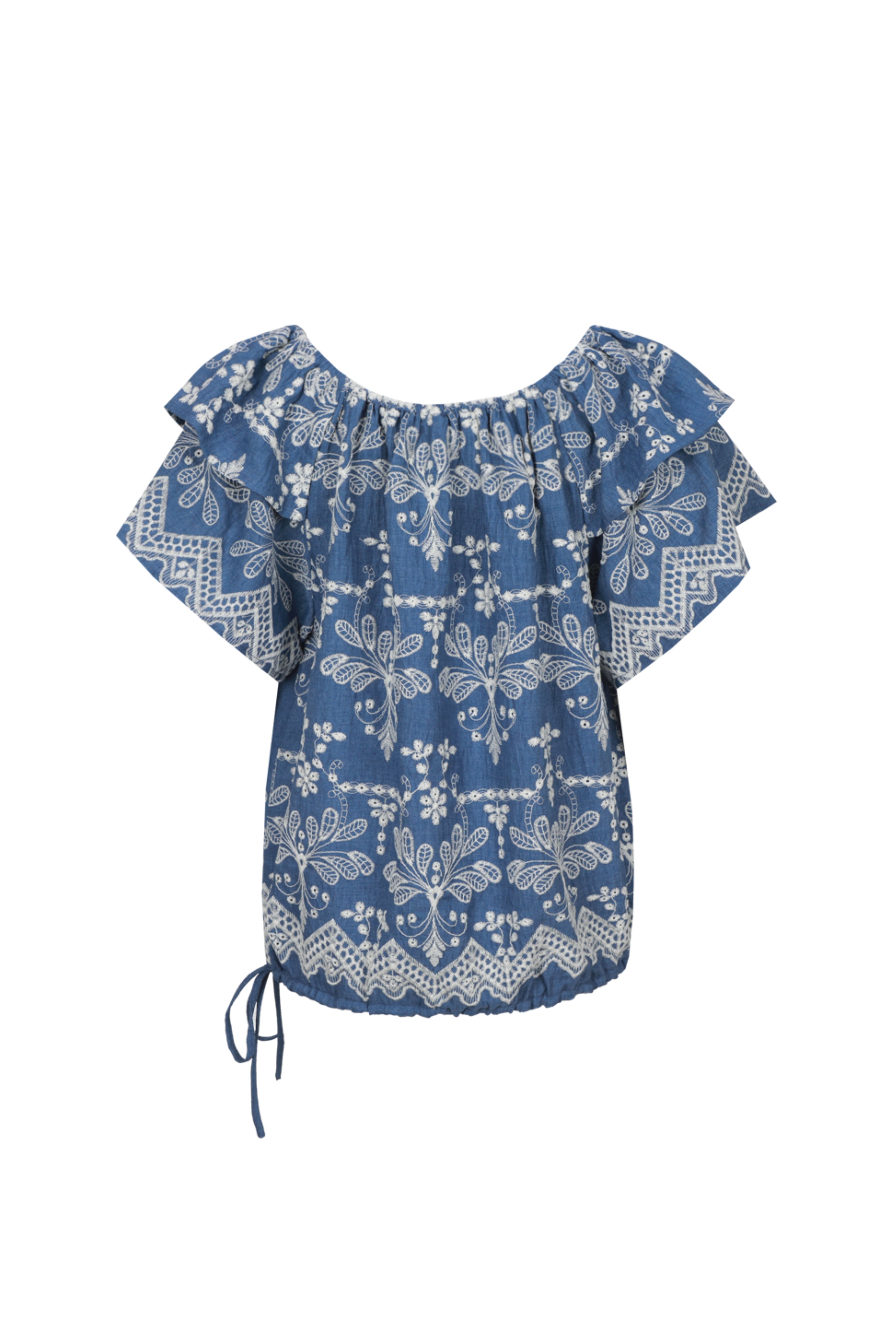 De Top Fallon Denim Mid Blue is een stijlvolle top in een zachte denimblauwe tint met een verfijnd dessin. De wijde halslijn, korte mouwen en strikdetail aan de zijkant geven de top een vrouwelijke en speelse uitstraling.