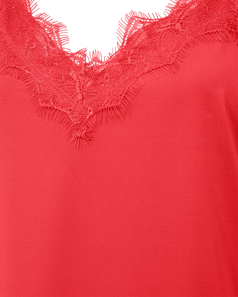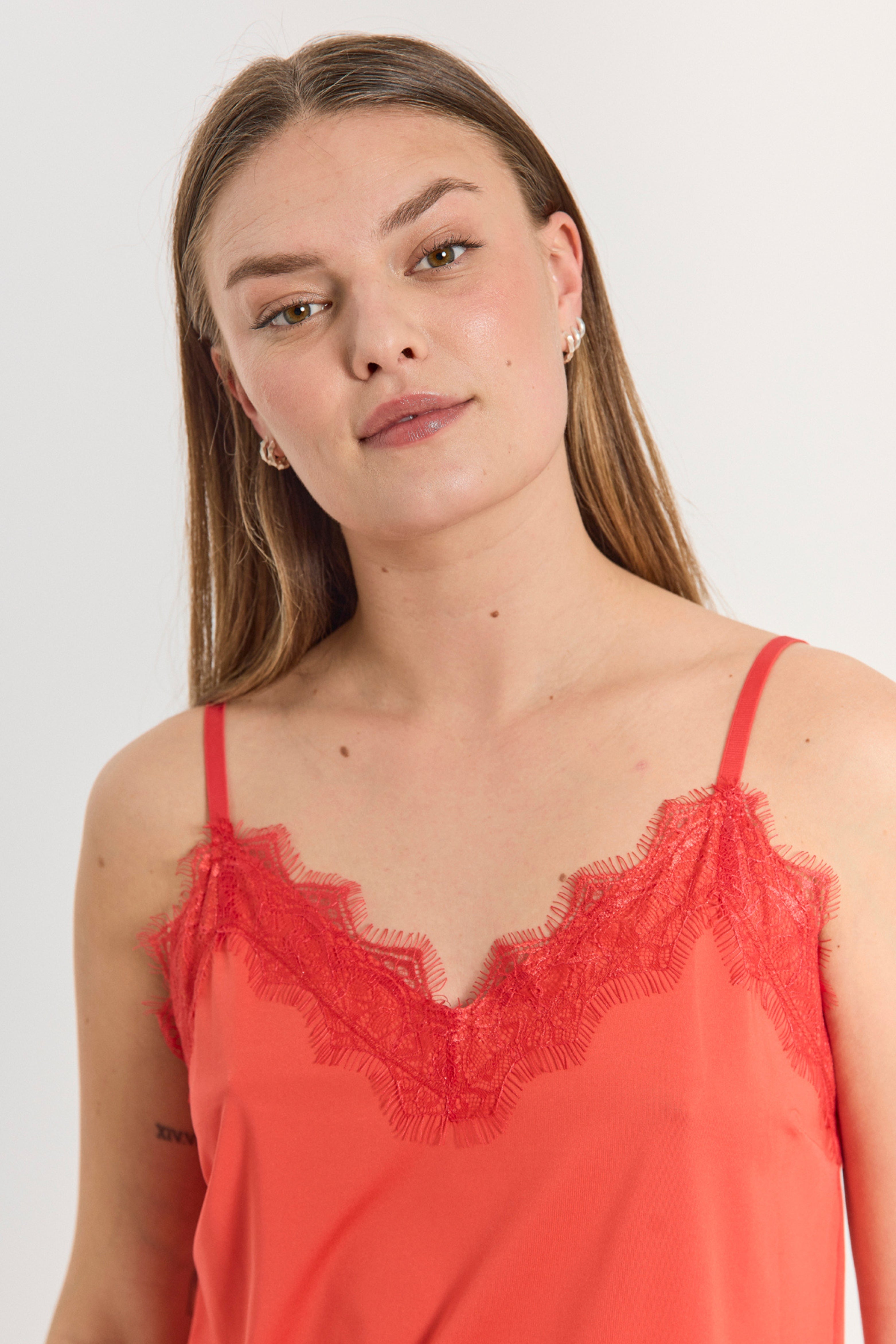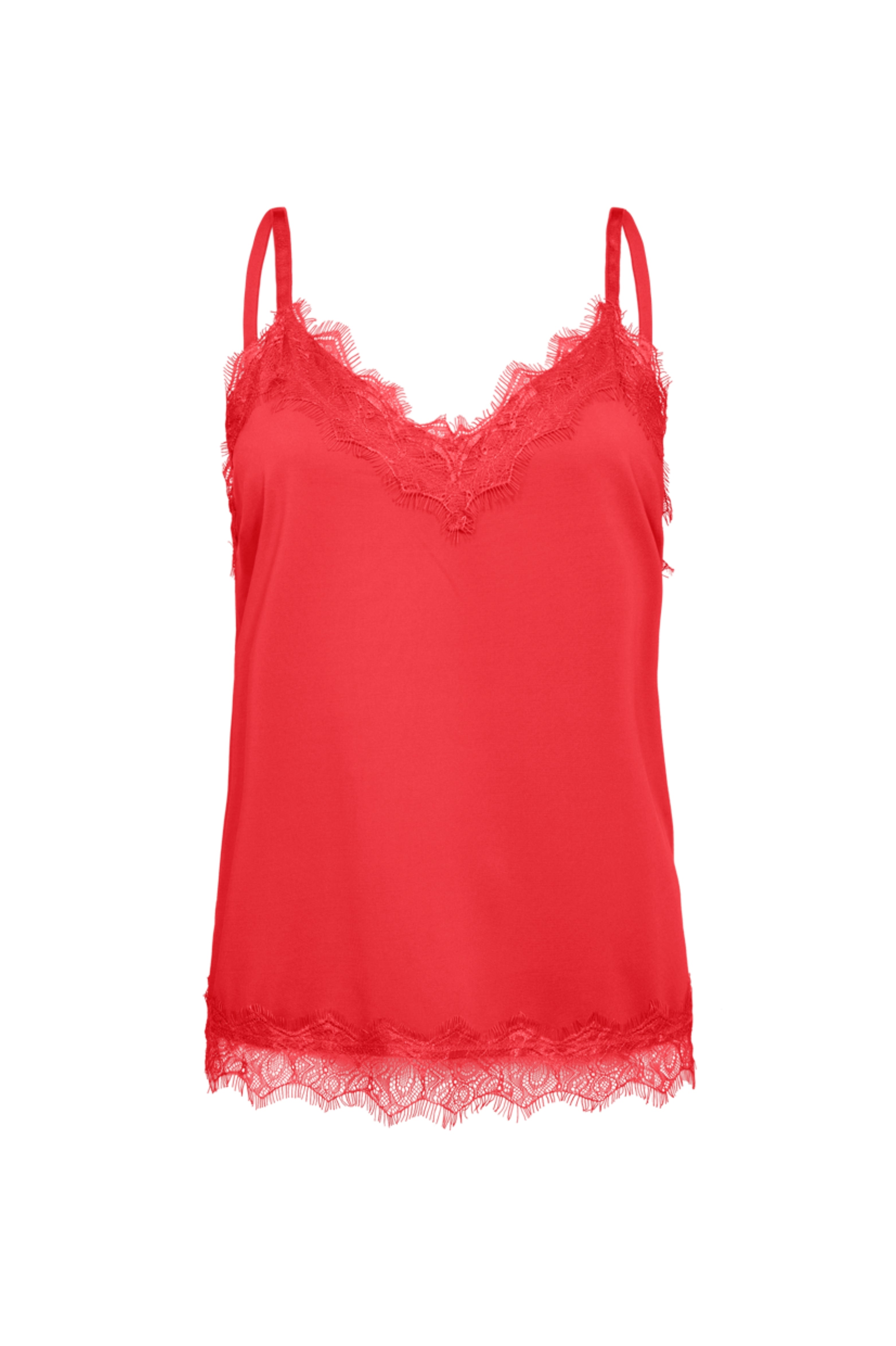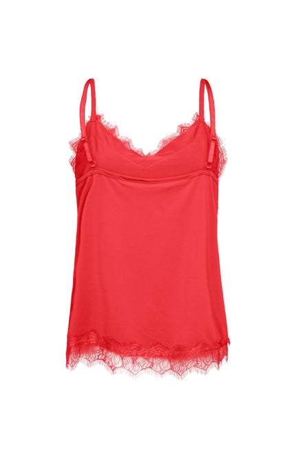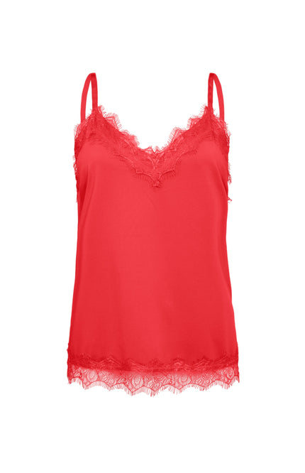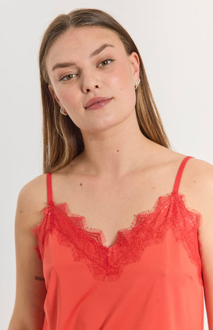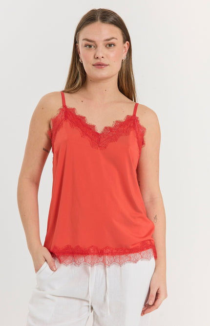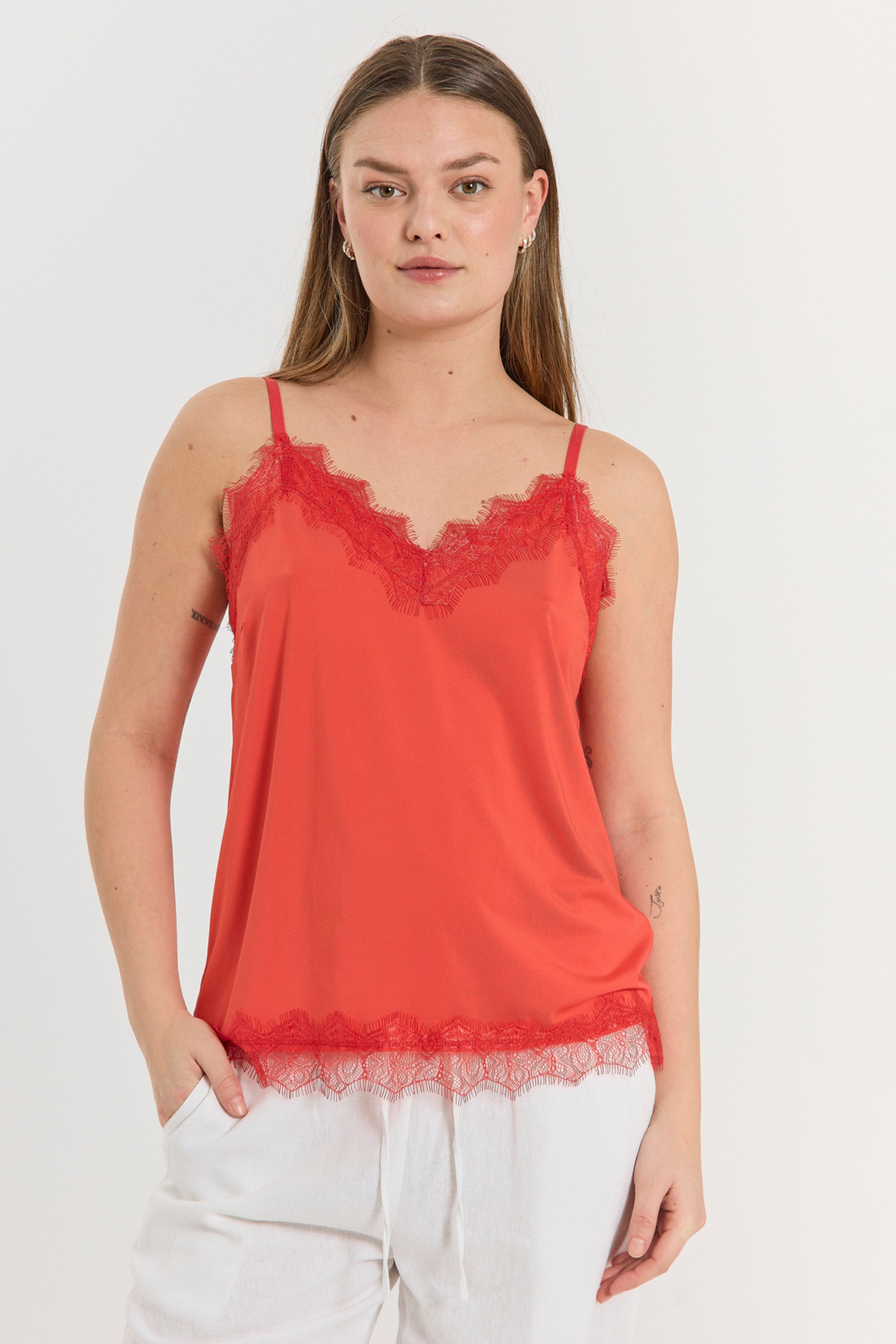 De Top Fqbicco Bittersweet van Freequent is een elegante cami met verfijnde kanten details langs de halslijn en zoom. Gemaakt van zachte, soepelvallende stof met verstelbare bandjes voor de perfecte pasvorm.
