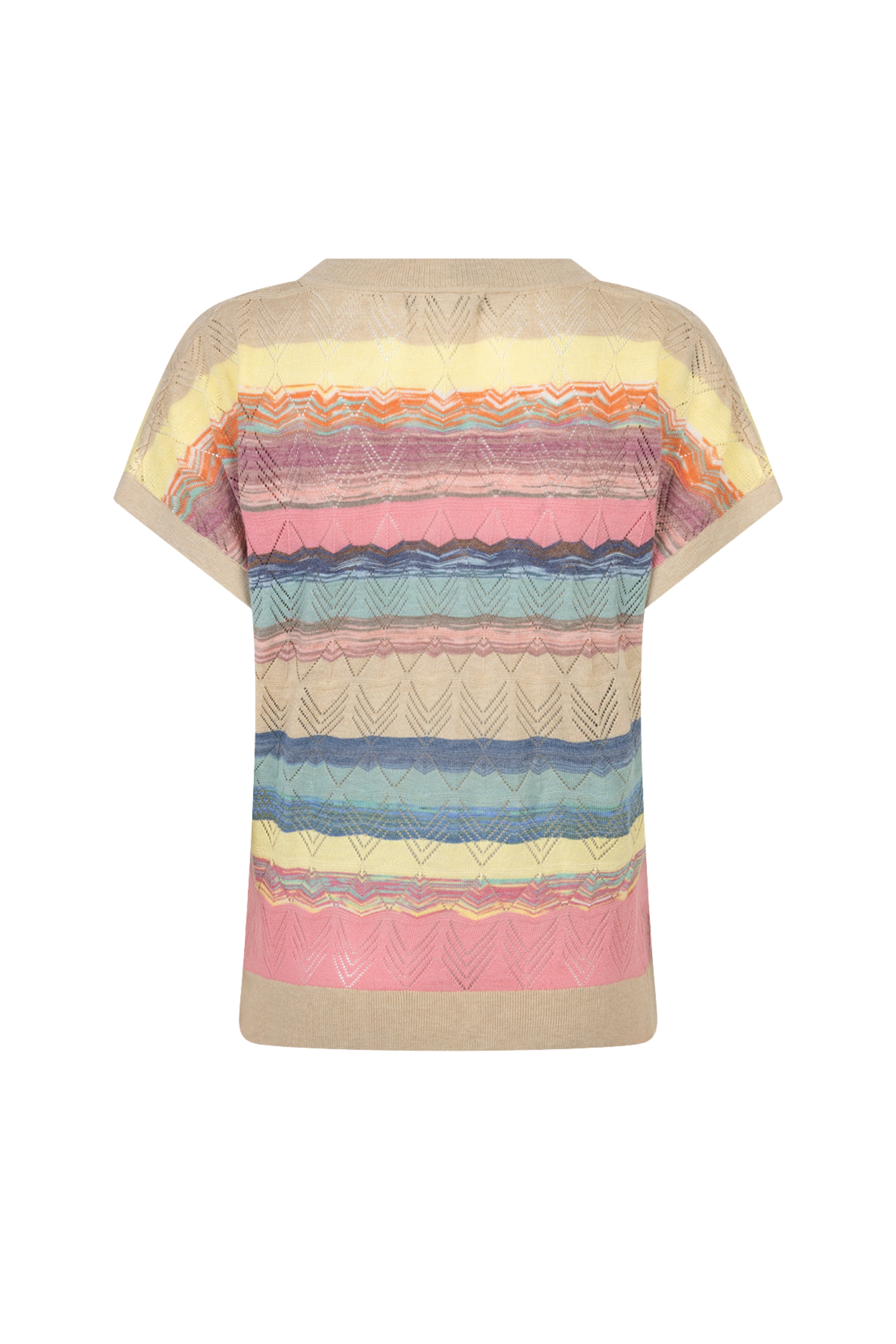 De Top Jerry Multi Stripe van Red Button is een kleurrijke knit top met een speels streeppatroon en subtiele ajourdetails. De zachte kwaliteit en korte mouwen maken dit item perfect voor een zomerse look.