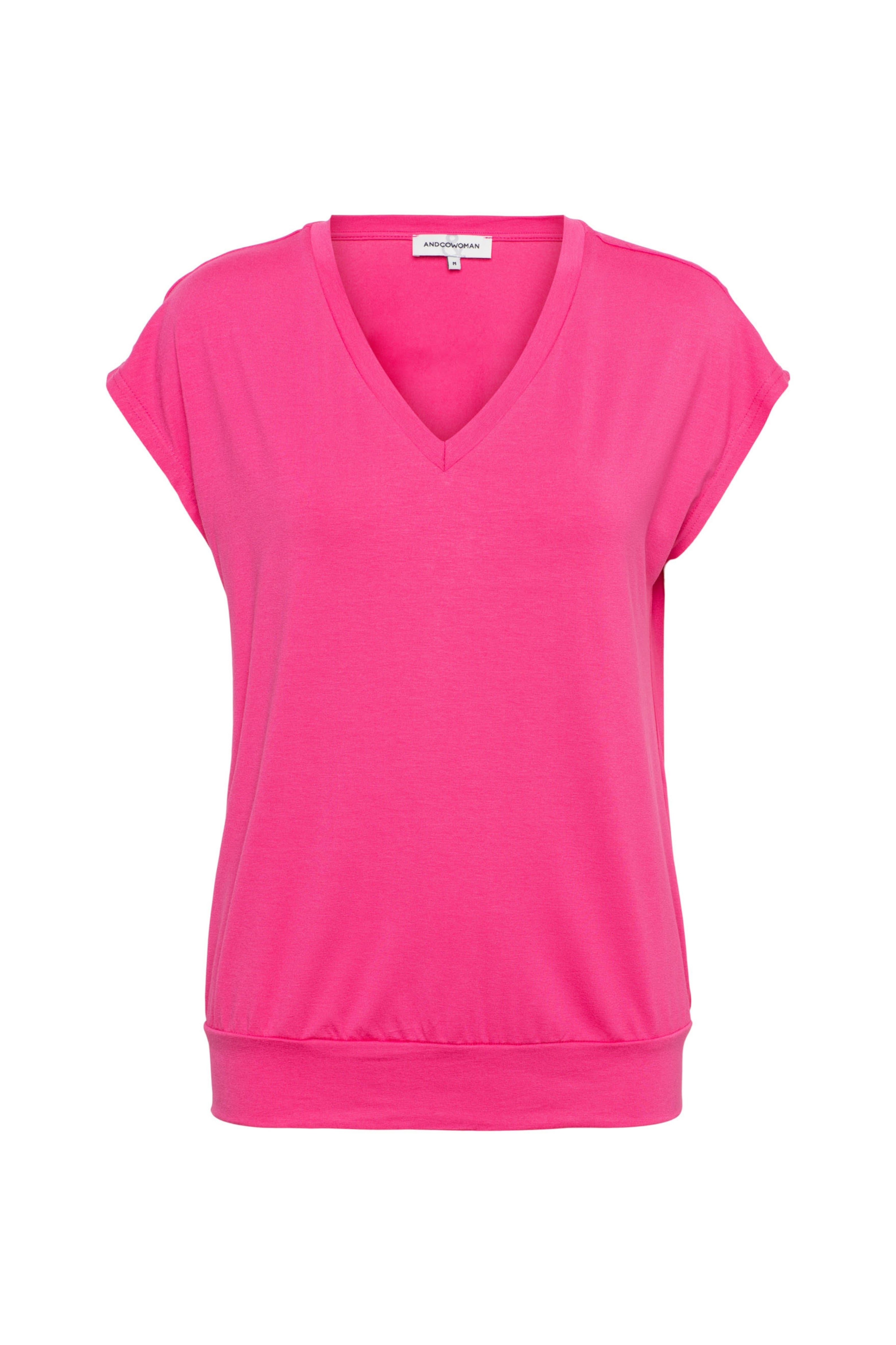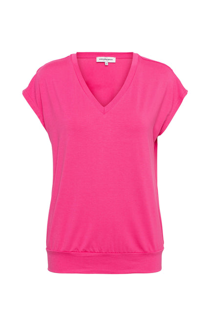 De Top Lucia Bright Pink TO280 van &Co Woman straalt rust en stijl uit. Met een zachte stof, een elegante V-hals en luchtige korte mouwen biedt deze top een perfecte mix van comfort en veelzijdigheid voor elke outfit.