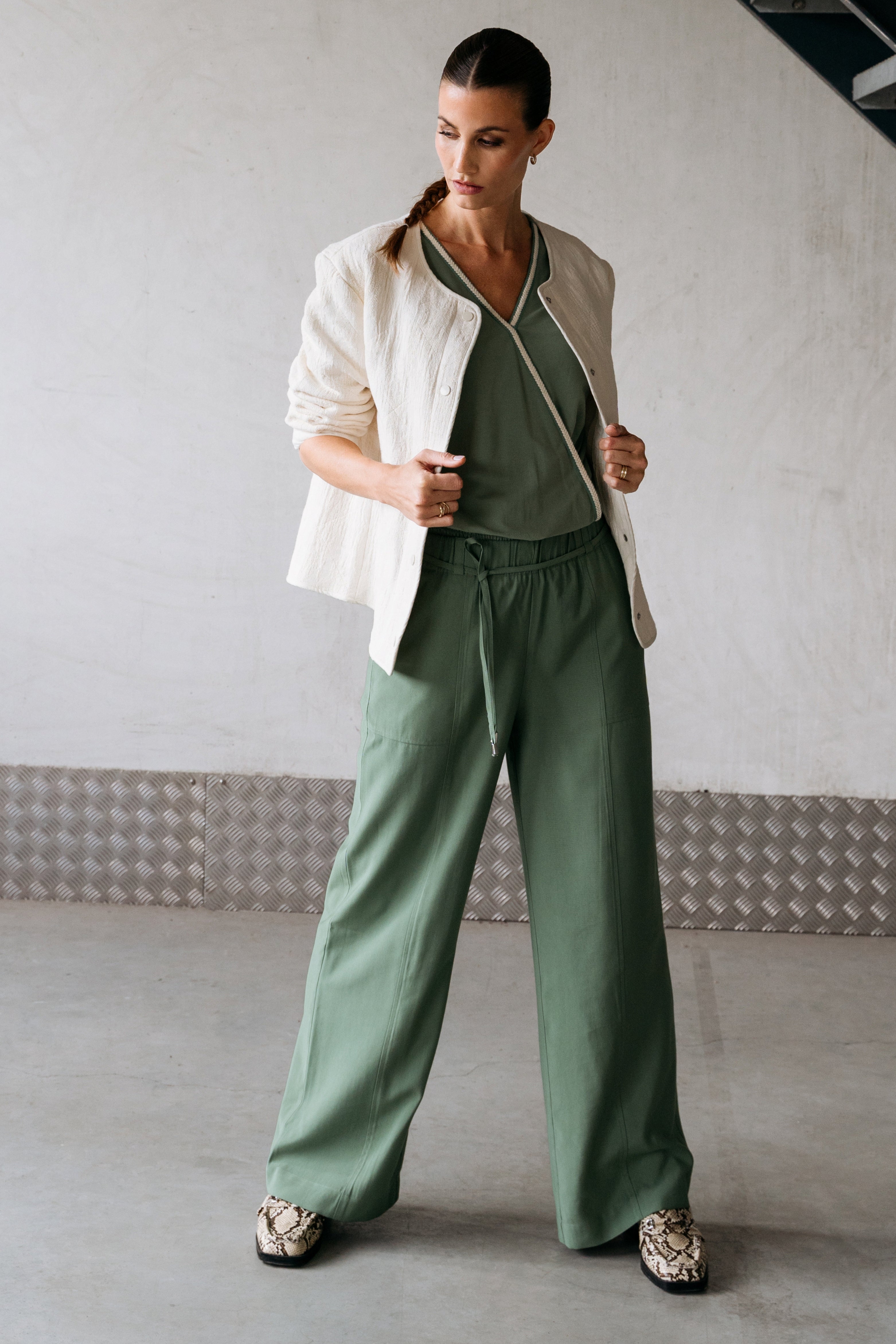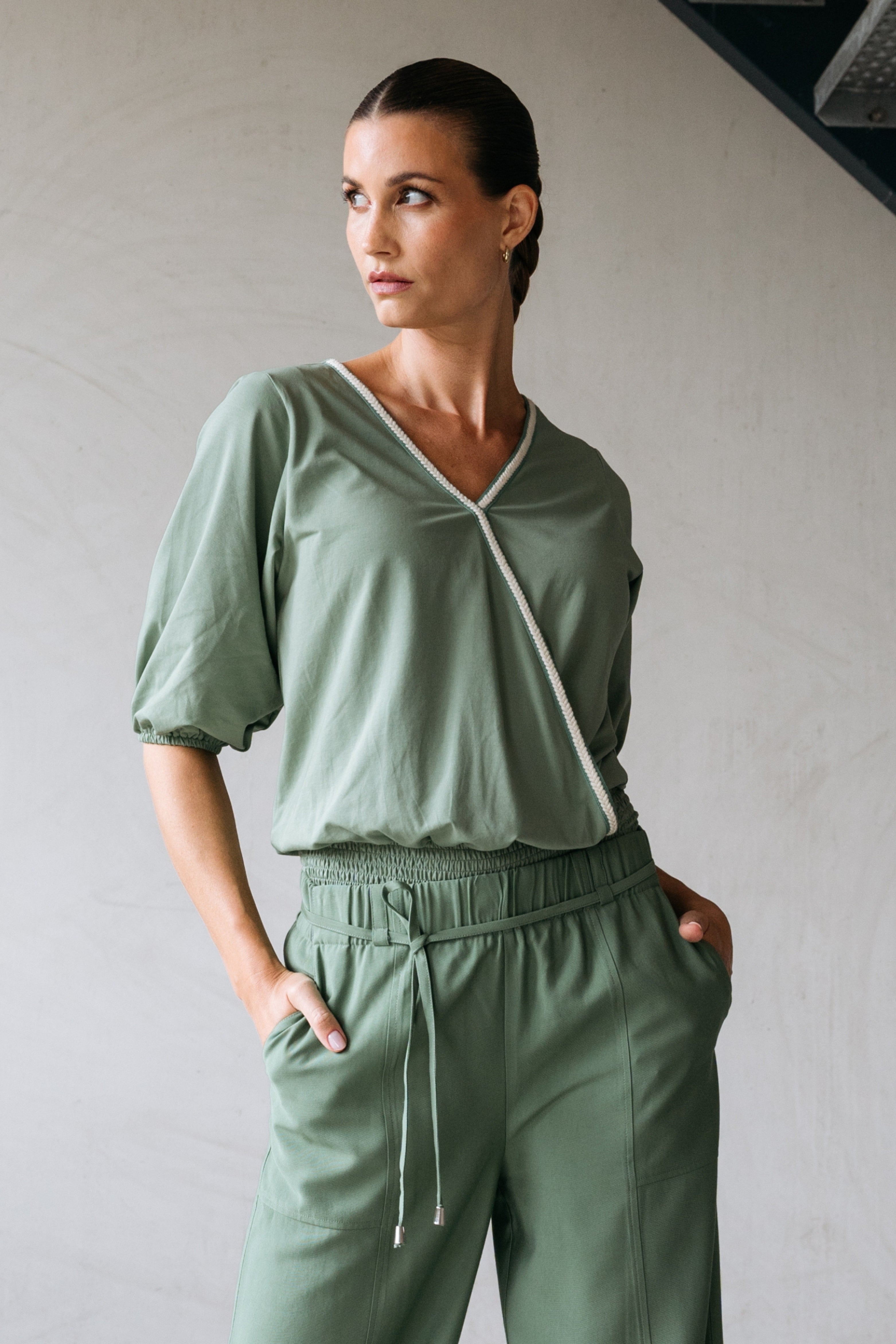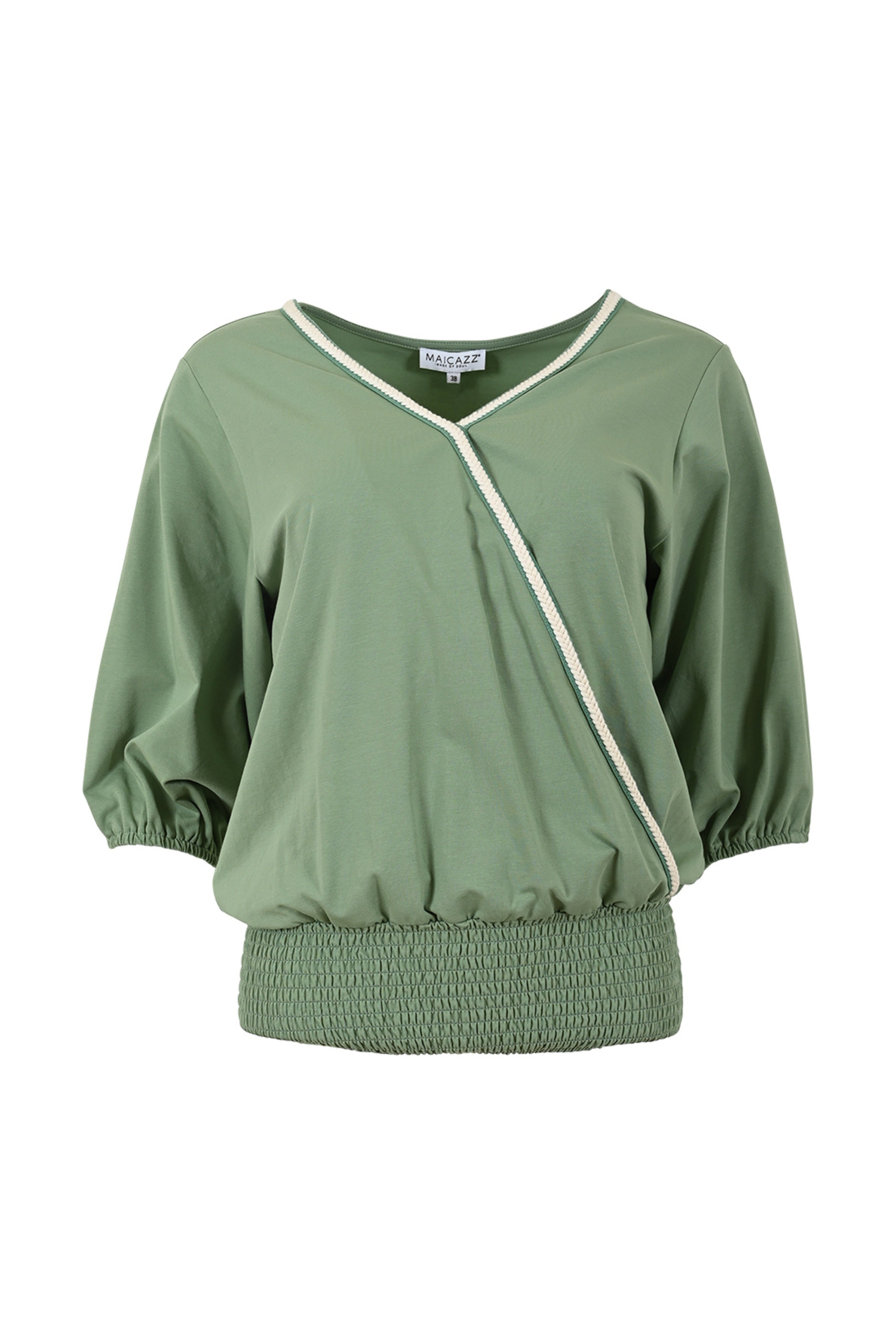 De Top Maya Aquatic van Maicazz heeft een elegante overslag met contrasterende bies. De top heeft een elastische tailleband en driekwart pofmouwen voor een speelse, comfortabele pasvorm. Perfect voor een trendy casual look!