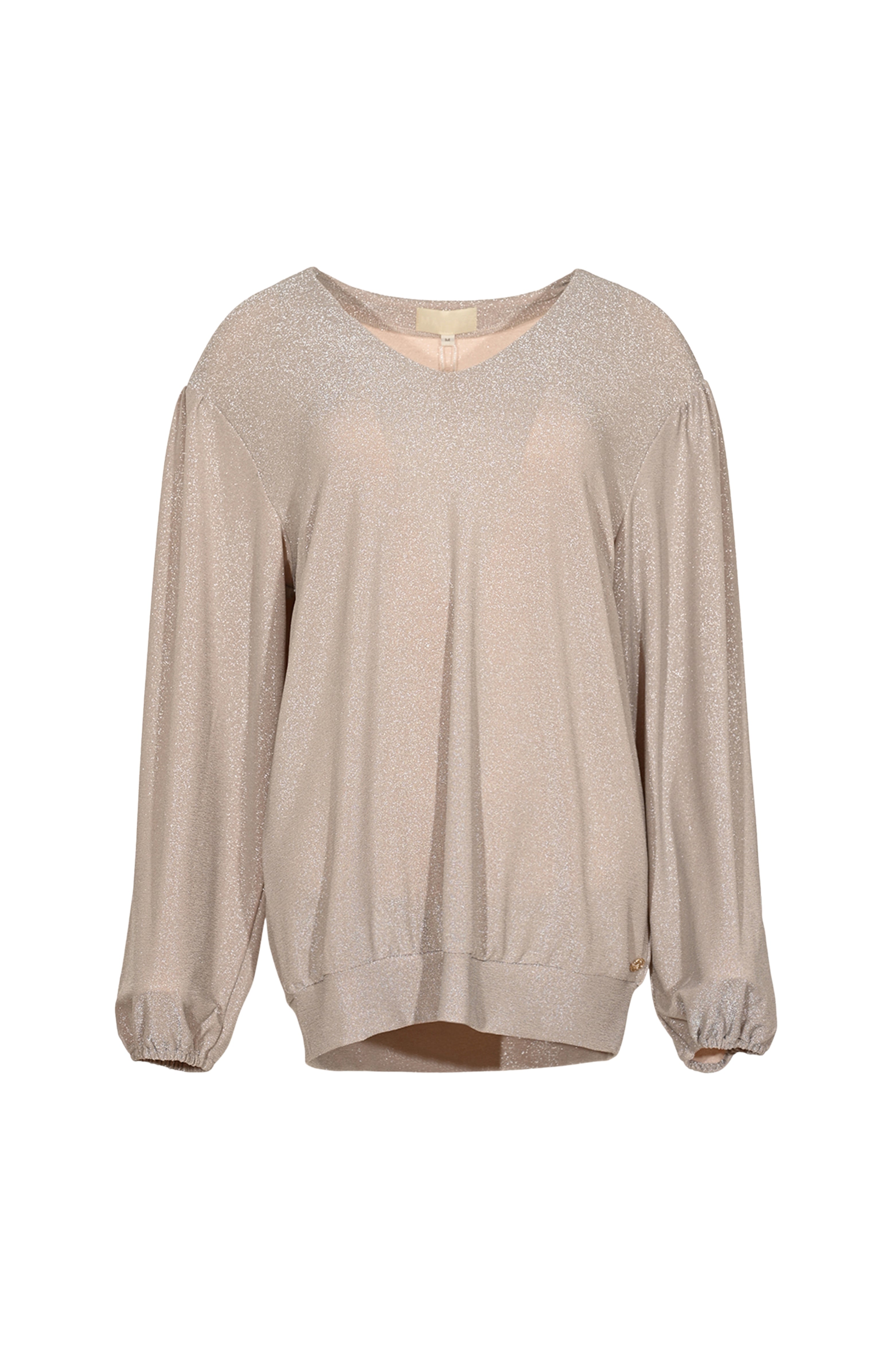 De Top Meeda Mellow Rose van Maicazz is een feestelijke top met hoge ronde hals. De glanzende metallic stof en elastische zoom creëren een vrouwelijke, blousende look. Perfect voor feestjes en diners.