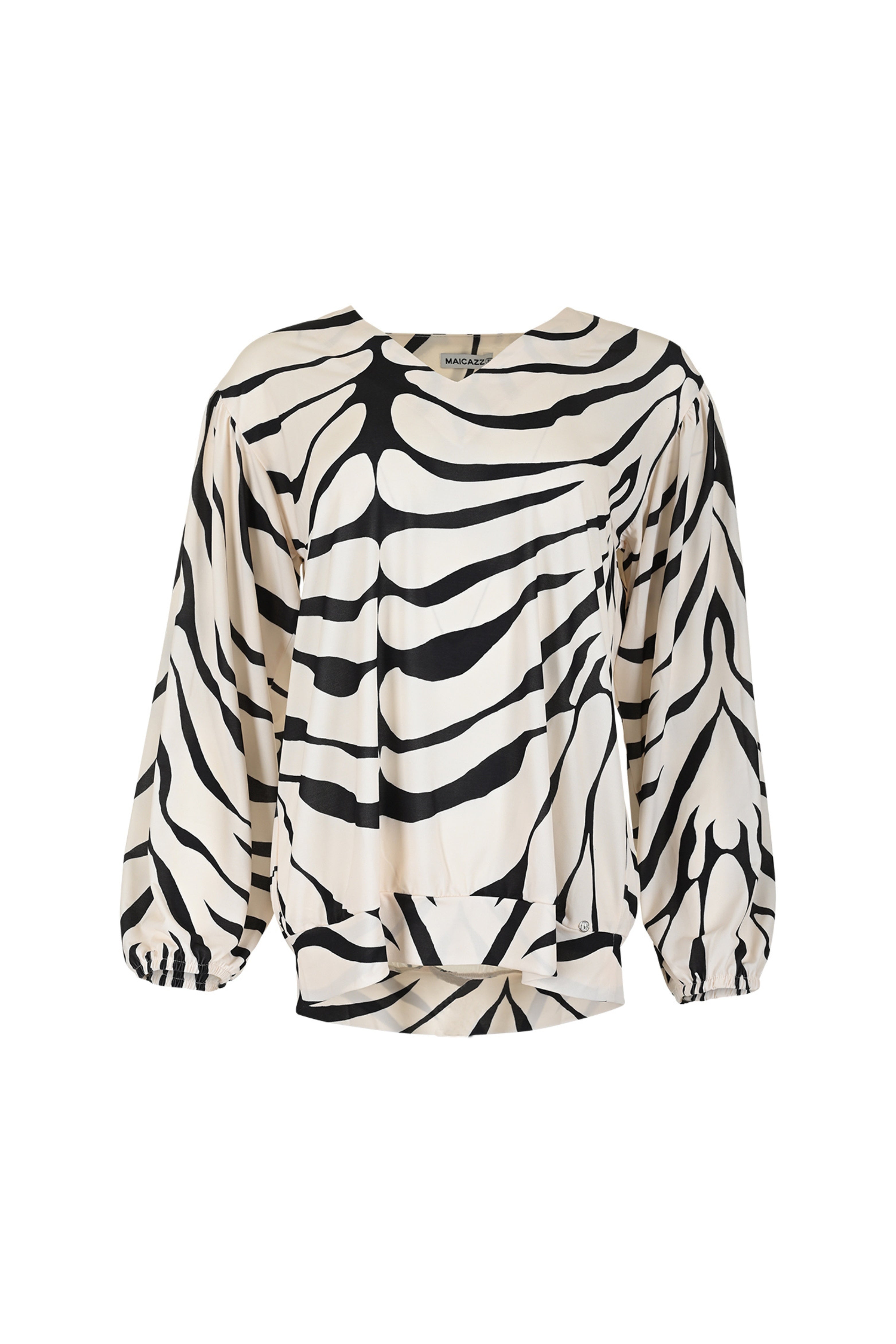 De Meeda Veines top van Maicazz is een echte eyecatcher met haar speelse zebraprint. De luchtige pasvorm, ballonmouwen en elastische zoom zorgen voor comfort én stijl. Perfect voor een trendy voorjaarslook met flair.