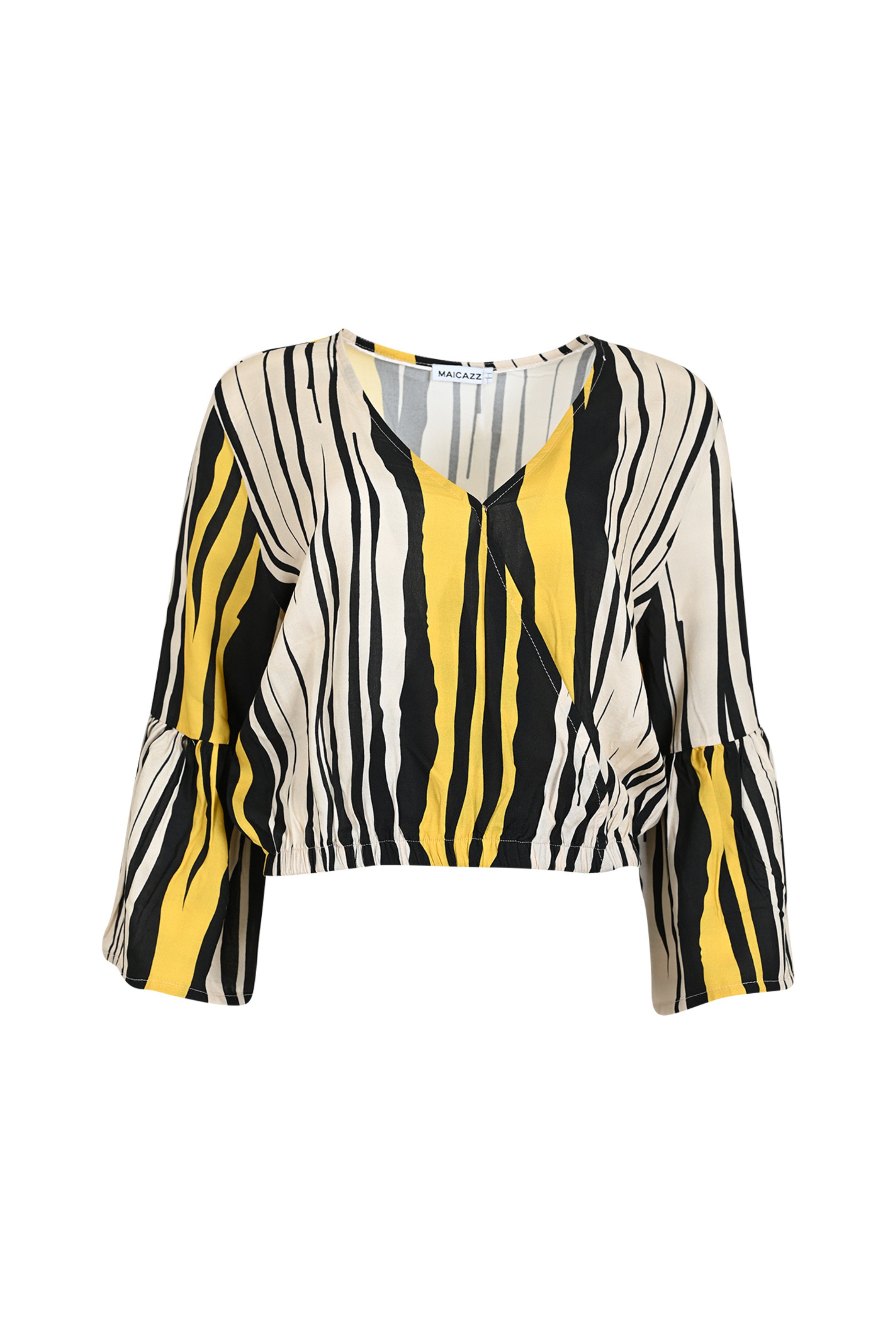 De Top Ninthe Stripe Solar van Maicazz is een luchtige cropped top met opvallende streepprint. De V-hals, wijd uitlopende mouwen en elastische zoom geven het item een speelse, zomerse uitstraling.