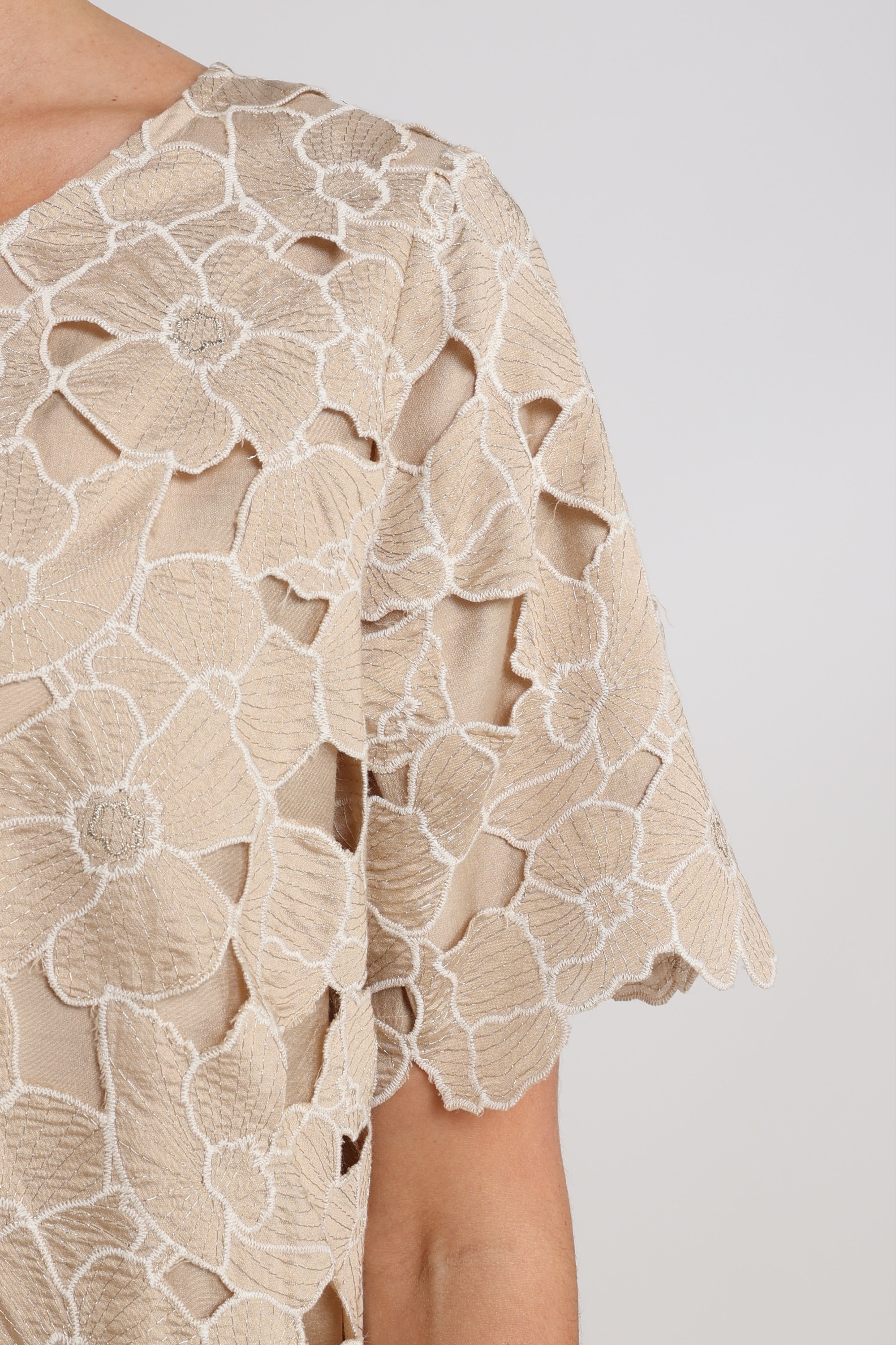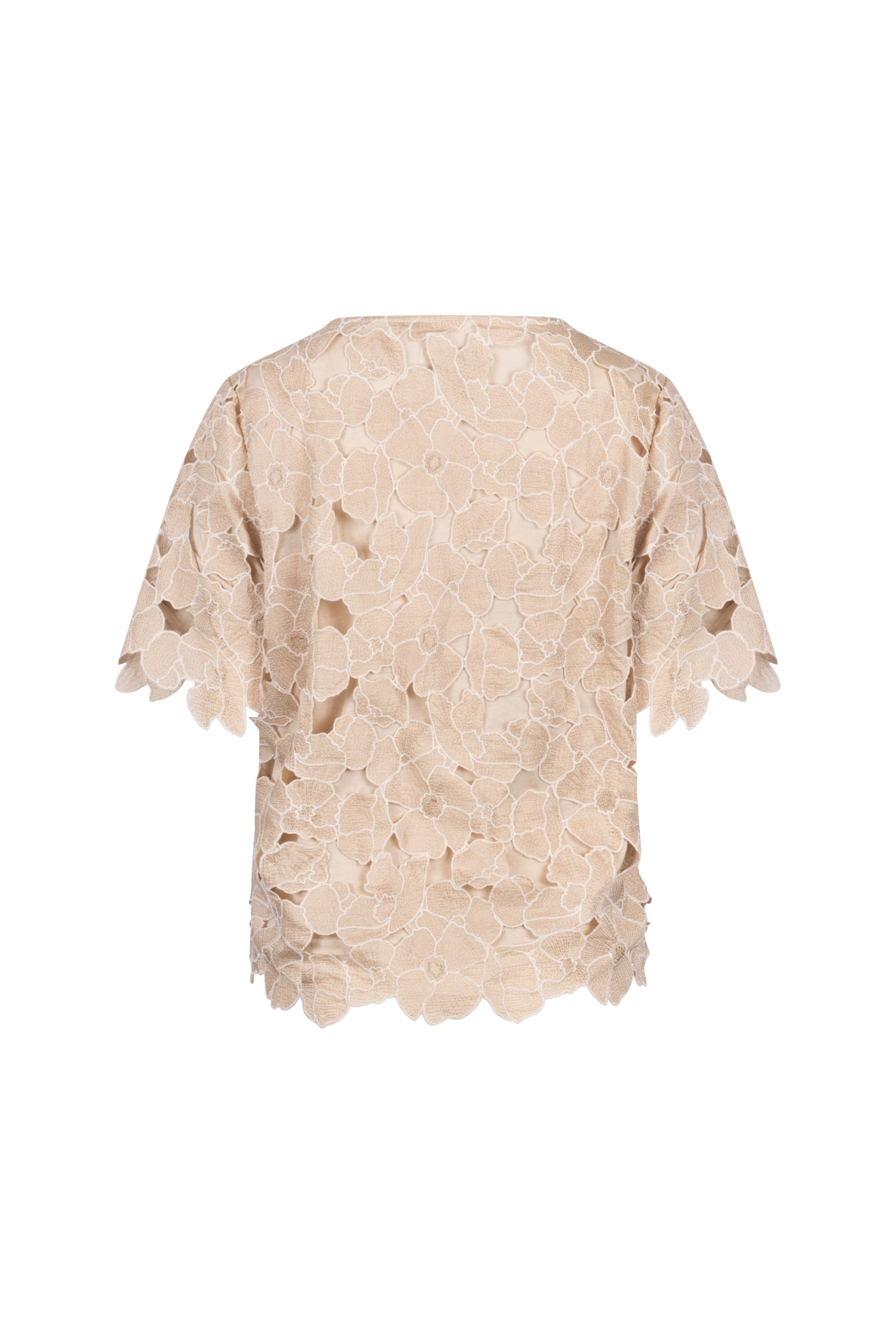 De Top Octavia Flower Sand Gold van Nukus is een verfijnde eyecatcher met een luxe bloemenstructuur. Het opengewerkte dessin en de zachte glans geven deze top een elegante uitstraling terwijl de rechte pasvorm en korte mouwen zorgen voor een comfortabele en vrouwelijke look.