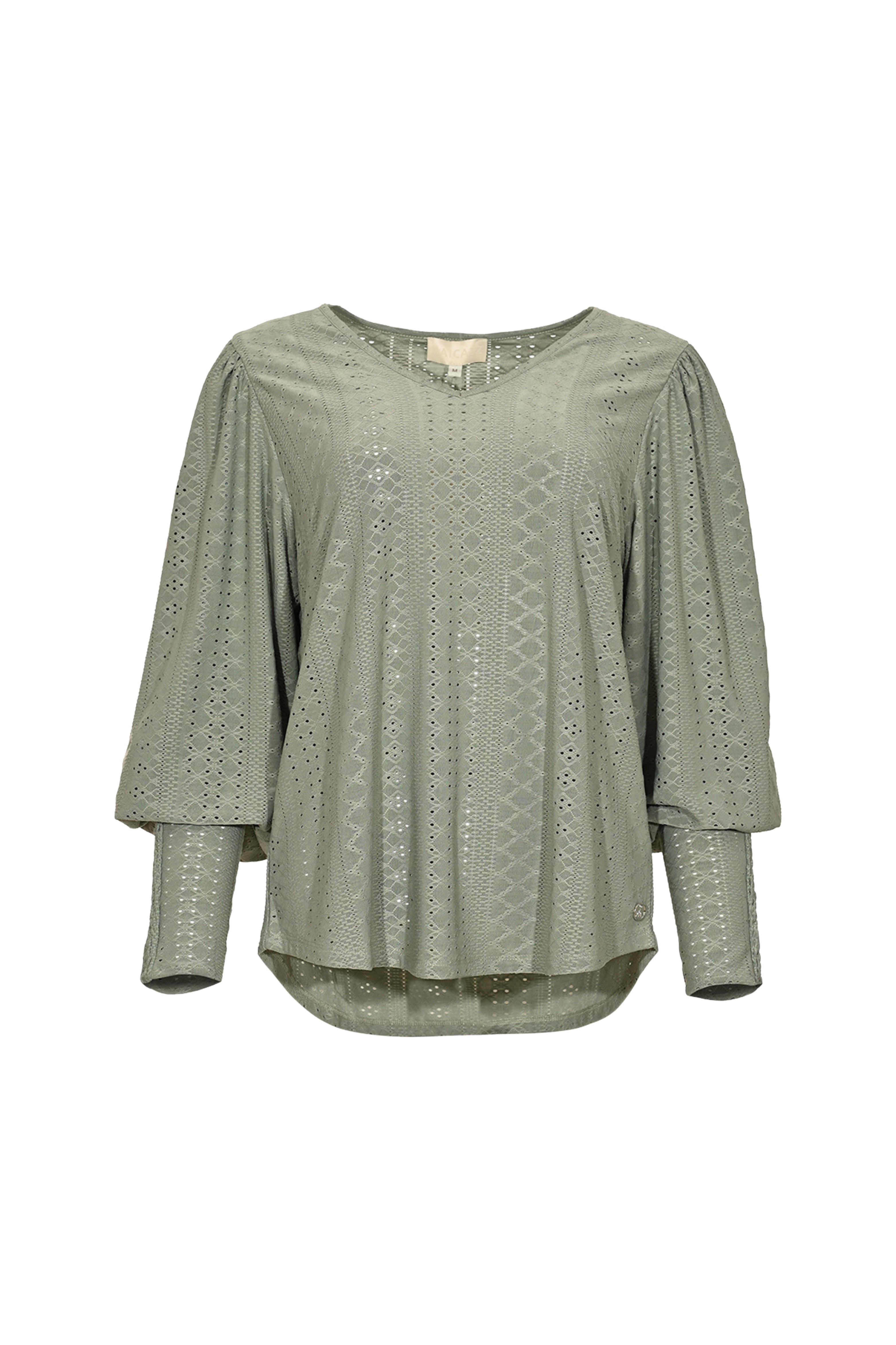 De Top Phoebe Green Smoke van Maicazz is een vrouwelijke top met V-hals. De ajourstof met grafisch patroon en wijde mouwen geeft een luchtige, elegante look. Perfect voor zomerse dagen of een stijlvolle citytrip.