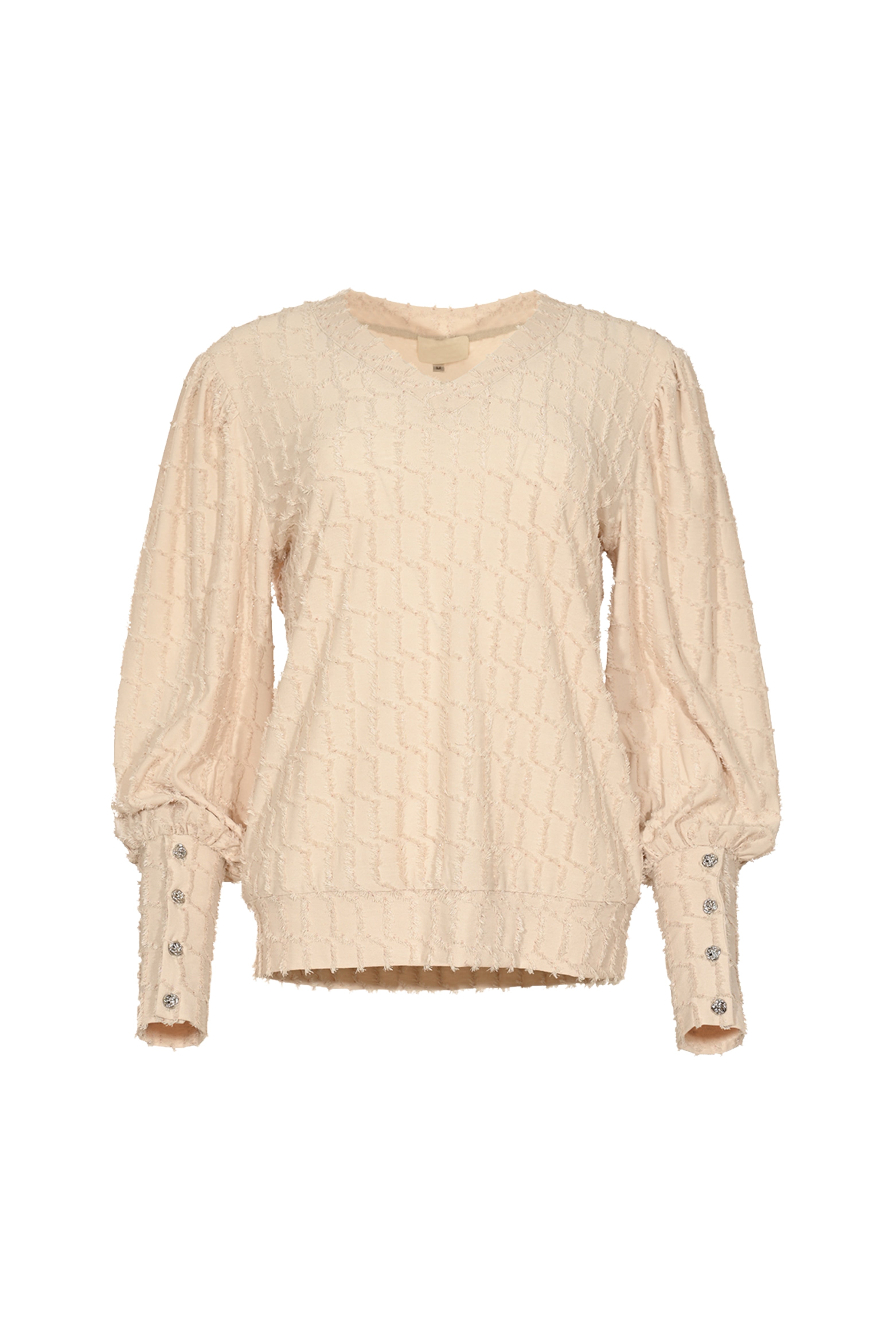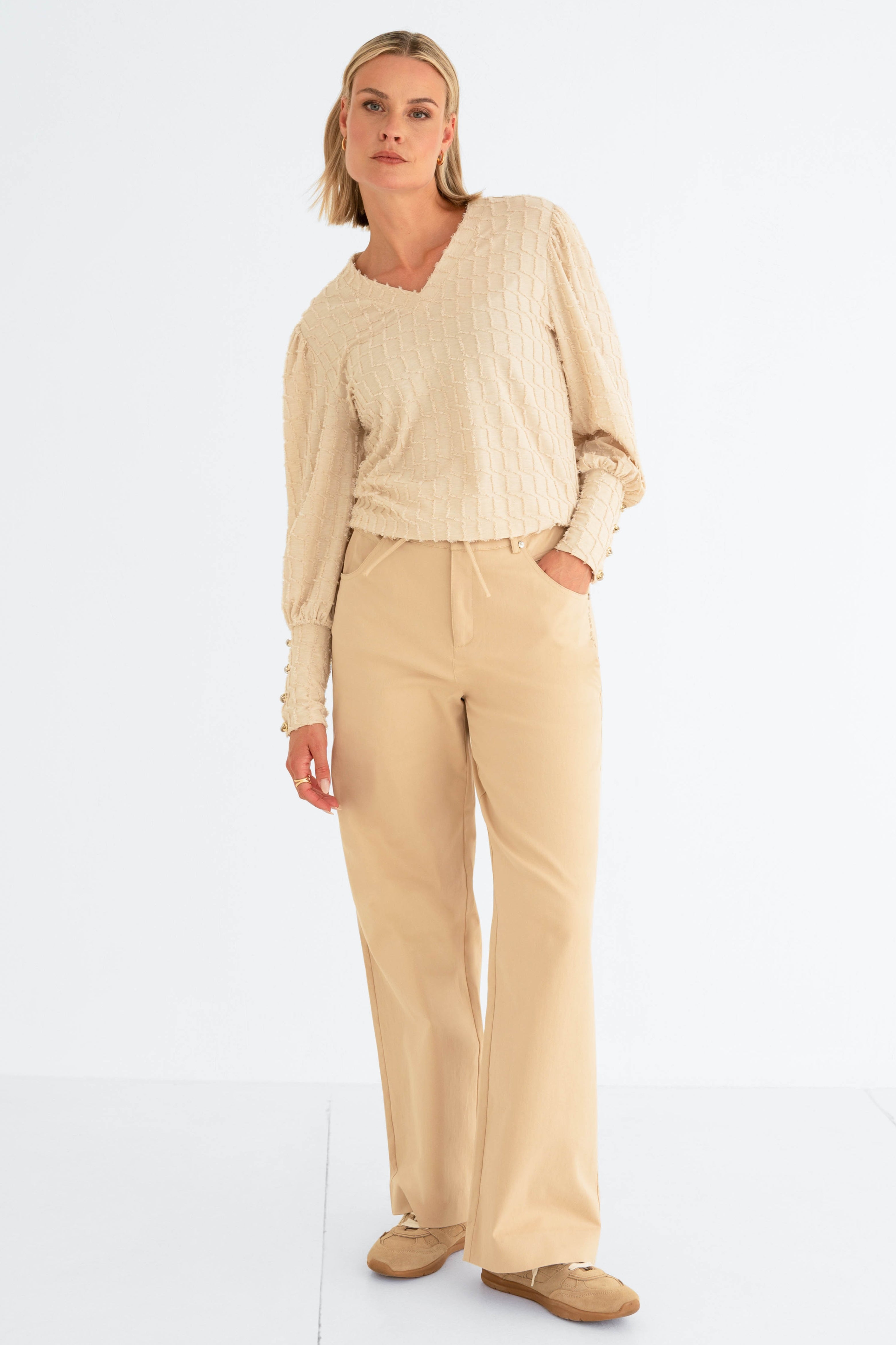 De Top Piece Sand van Maicazz is een elegante top met V-hals. De reliëfstructuur en pofmouwen met sierknopen geven een chique uitstraling. Perfect voor speciale gelegenheden of een stijlvolle werkdag.