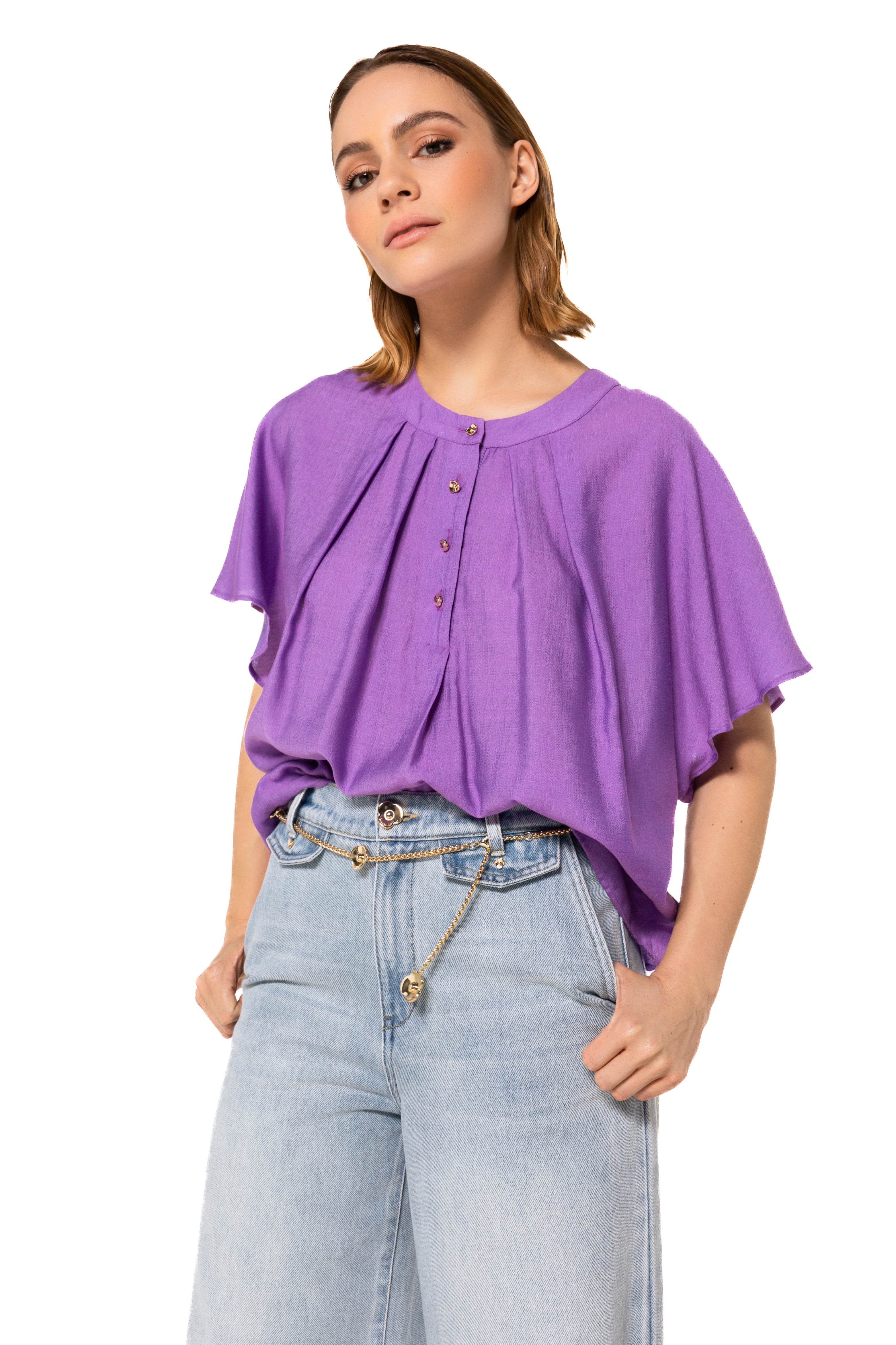 De Top Plooidetail Lavander van Caroline Biss is een vrouwelijke top met ronde hals en korte vlindermouwen. De luchtige geweven stof en sierplooien aan de voorkant geven een elegante, zwierige look. Perfect voor zomerse dagen en vakanties.