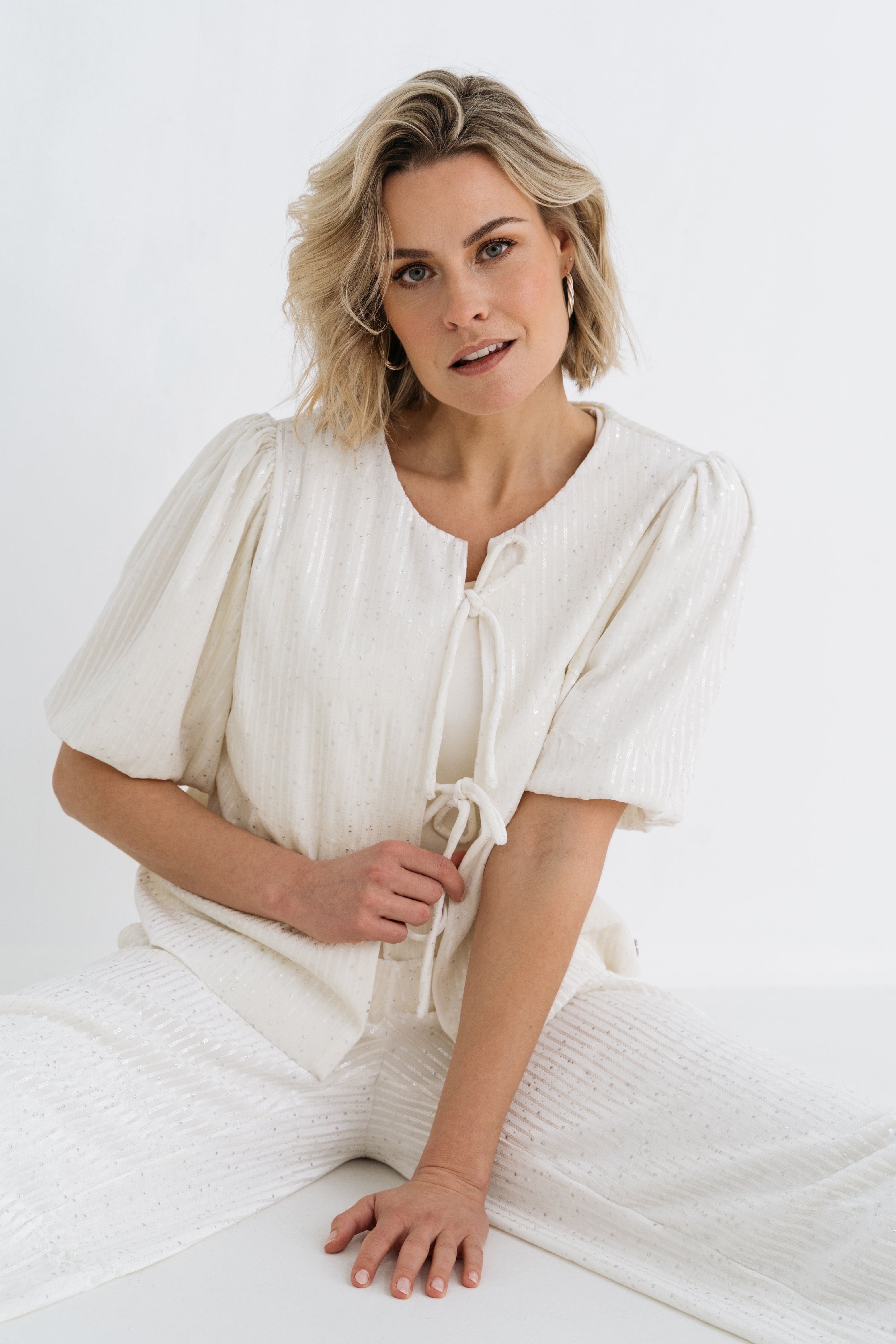 De Priya Crystella top van Maicazz is een absolute eyecatcher. Versierd met subtiele pailletten en een dubbele striksluiting aan de voorzijde, straalt deze top een vrouwelijke elegantie uit. Perfect voor feestelijke gelegenheden of een avond uit.