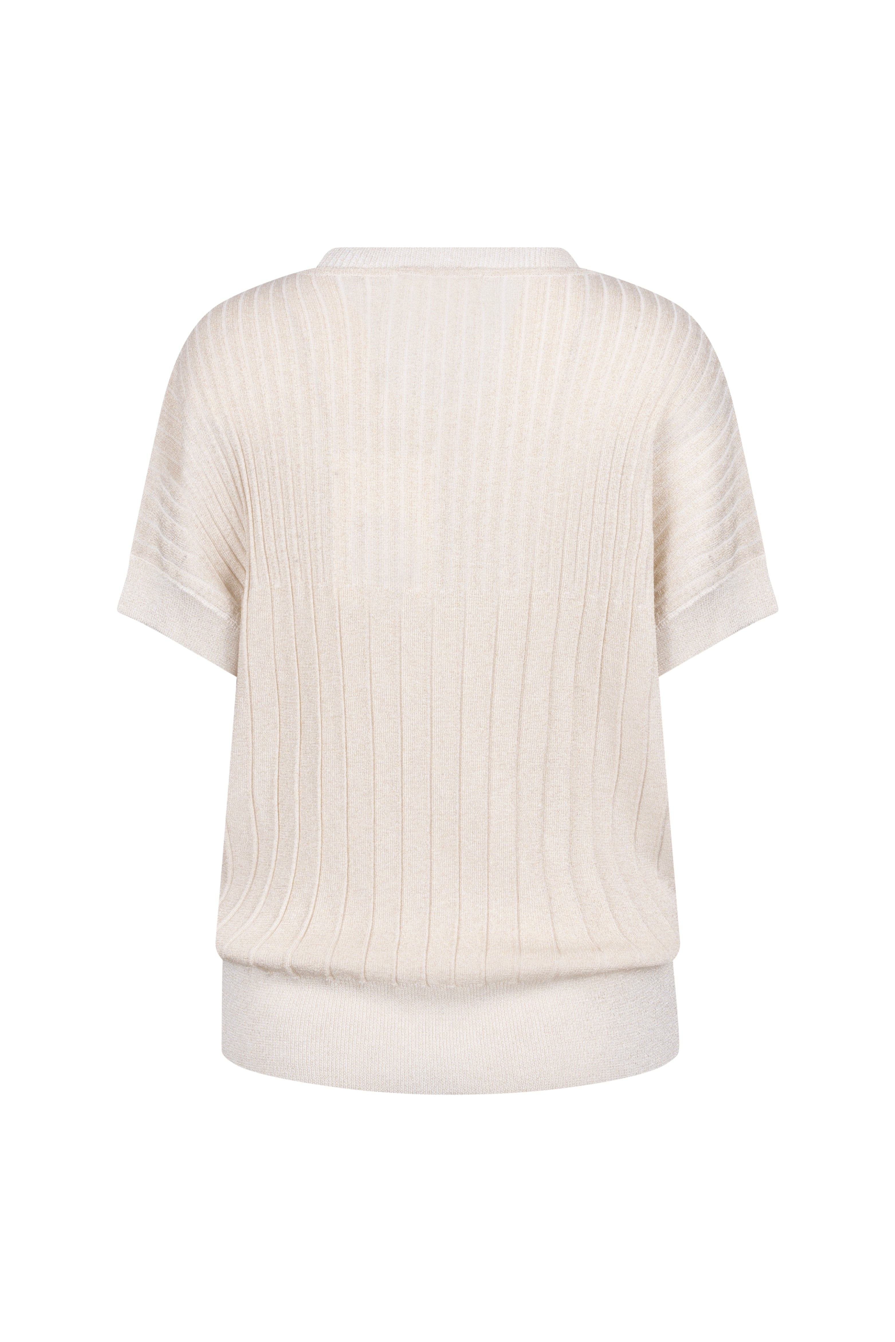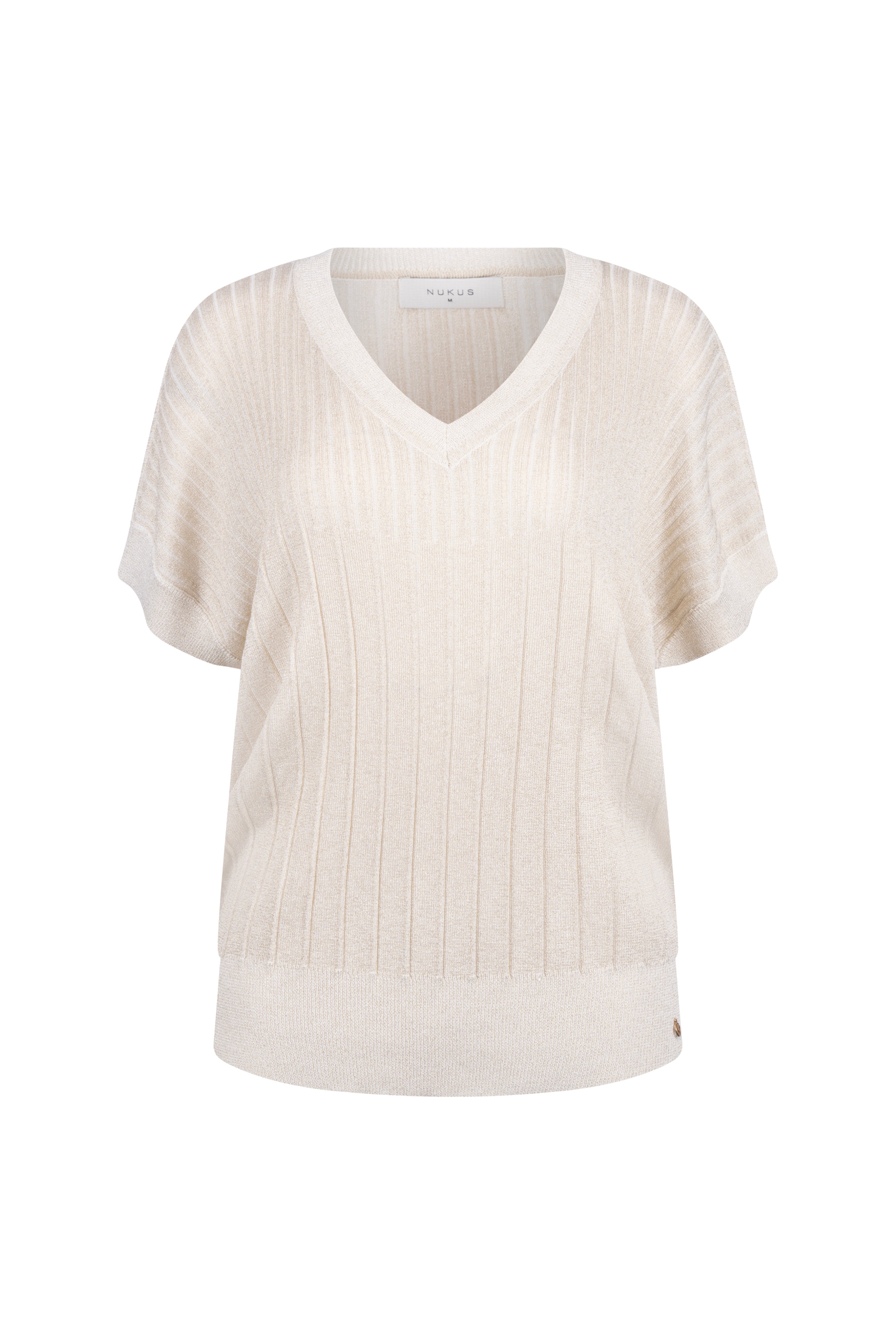 De Top Raya Lurex Sand van Nukus is een elegante gebreide top met V-hals. Het fijne ribbreisel met subtiele glans valt soepel over het figuur. Perfect voor zowel casual looks als een feestelijke gelegenheid.
