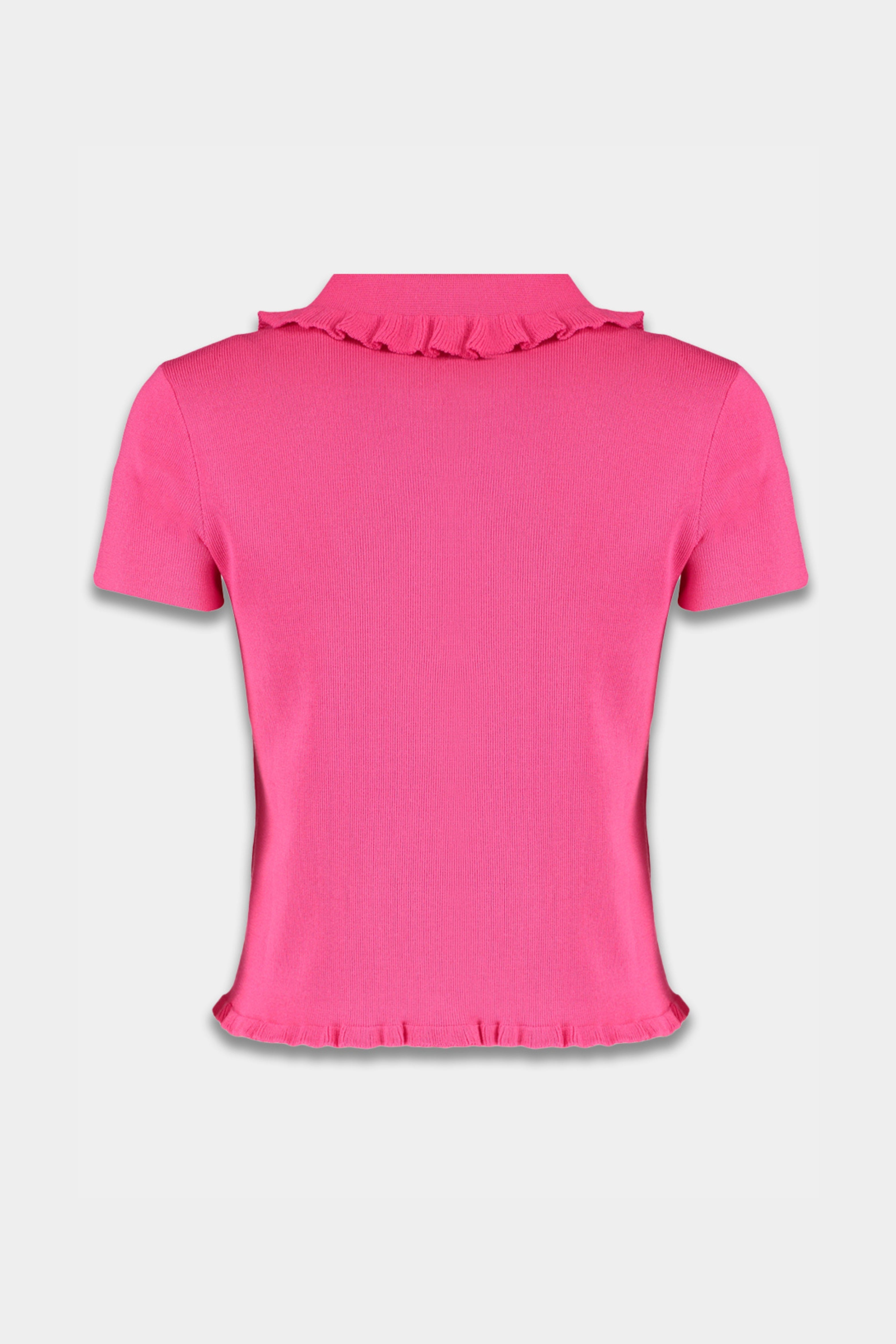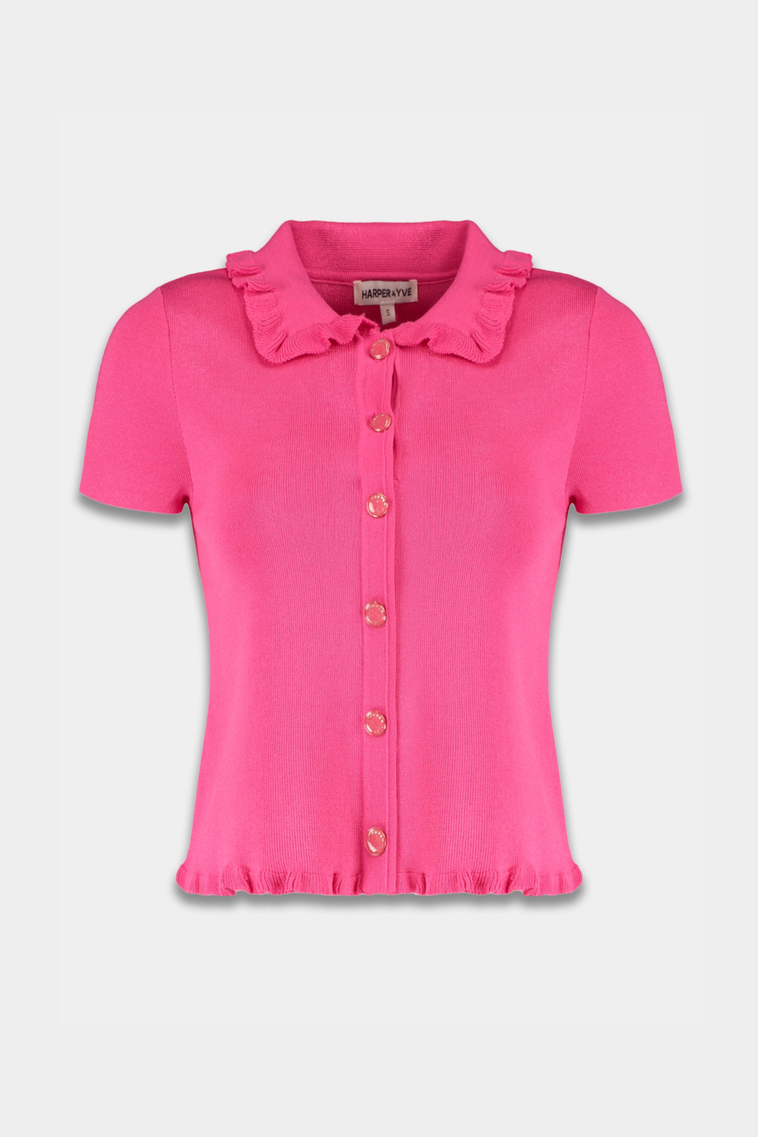 De Top Semmy Hot Pink van Harper & Yve is een speelse, vrouwelijke top met korte mouwen, een ruches kraag en elegante knopen. De stretchy stof biedt comfort en een flatterende pasvorm, perfect voor elke gelegenheid.