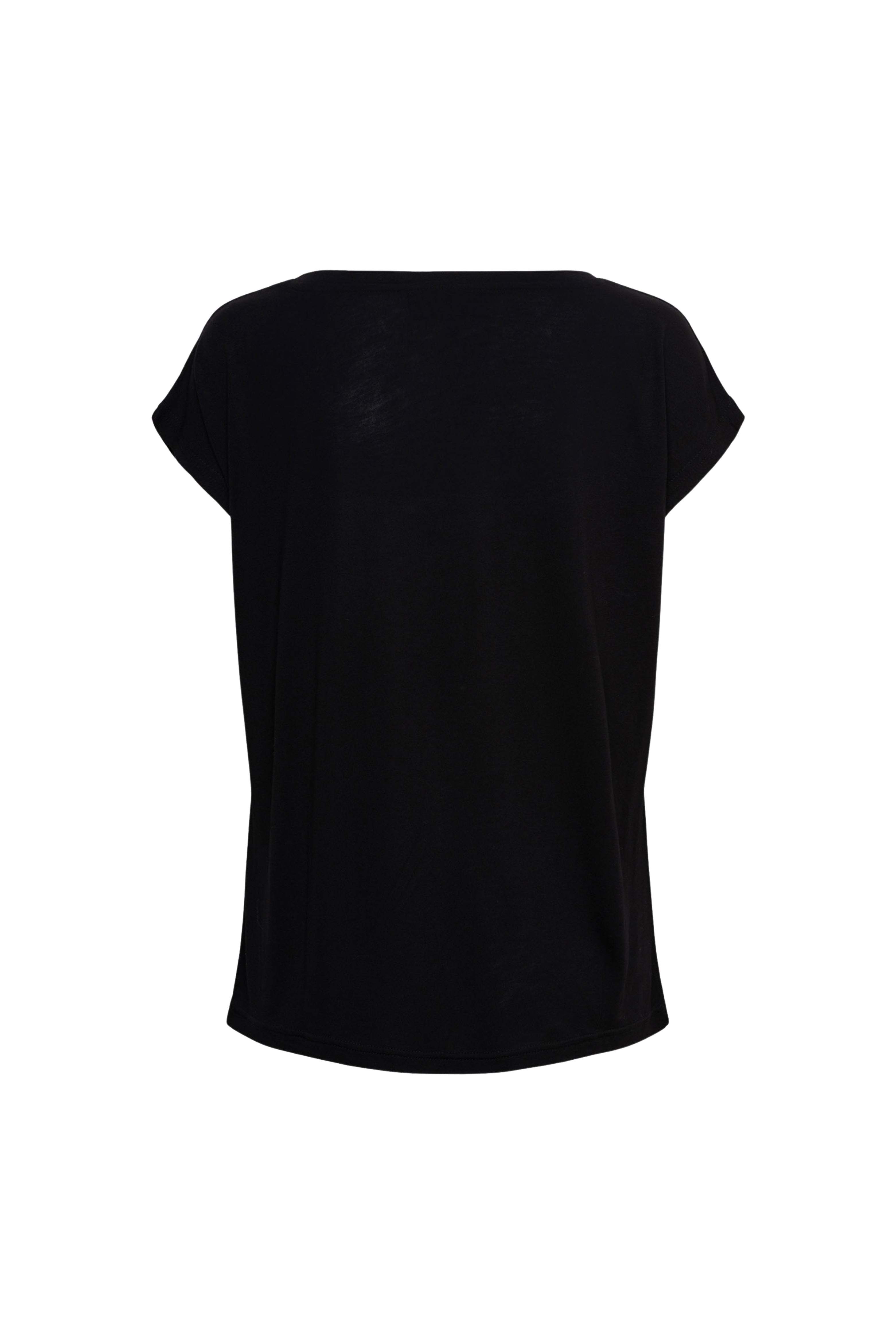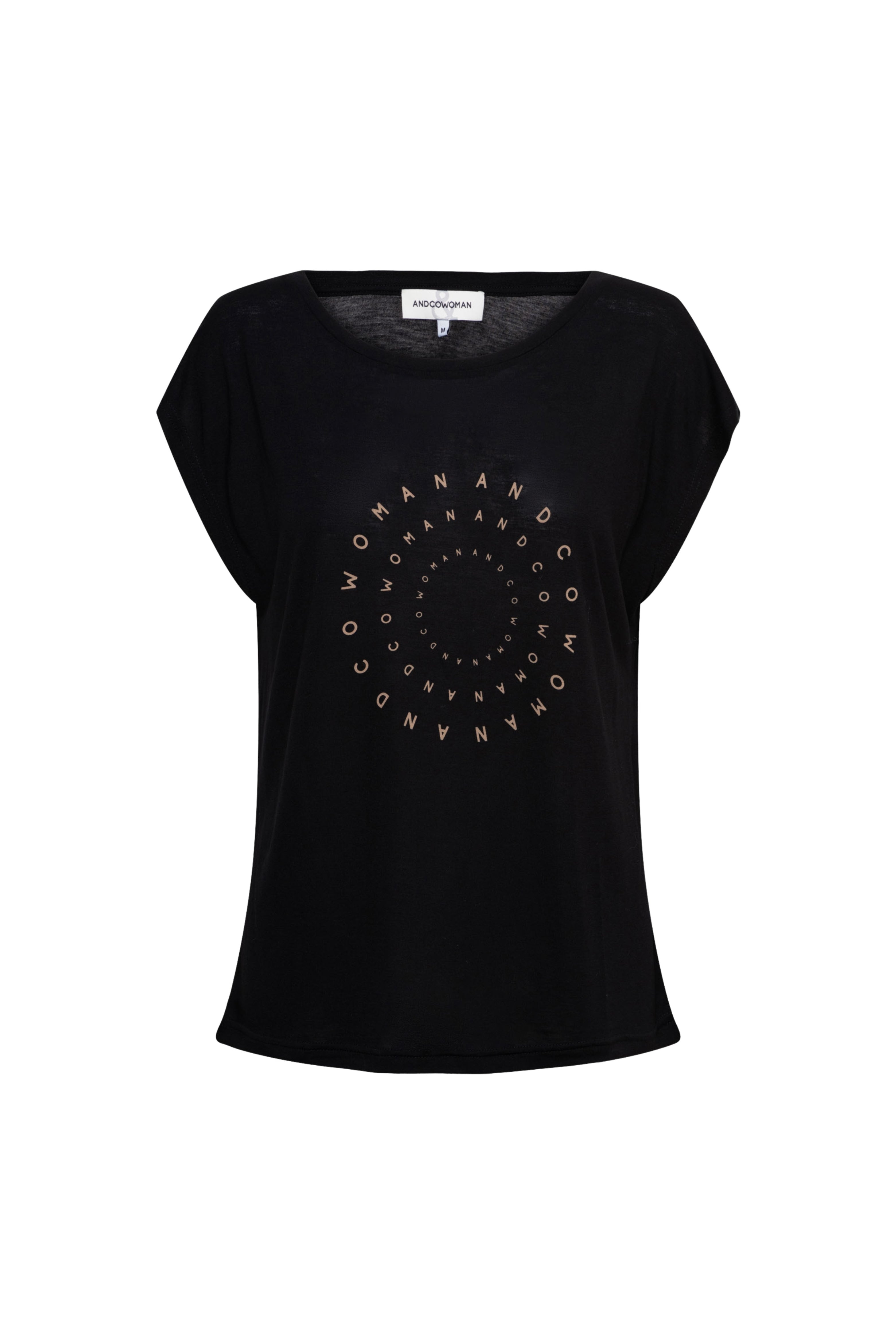 Top Signy Black van &Co Woman is een tijdloze basic met korte mouwen en ronde hals. Het cirkelvormige artwork in contrasterende letters geeft deze zwarte top een moderne en sportieve touch.
