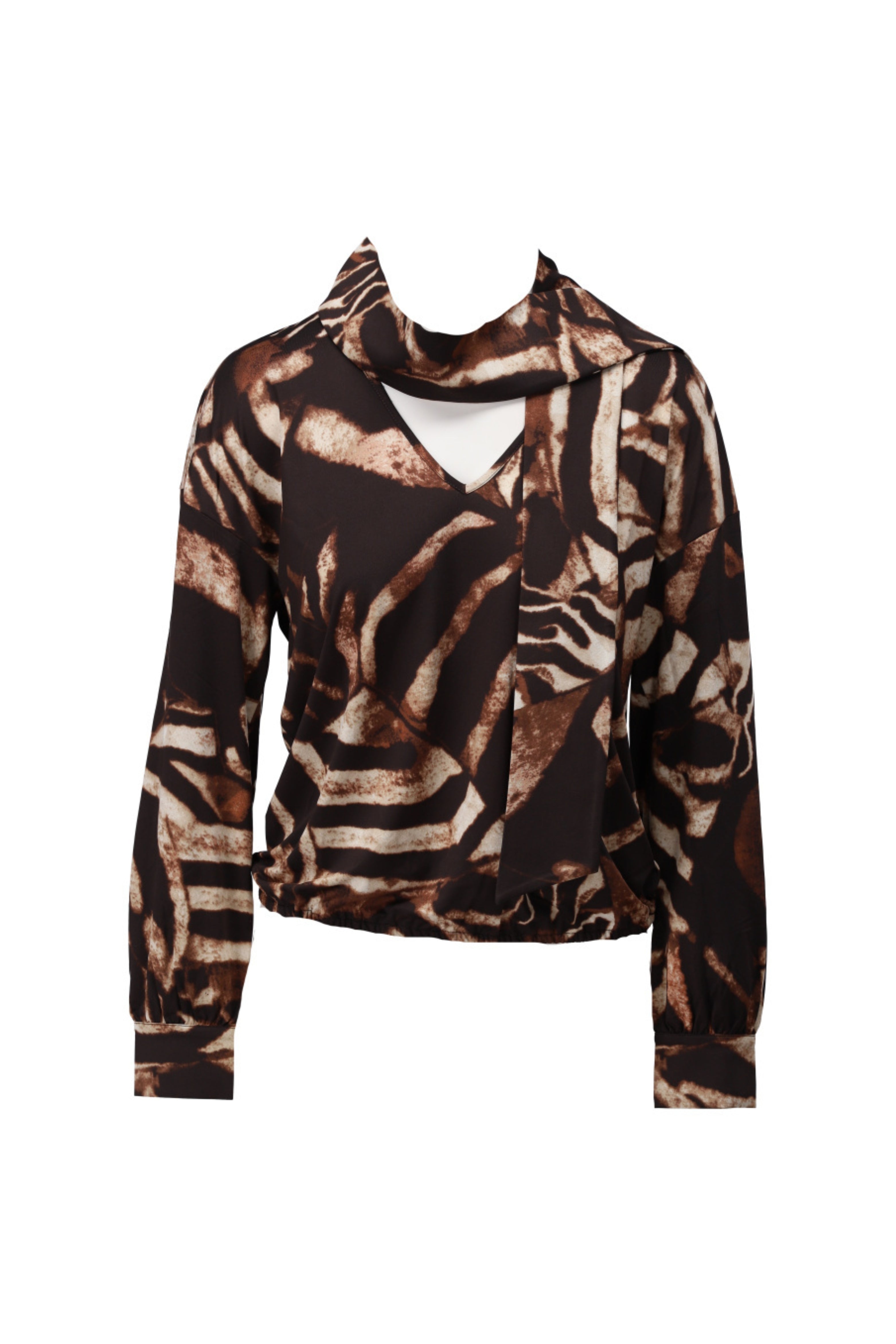Top V-hals Met Sjaaltje & Design van K-design is een stijlvol en veelzijdig item dat direct in het oog springt door de opvallende designprint. De warme bruin- en zwarttinten geven een chique uitstraling.