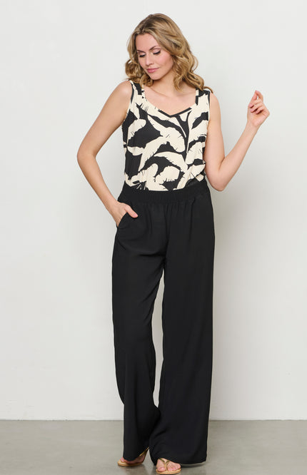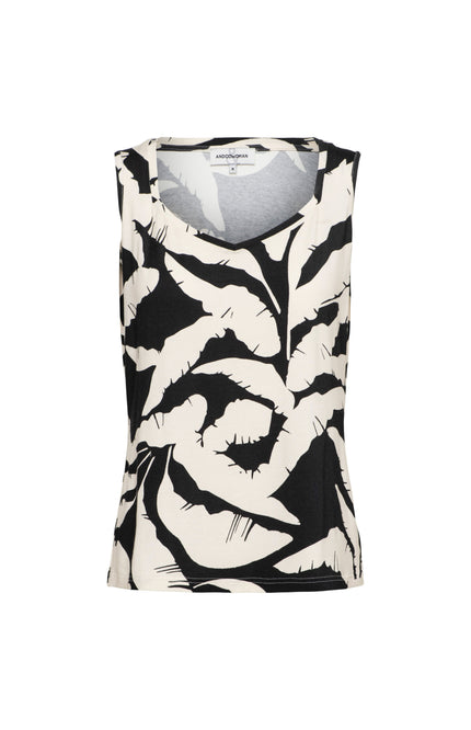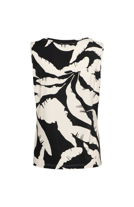 Top Via Banana Leaf Black Multi van &Co Woman is een zomerse mouwloze top met een opvallende all-over bladprint in zwart en beige. Een vrouwelijke keuze voor een luchtige en stijlvolle look.