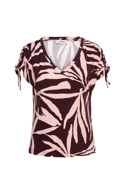 De Top Viana Leaf Aubergine Multi van &Co Woman is een zomerse eyecatcher met een tropische bladprint. De V-hals en strikkoordjes op de schouders geven deze top een speels en vrouwelijk accent. Perfect voor een casual, kleurrijke look.