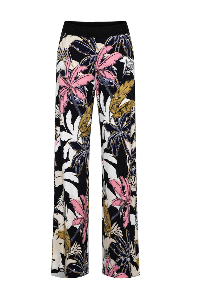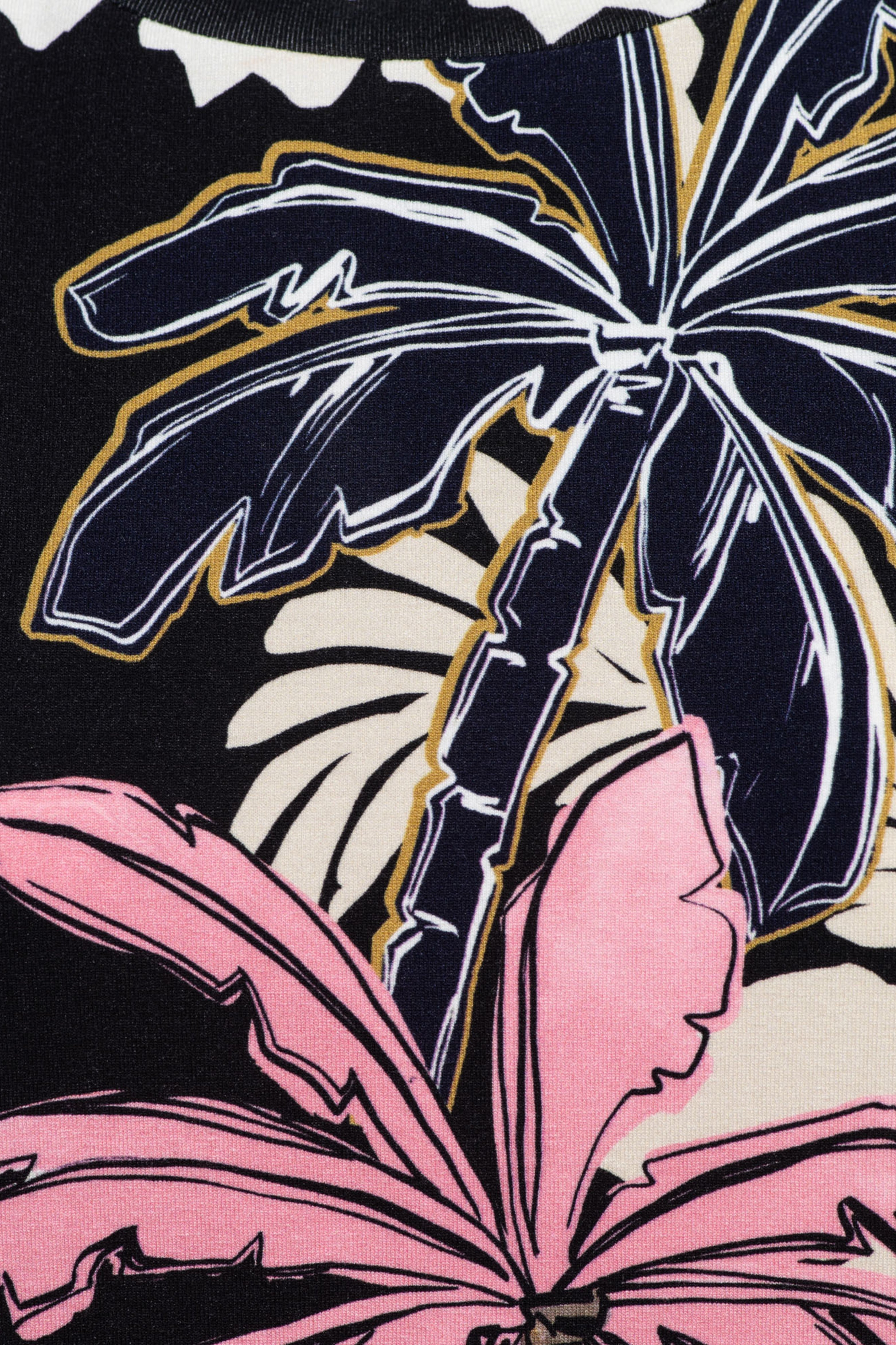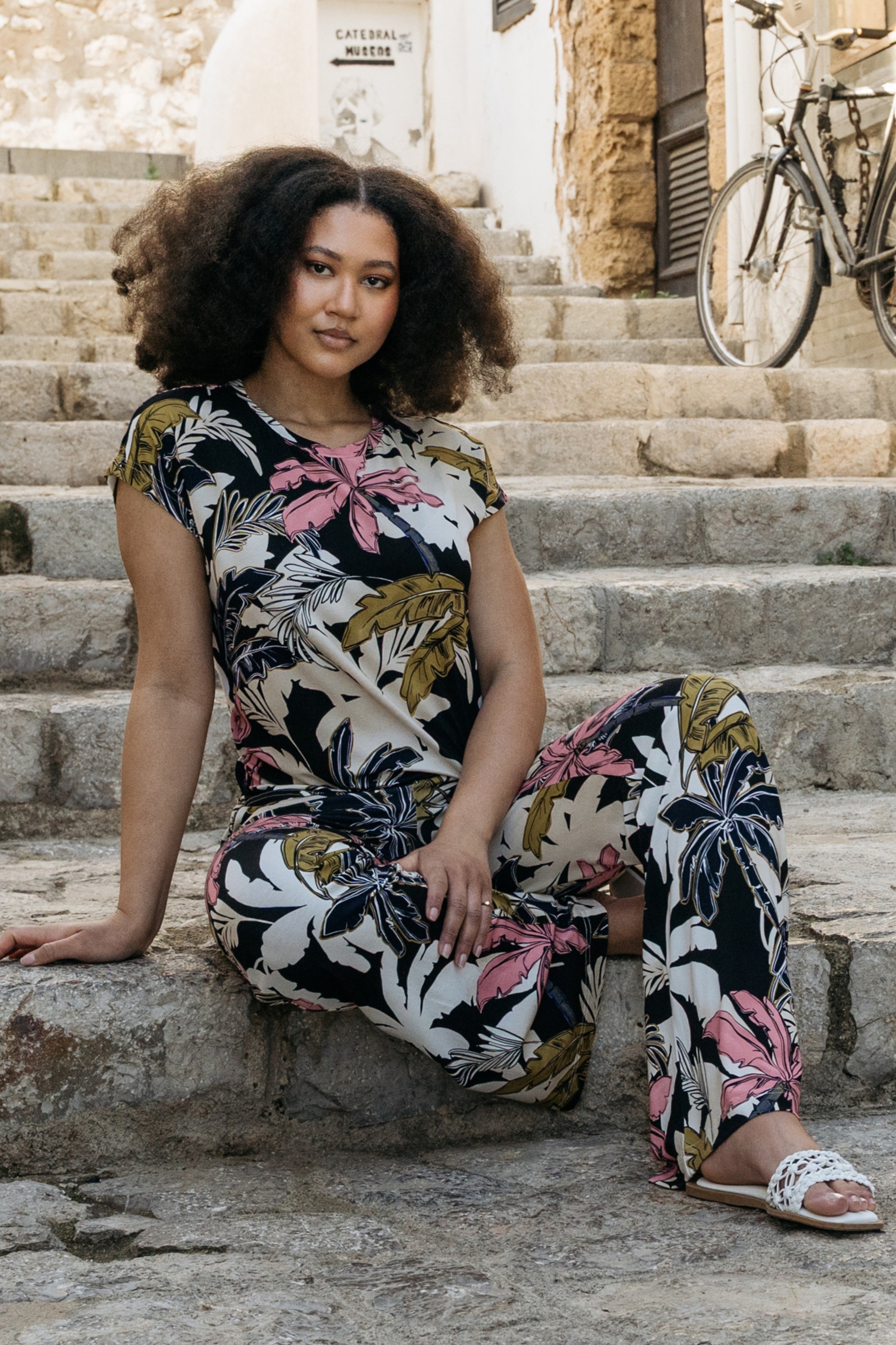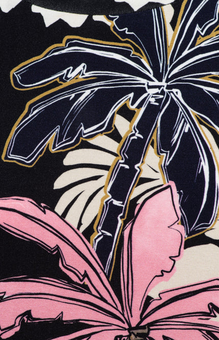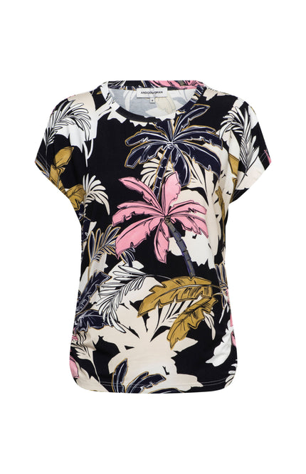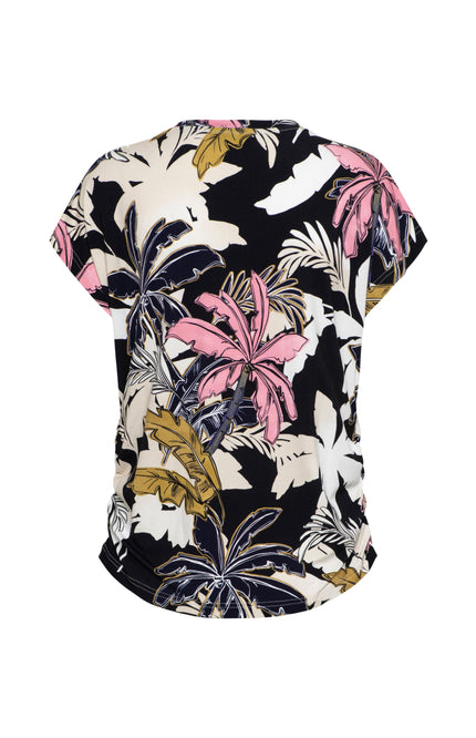 Top Vineeta Palm Black Multi van &Co Woman straalt tropische vibes uit met zijn opvallende palmprint in roze, geel en wit op een zwarte basis. De losse pasvorm en ronde hals zorgen voor een casual en comfortabele look.
