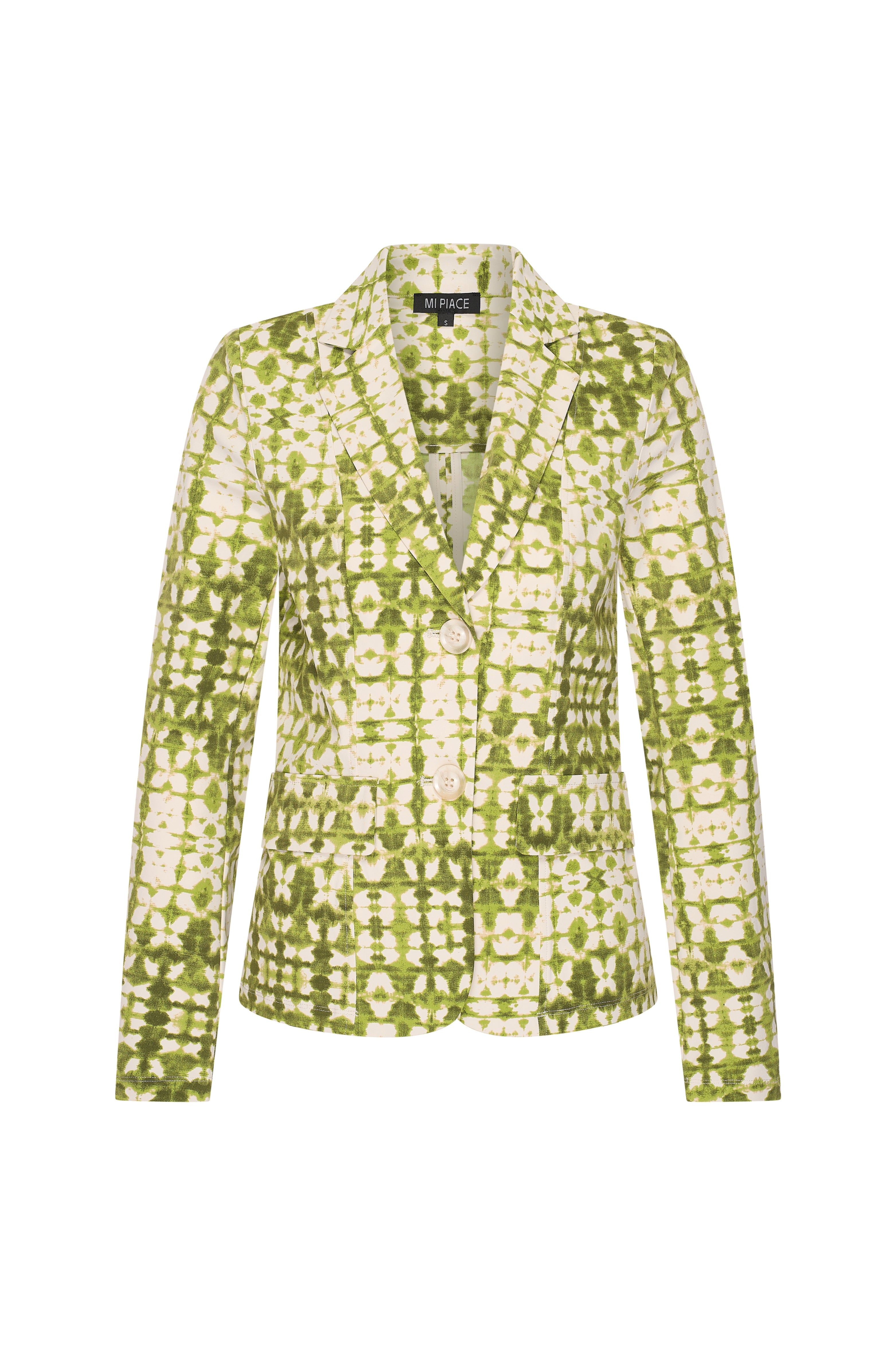 De Travel Blazer van Mi Piace met Batik Print in Kelp Forest Kit is een eyecatcher! Het getailleerde model en de lichte stretchstof zorgen voor een comfortabele pasvorm, terwijl het batikdessin je outfit een unieke, stijlvolle twist geeft.