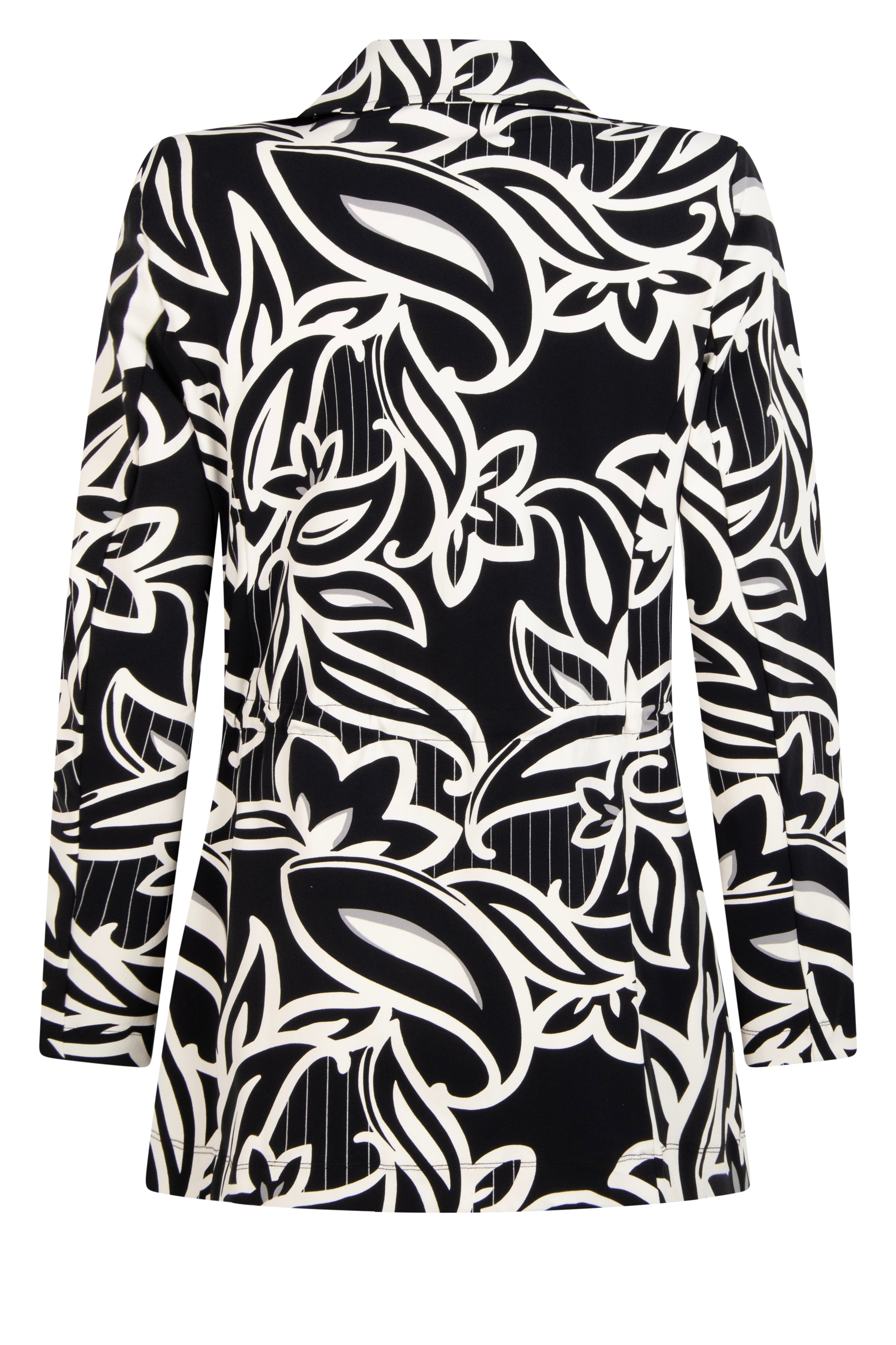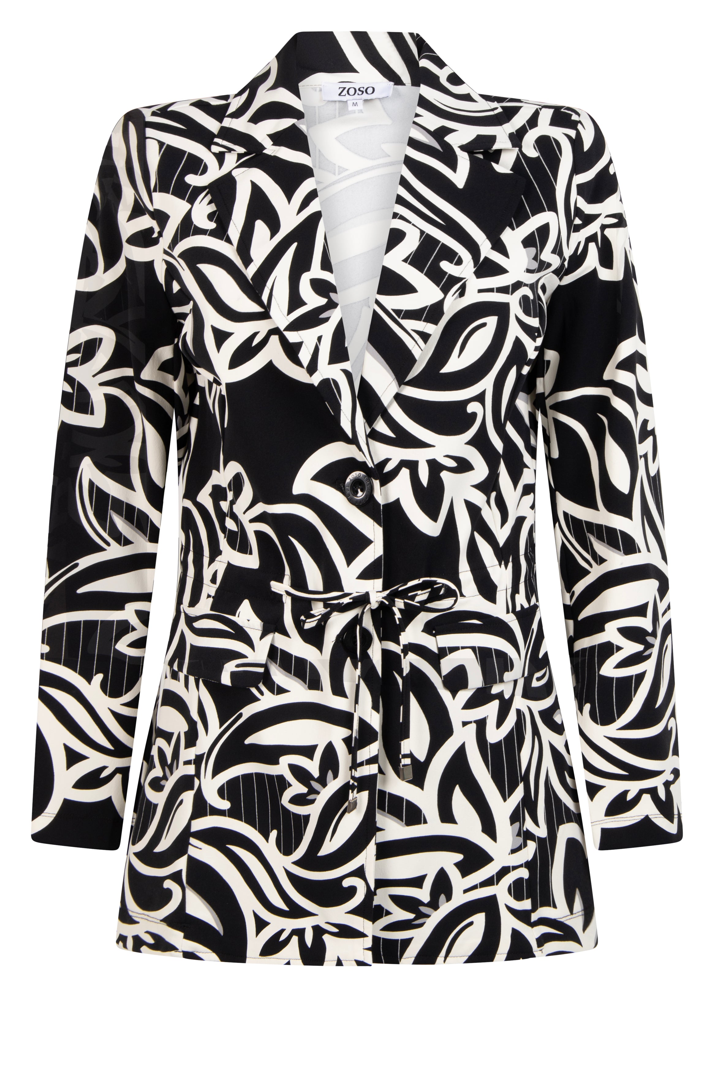 De Travel blazer Charly black ivory van Zoso is een elegant en opvallend kledingstuk, ontworpen voor vrouwen die graag een statement maken. De blazer is uitgevoerd in een gedurfd zwart met ivoor patroon, met abstracte bloemen die zorgen voor een dynamisch en artistiek effect.