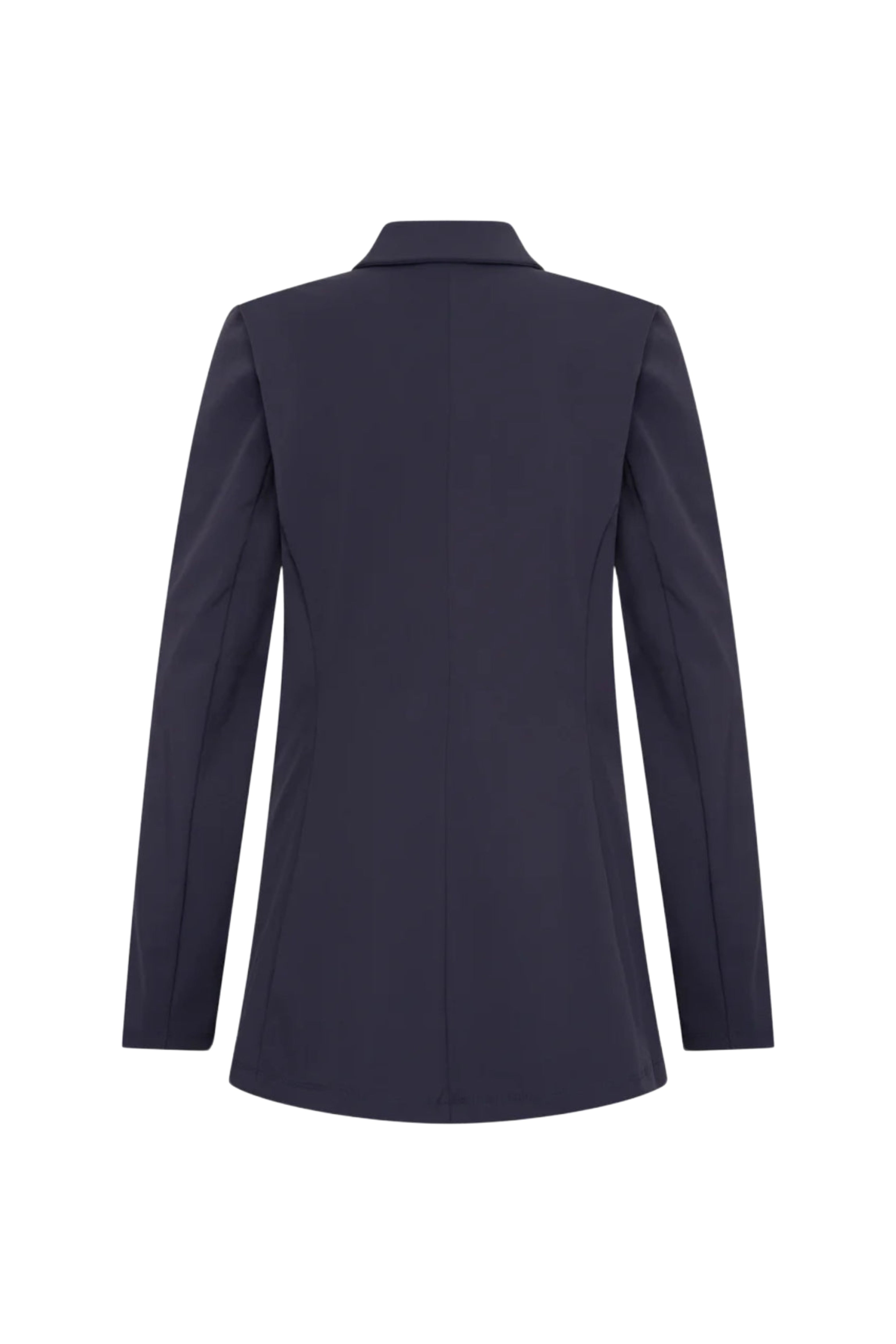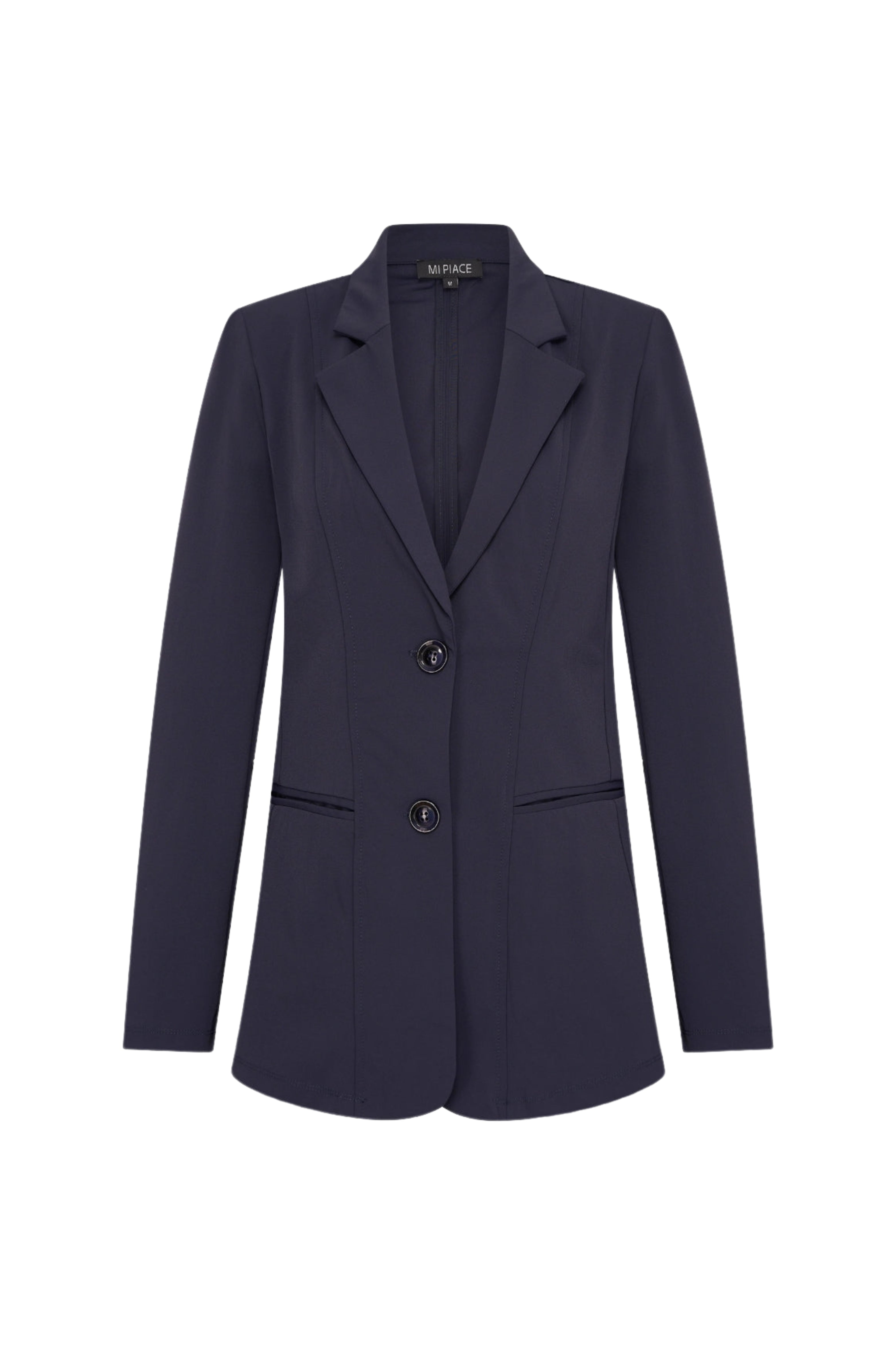 De Travel Blazer Navy van Mi Piace heeft een elegante, lange snit die het figuur mooi accentueert. De soepele travelstof biedt ultiem draagcomfort en een verzorgde look. Ideaal voor zowel zakelijke als casual combinaties.