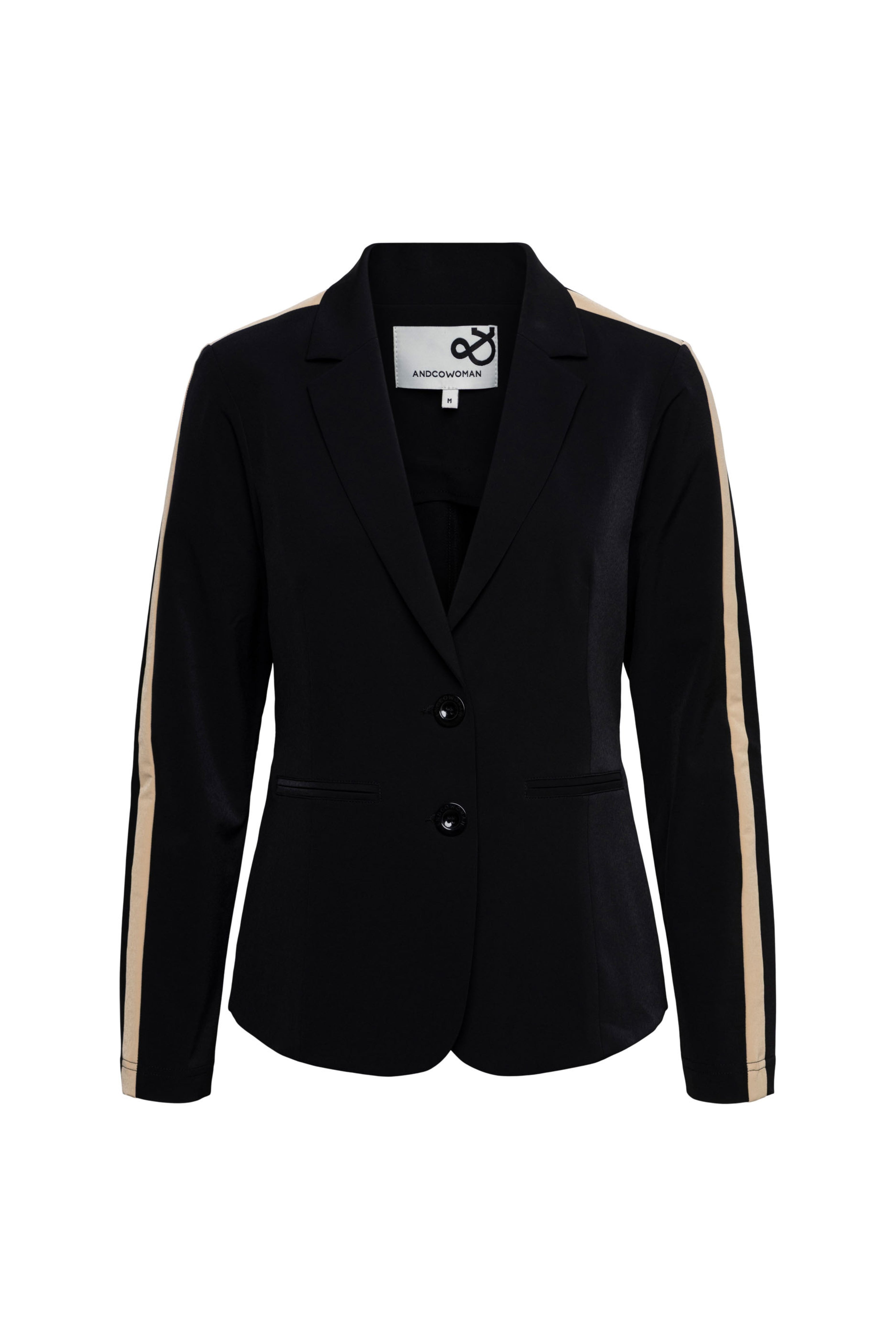 De Travel Blazer Pammy Black van &Co Woman is een stijlvolle, moderne blazer met sportieve contrastbanen langs de mouwen. De comfortabele travelstof en getailleerde pasvorm maken dit item perfect voor zowel workwear als casual chic looks.