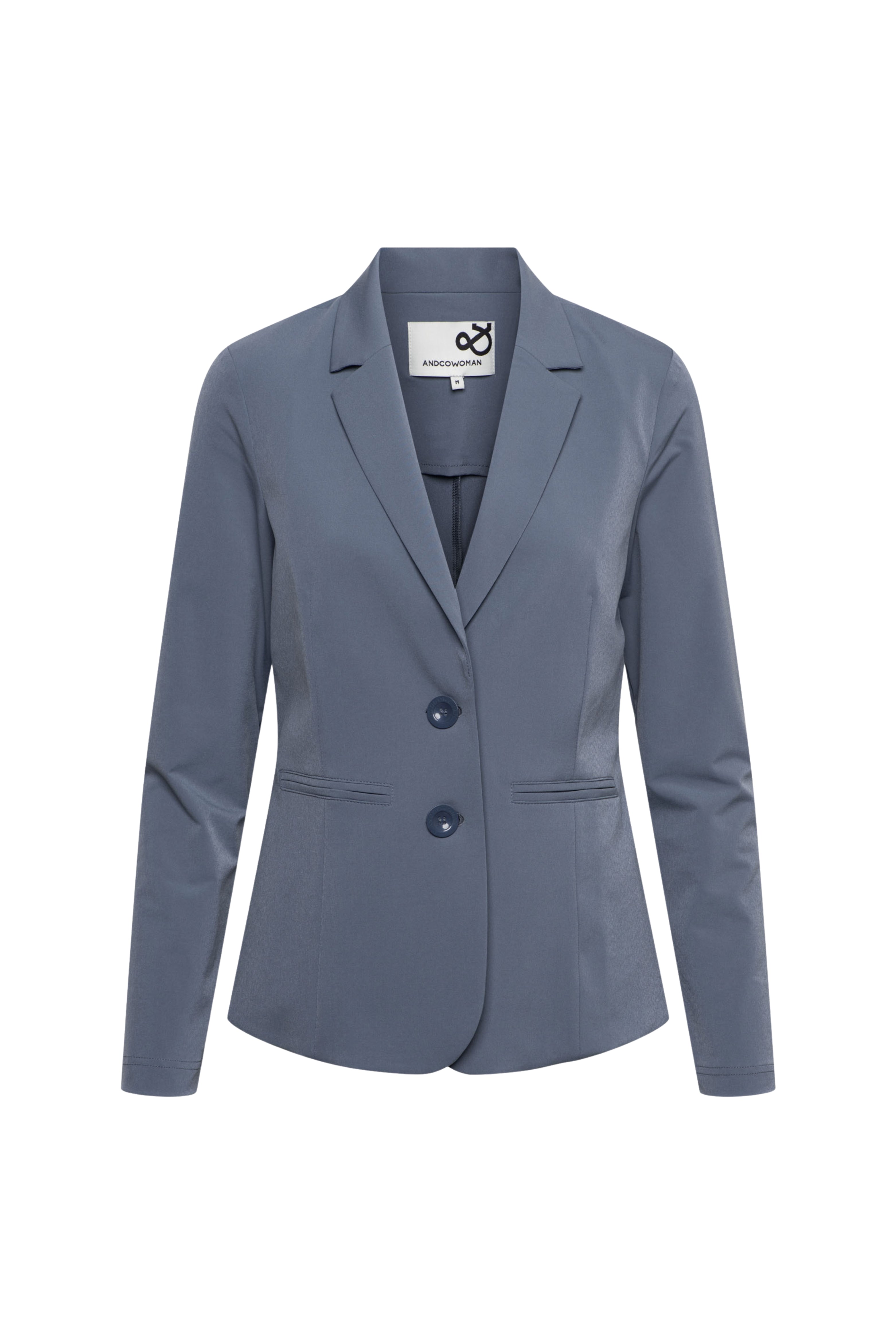 Travel Blazer Phileine Dark Slate van &Co Woman is een stijlvolle blazer met reverskraag en twee knopen. De licht getailleerde pasvorm en gladde travelstof zorgen voor een comfortabele, elegante look die perfect is voor werk en dagelijks gebruik.