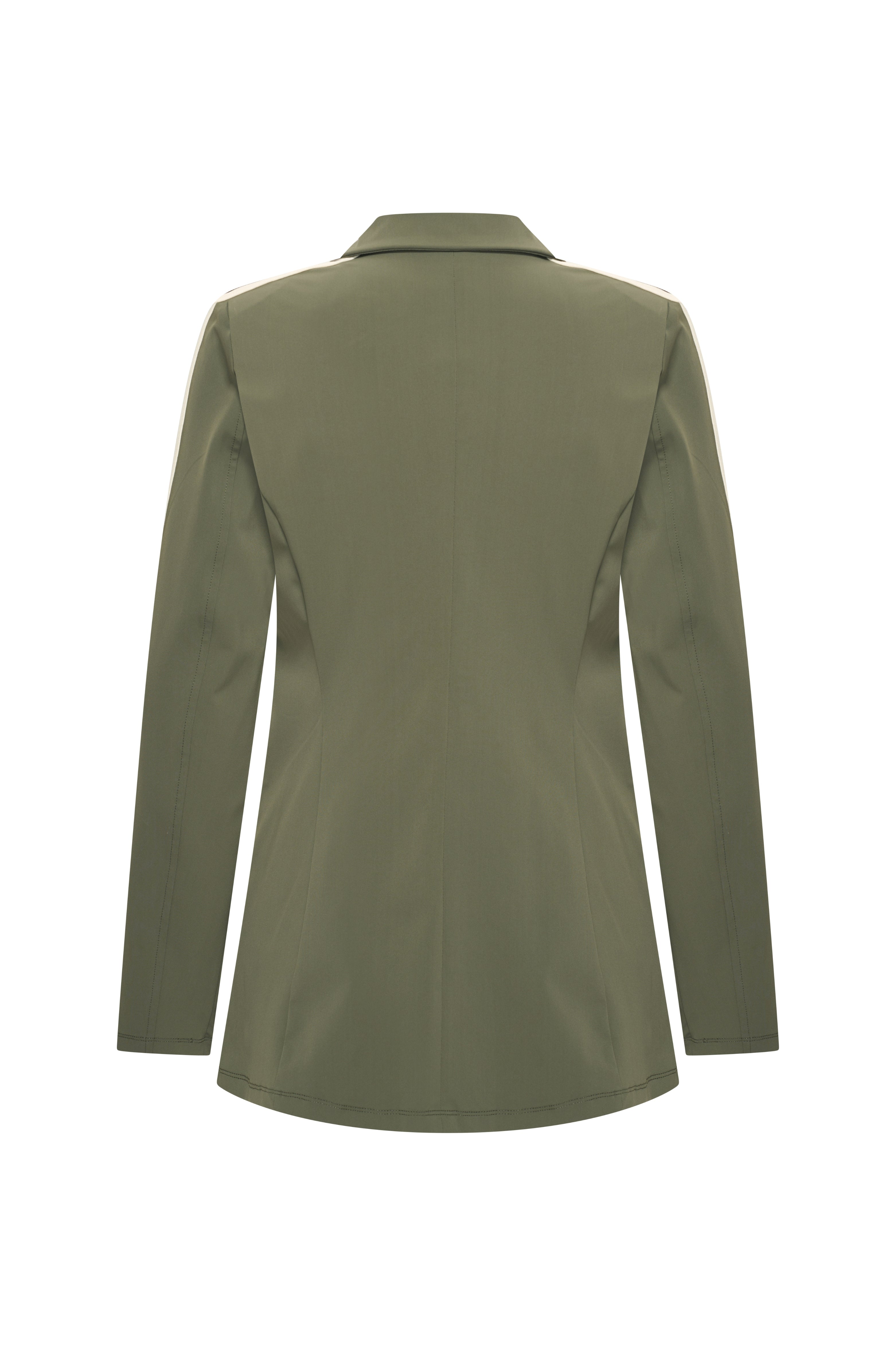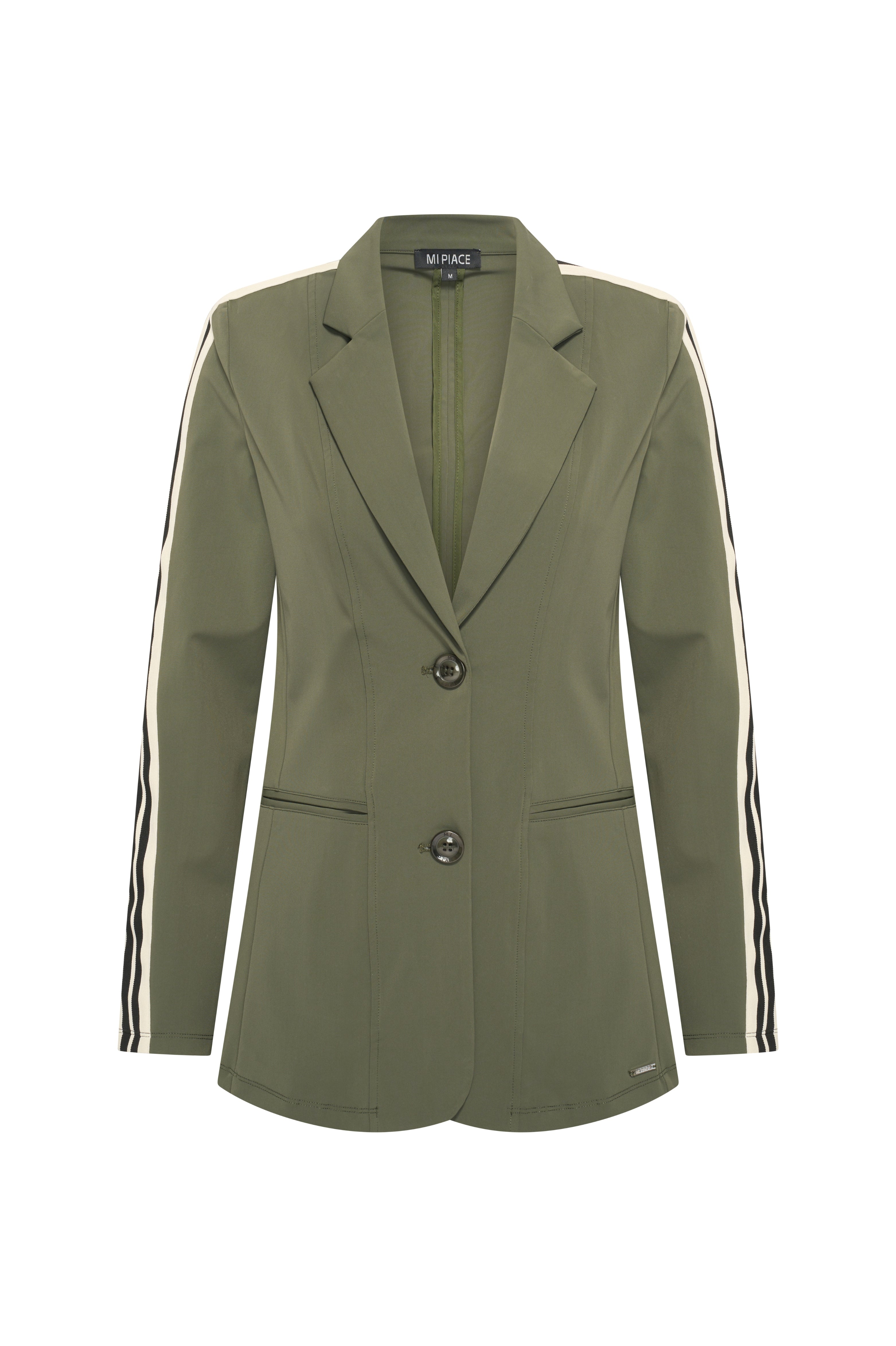 De Travel Blazer Tape Deep Depth van Mi Piace is een stijlvolle blazer in groen met sportieve tape langs de mouwen. Het getailleerde model met reverskraag en dubbele knoopsluiting combineert elegantie met een moderne, sportieve touch.