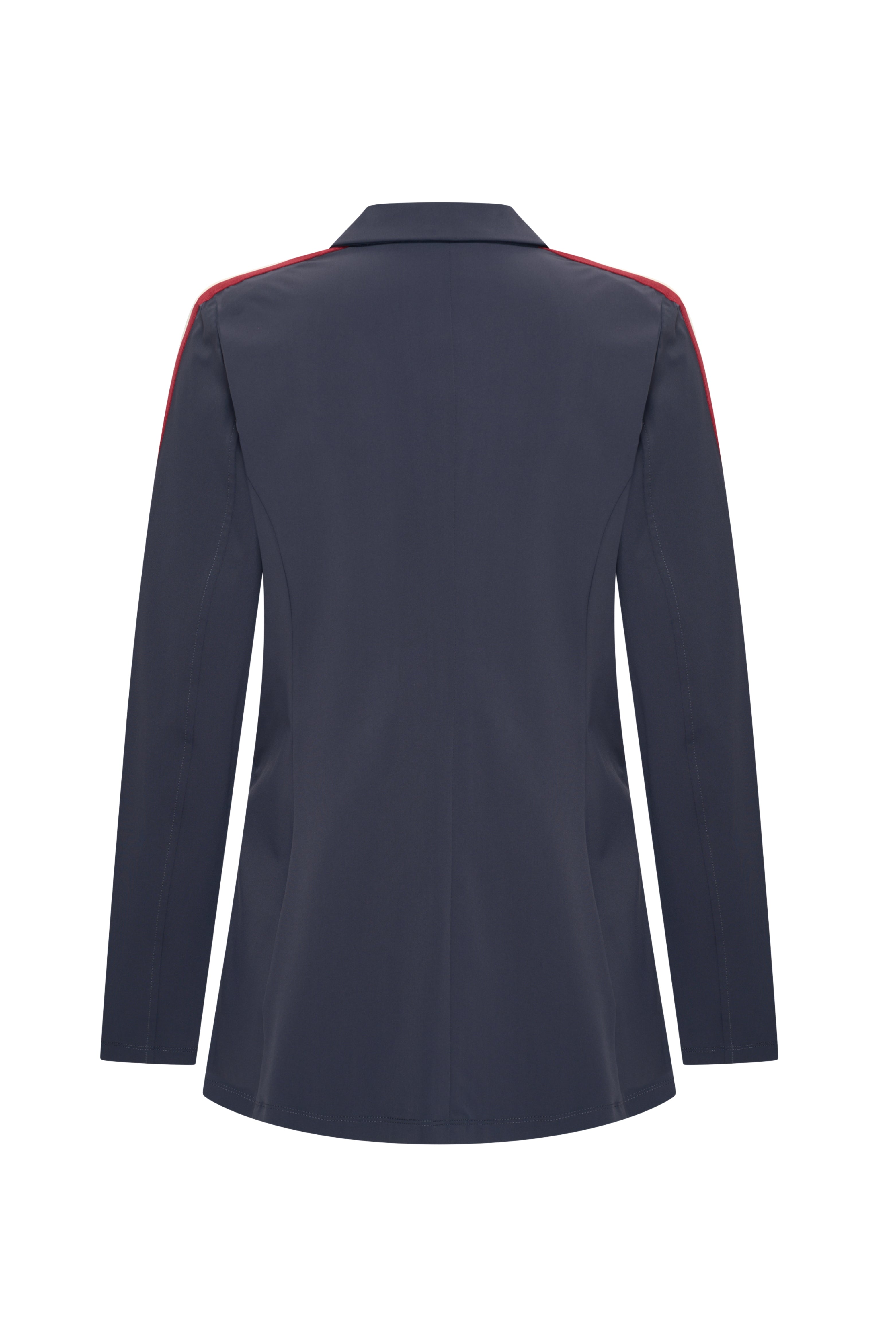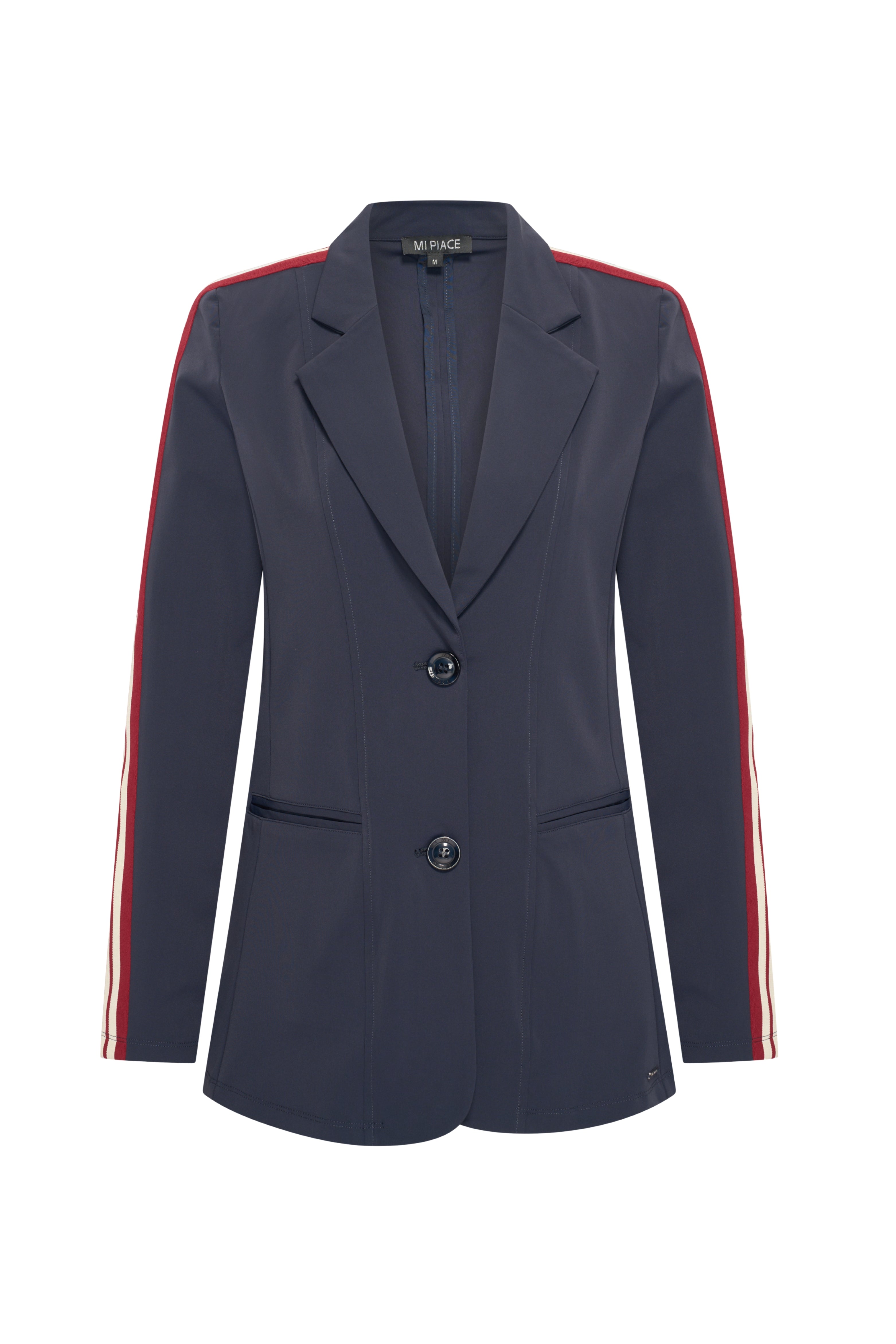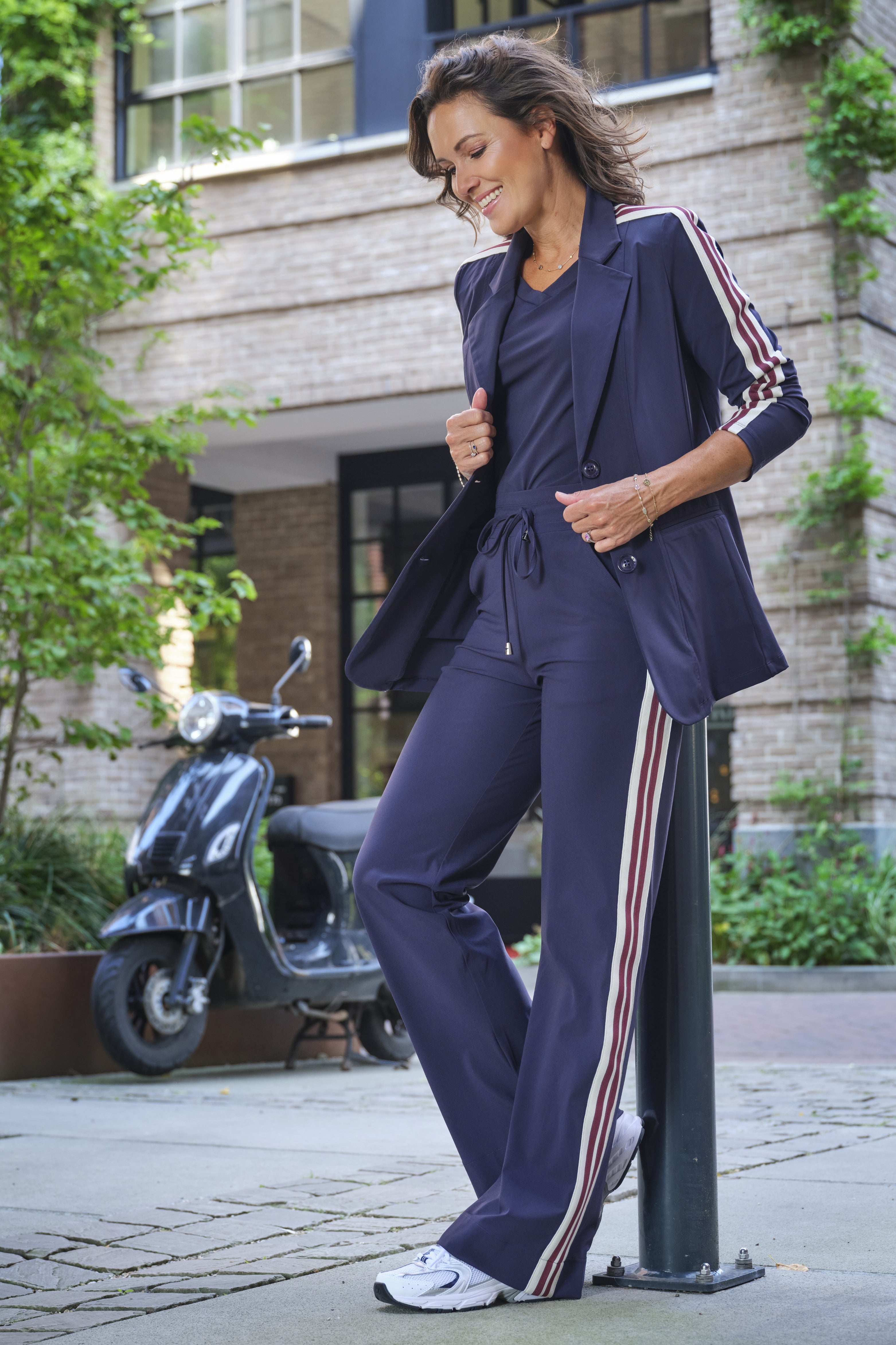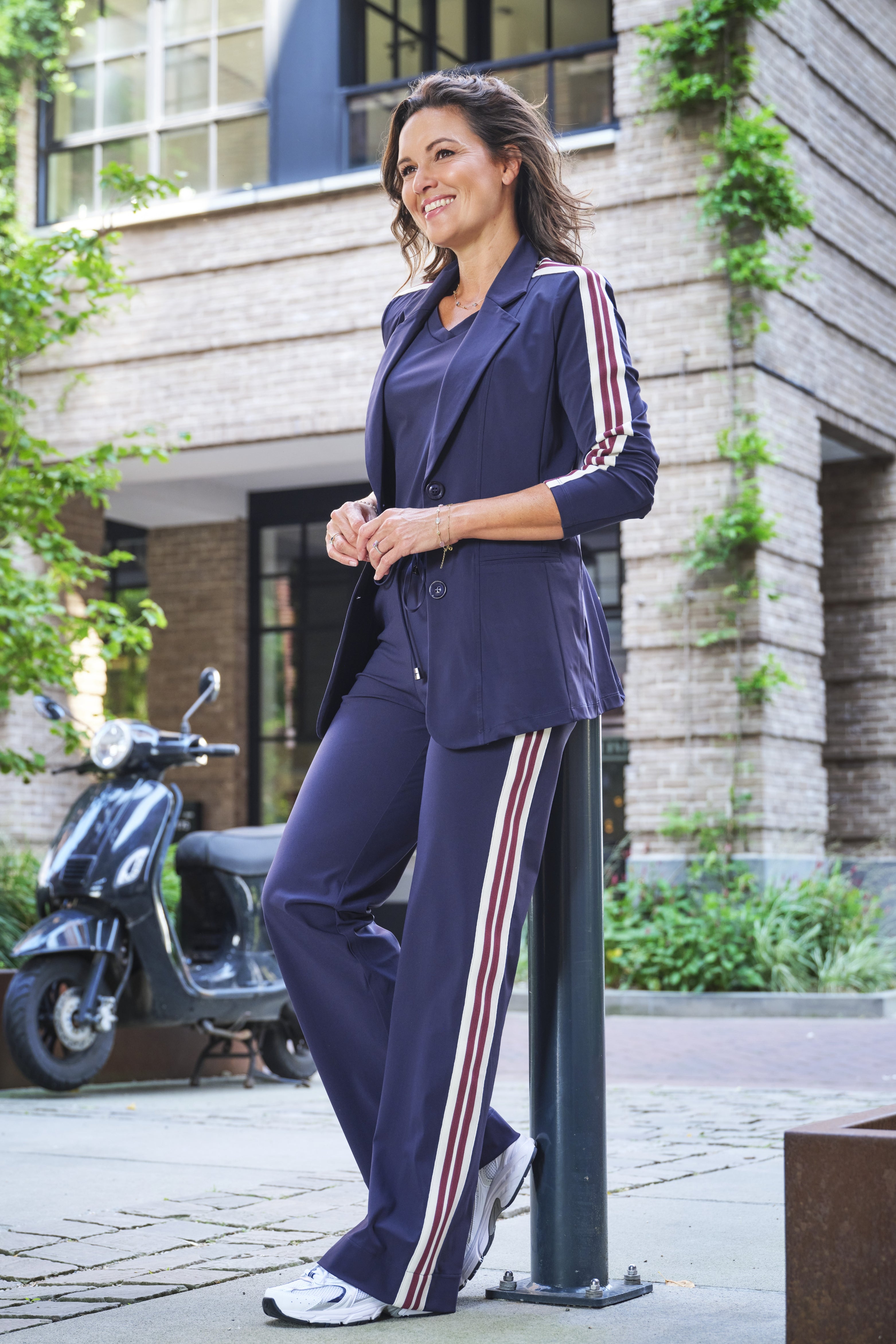 De Navy variant van de Mi Piace Travel Blazer Tape biedt een stijlvolle twist op de klassieke blazer. Met sportieve tape langs de mouwen en een comfortabele stretchstof is deze blazer perfect te dragen als co-ord set of los met je favoriete basics.