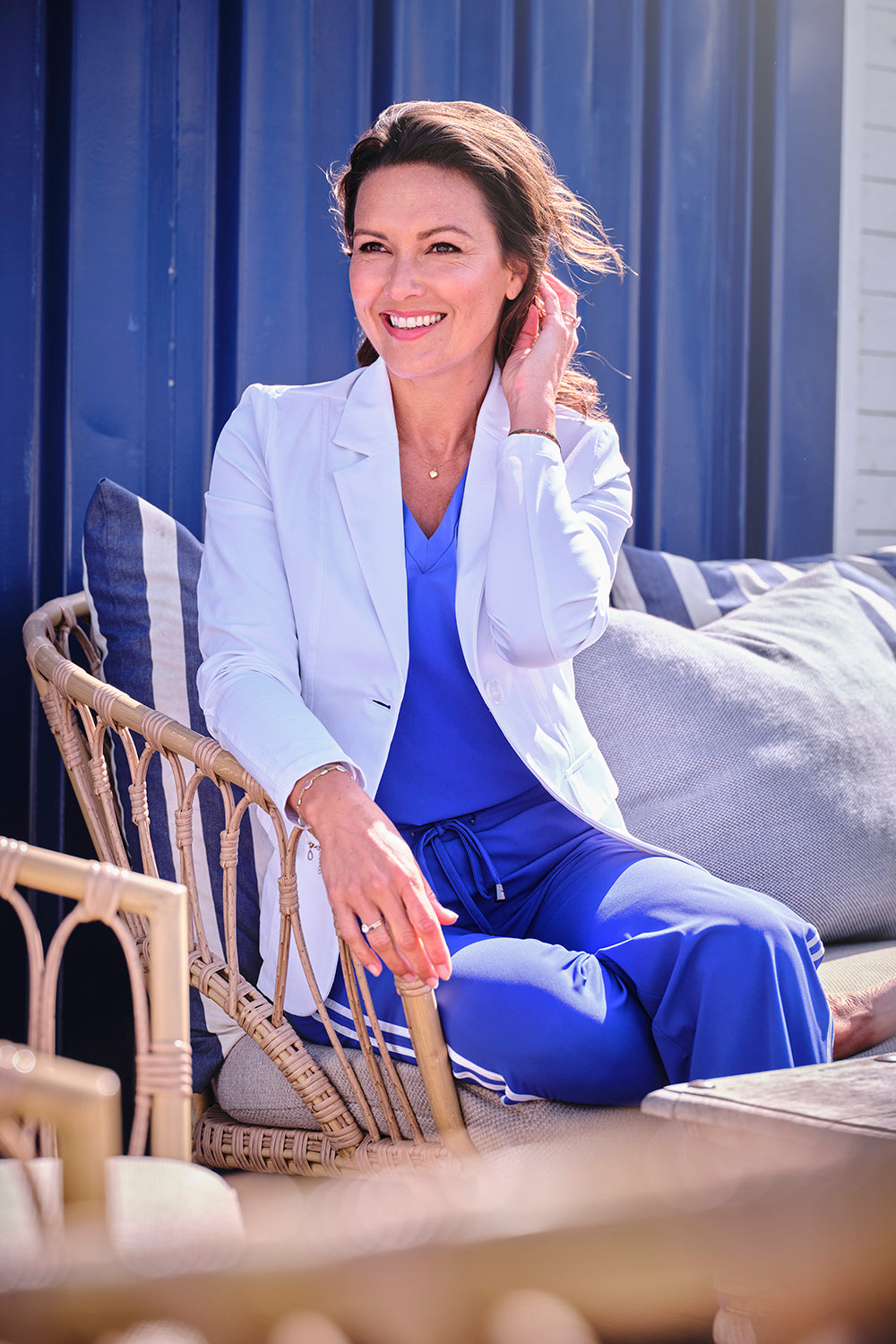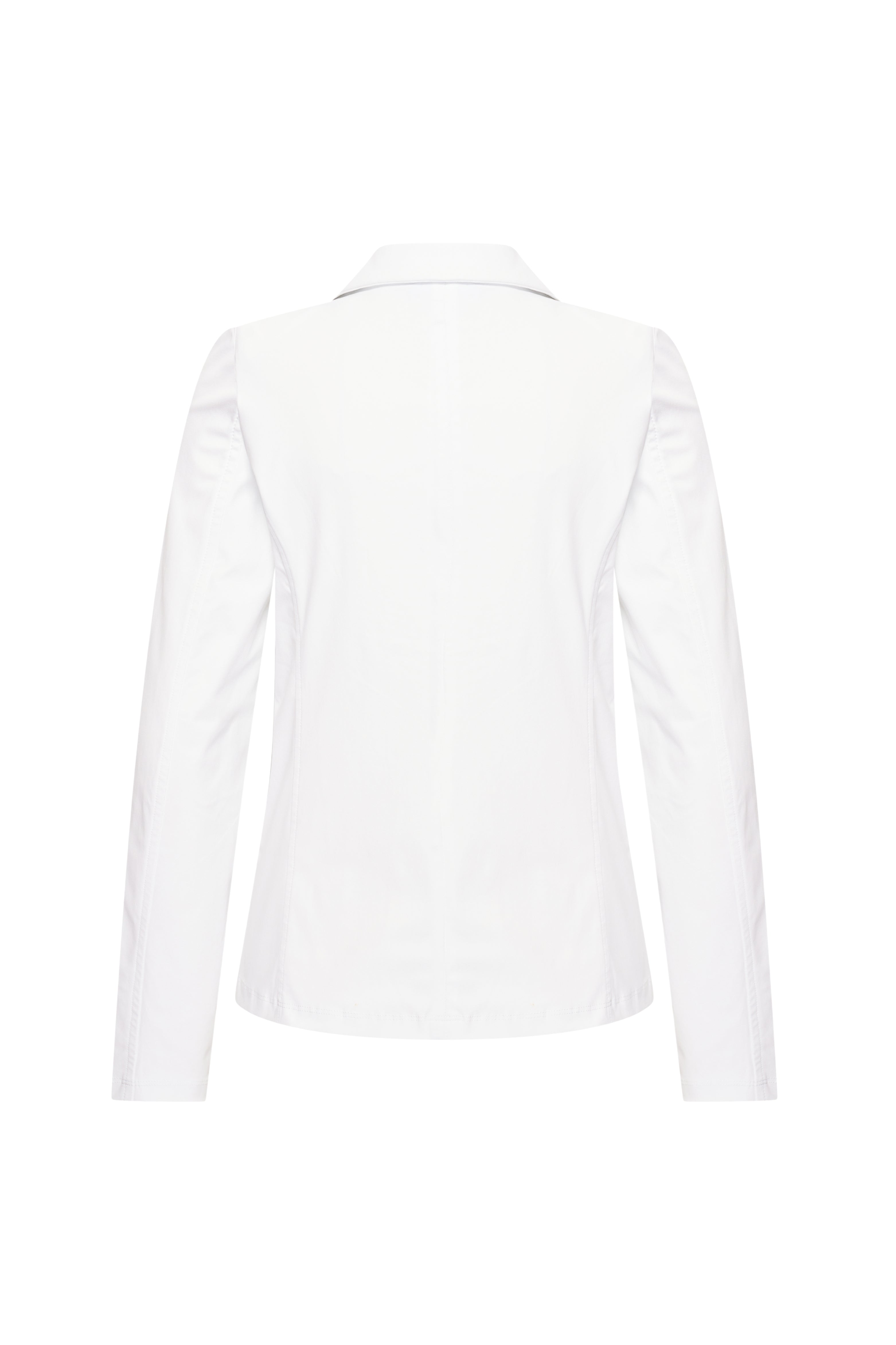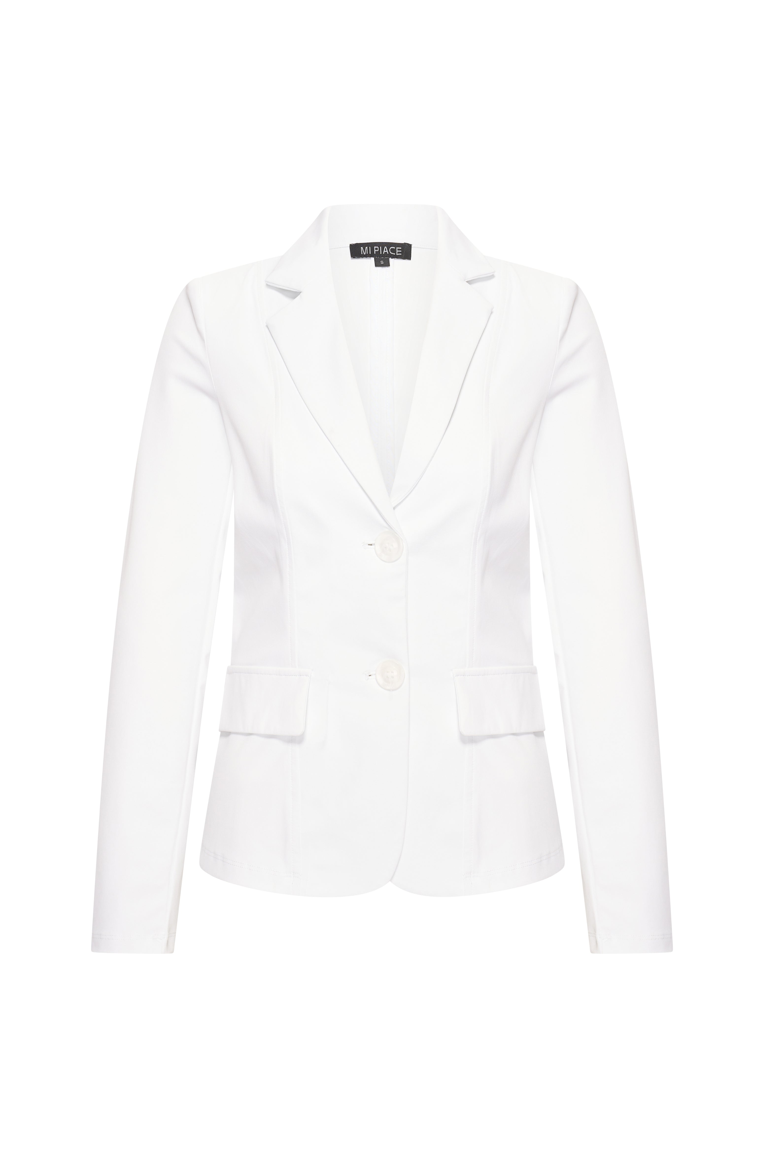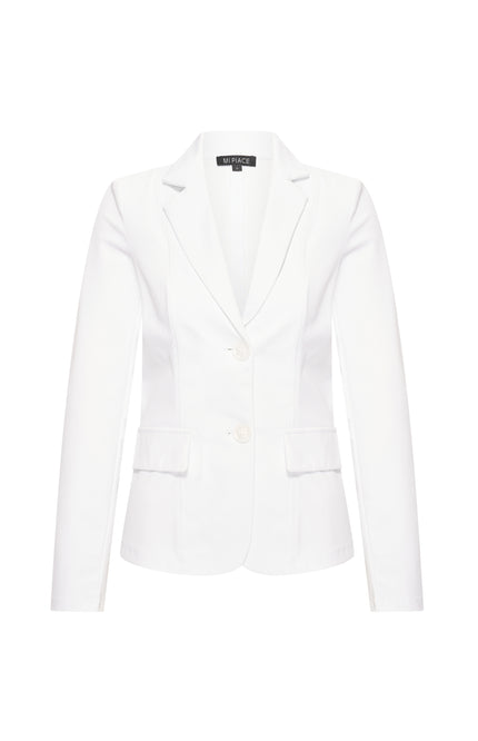 Travel Blazer White van Mi Piace is een tijdloos en stijlvol jasje met een getailleerde pasvorm en klassieke reverskraag. Gemaakt van een comfortabele travelstof die mooi in model blijft en perfect is voor elke gelegenheid.
