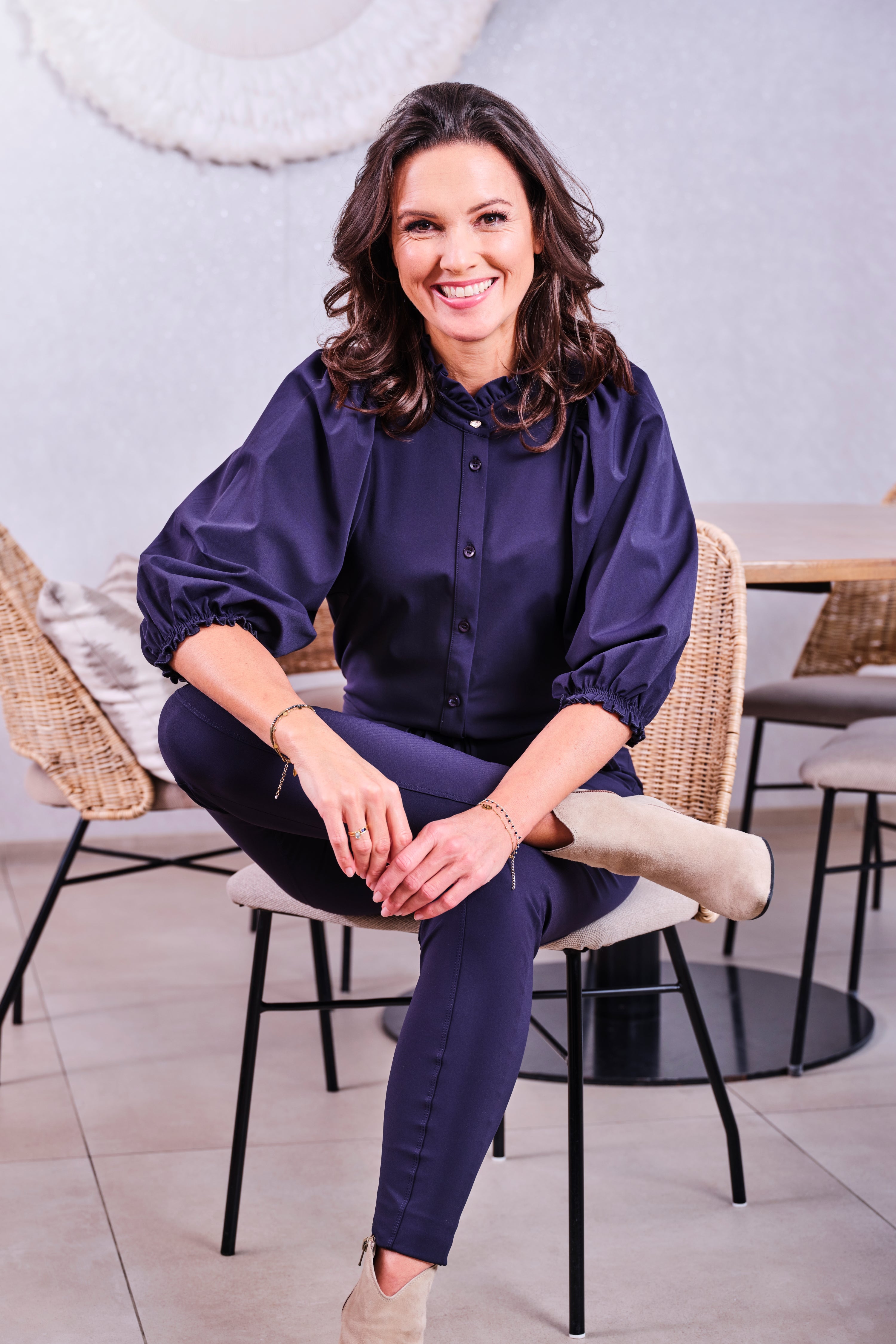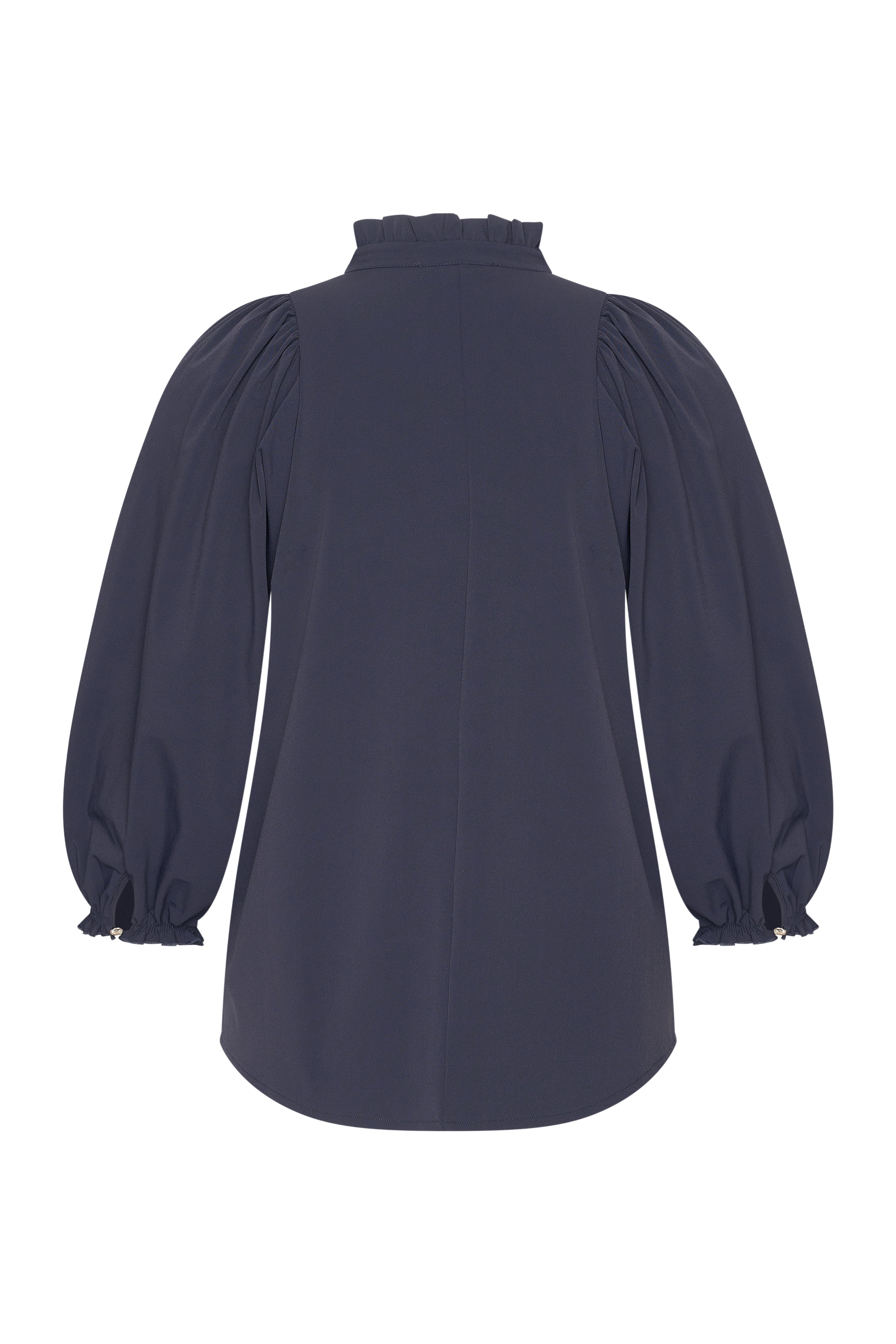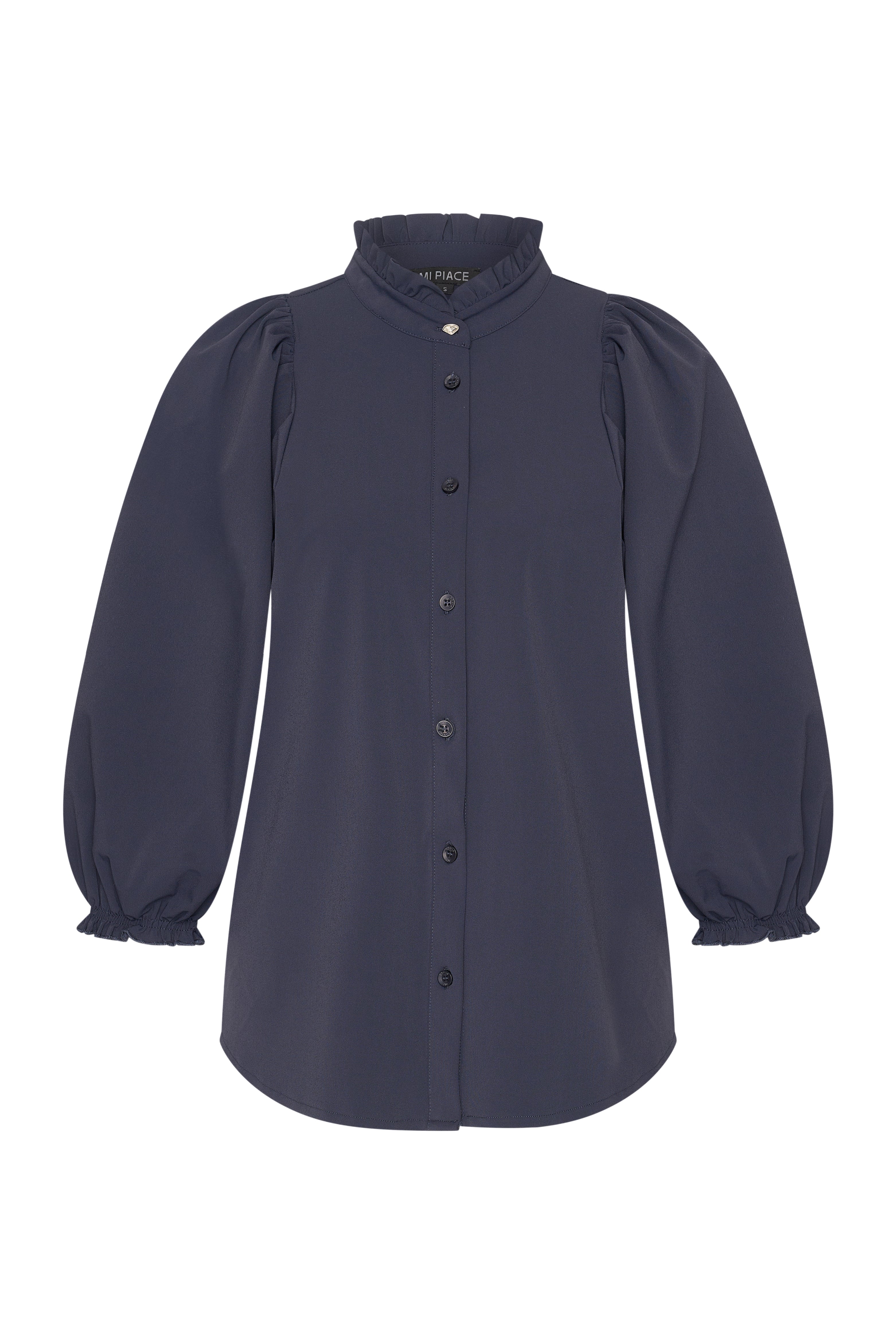 De Mi Piace Travel Blouse Ballon Mouw Navy combineert elegantie en comfort. Deze blouse in een diepe blauwe tint heeft opvallende ballonmouwen en een subtiele ruches kraag, perfect voor zowel casual als zakelijke looks.