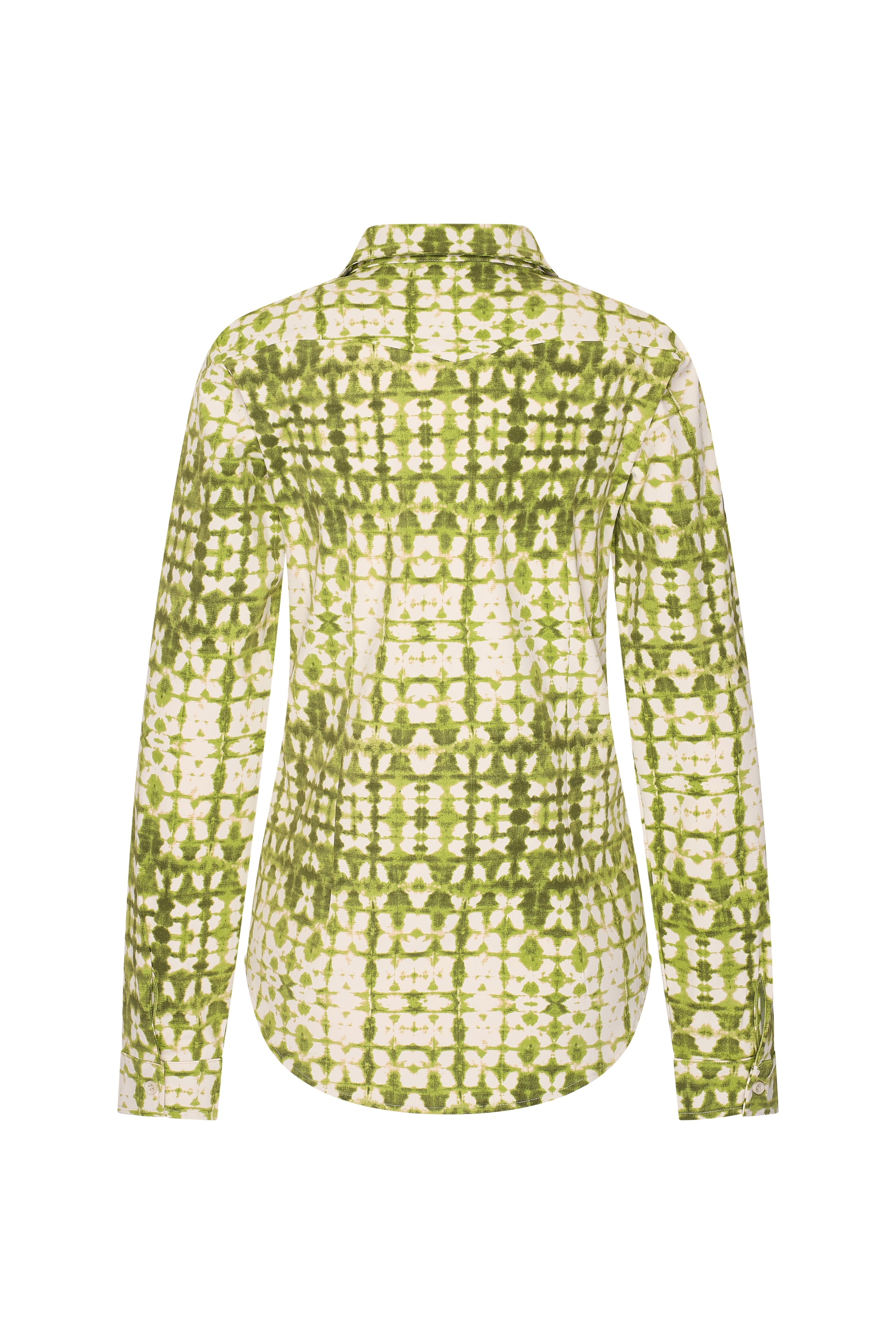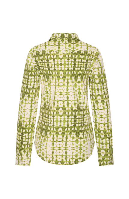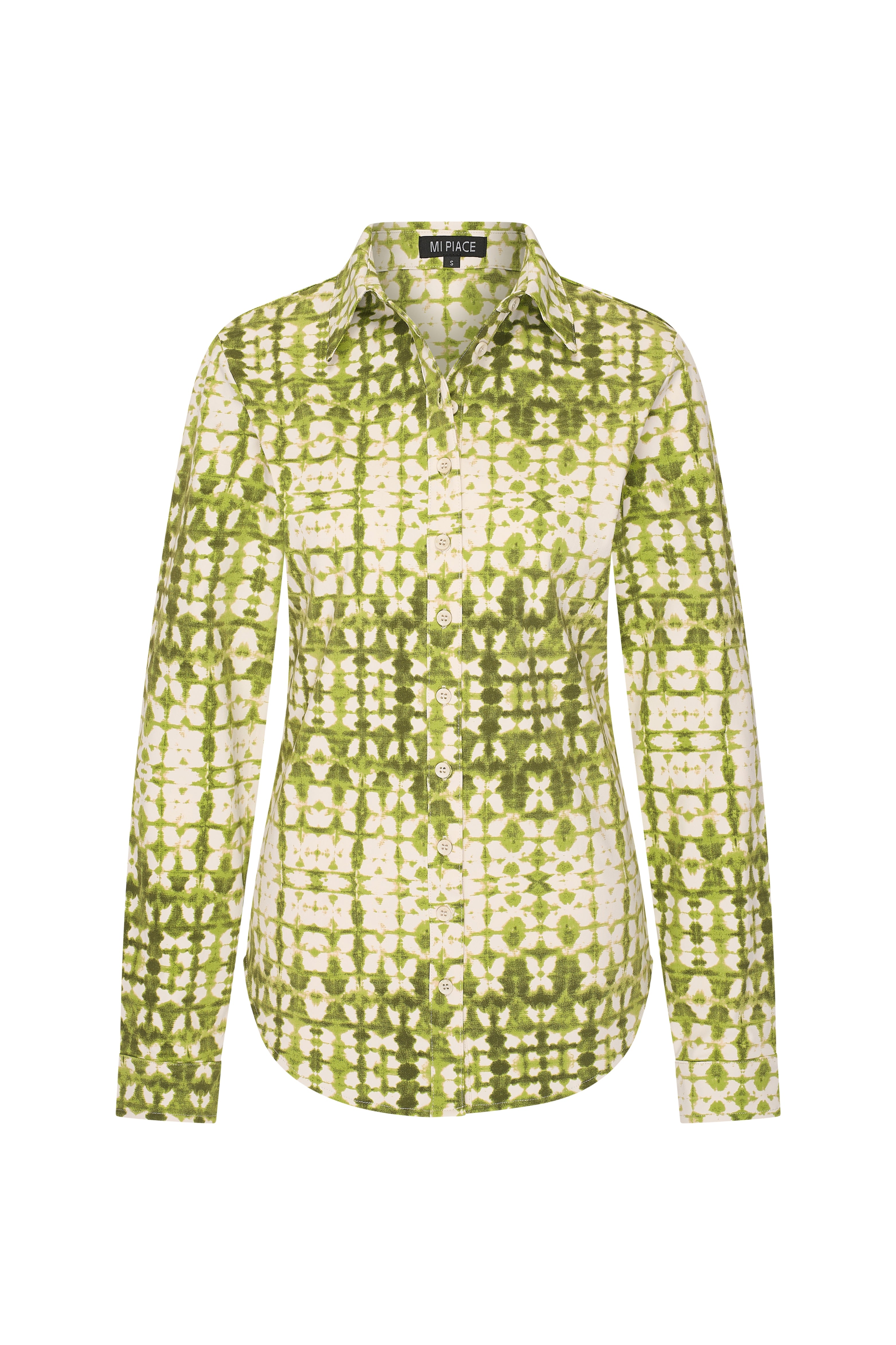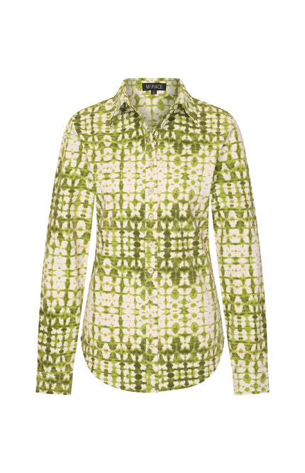 De Travel Blouse van Mi Piace in Batik Print Kelp Forest Kit combineert stijl met comfort. Het speelse patroon en getailleerde pasvorm zorgen voor een flatterende look. Gemaakt van kreukvrije travelstof: ideaal voor werk, vakantie of een dagje uit!