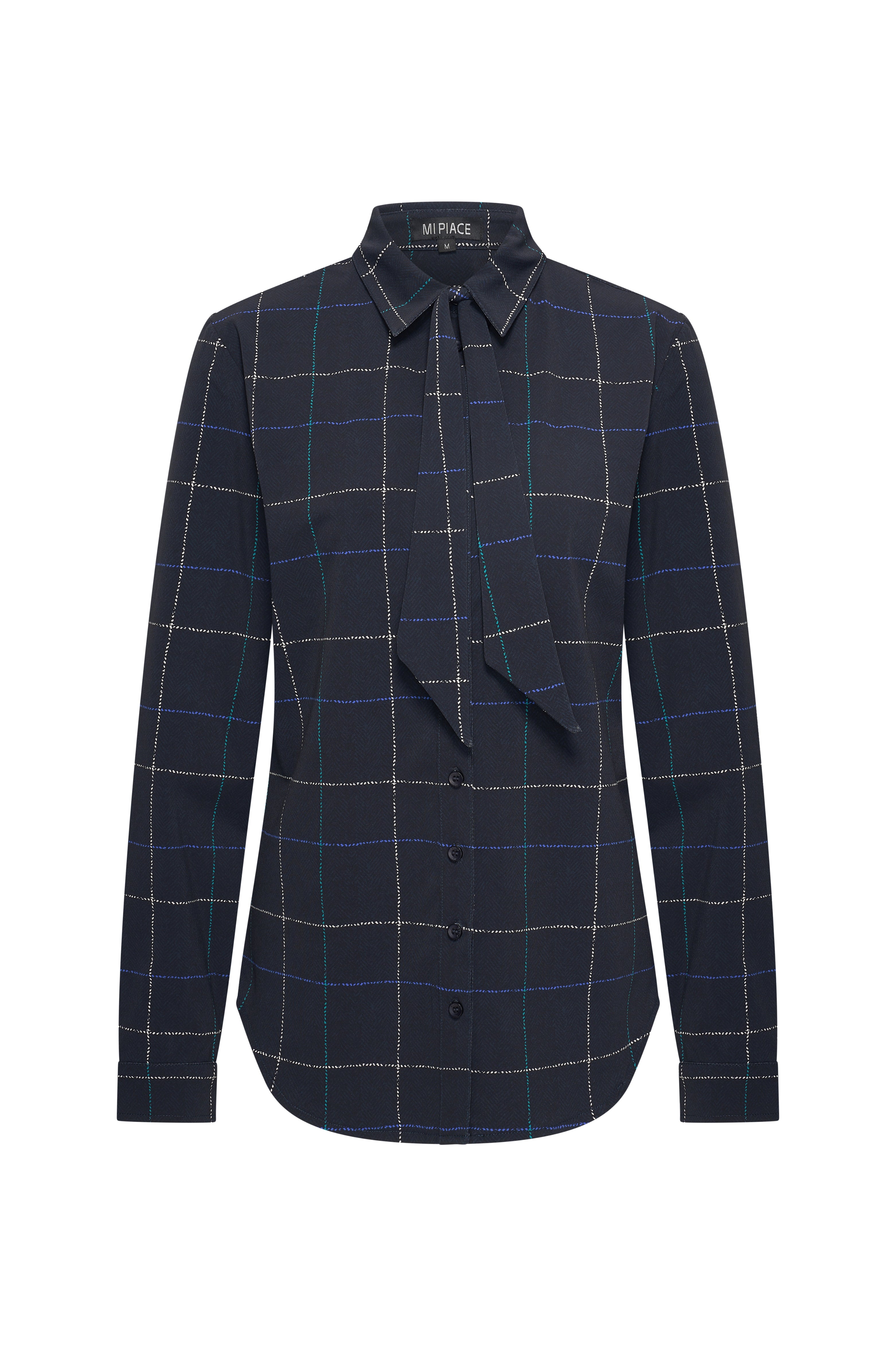 De Travel Blouse Bow Herringbone Print Dark Blue Petrol van Mi Piace is een soepele traveltop met klassieke kraag en lange mouwen. Ruitprint met subtiele visgraat en strikdetail; kreukarm en stretchy. Ideaal voor kantoor en etentjes.
