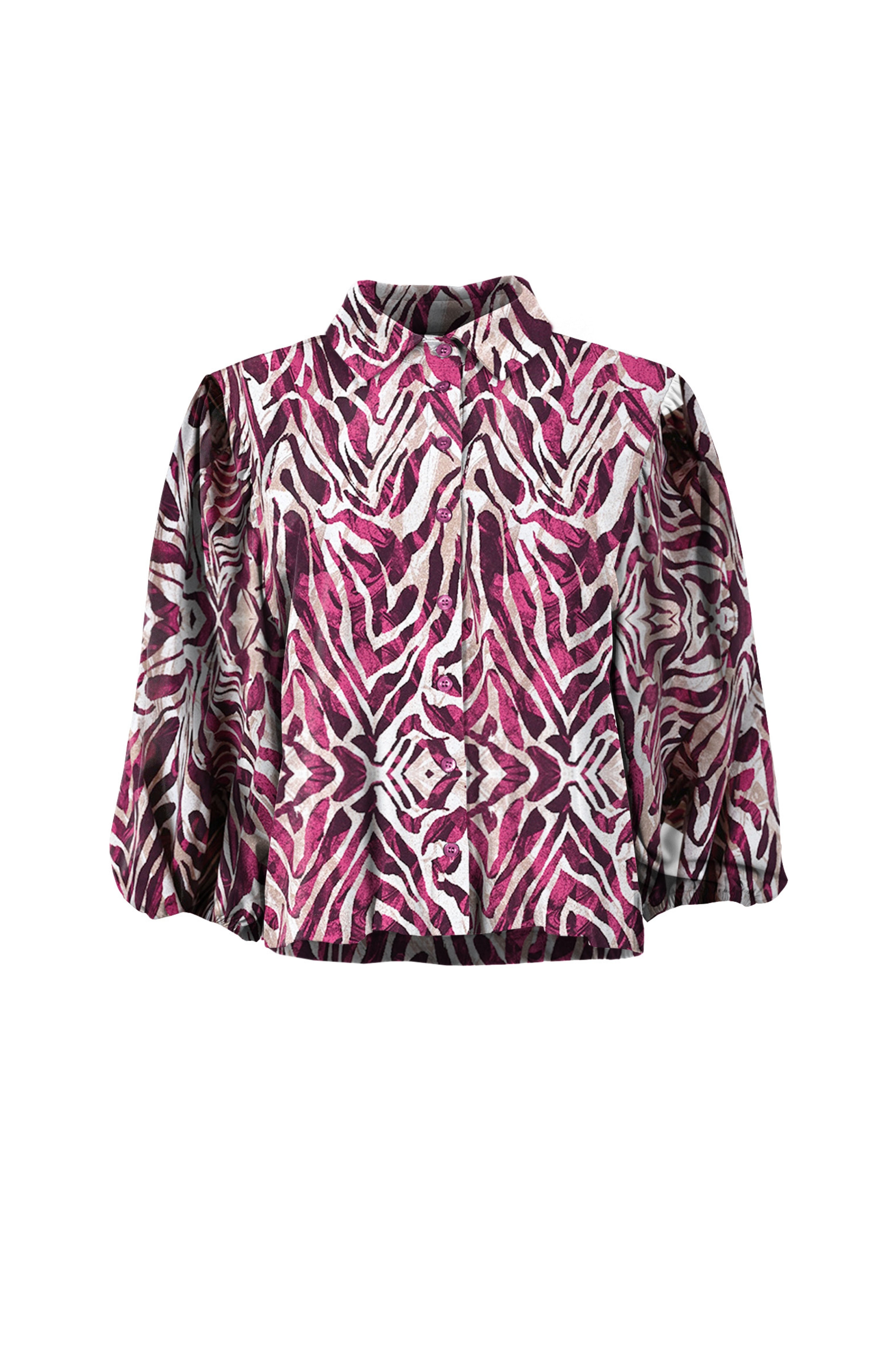De Travel Blouse Larix Zebra Plum van Maicazz is een opvallende blouse met een modieuze zebraprint in krachtige plum-, roze- en wittinten. Dankzij de luchtige travelstof voelt de blouse comfortabel aan, blijft ze kreukvrij en is ze ideaal voor zowel dagelijks gebruik als voor onderweg.
