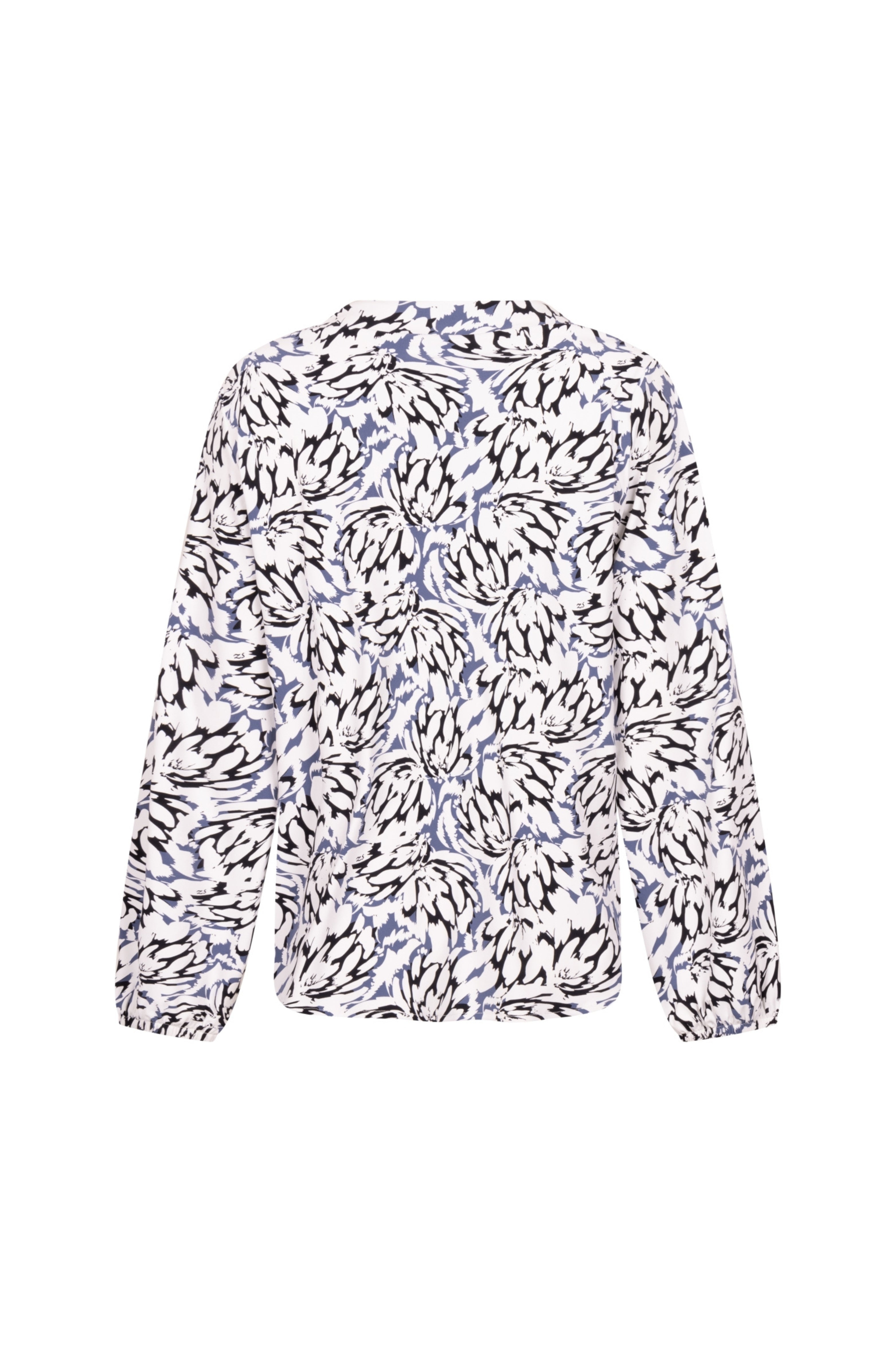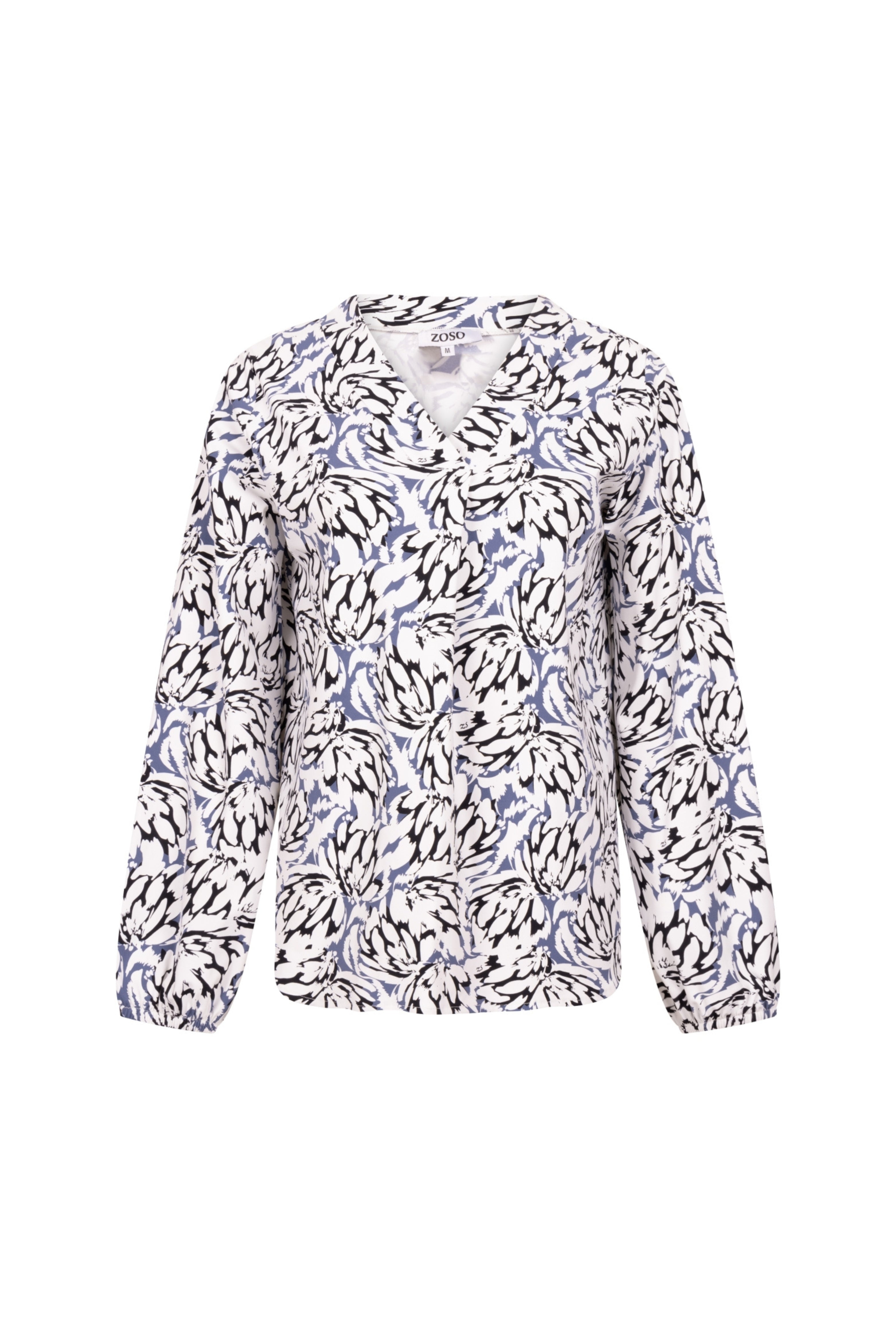 De Travel Blouse Merel Offwhite Navy van ZOSO is een stijlvolle damesblouse met een speelse all-over print in offwhite, navy en subtiele lichtblauwe accenten. Het ontwerp heeft een vrouwelijke V-hals zonder kraag en lange mouwen met elastische manchetten voor een comfortabele pasvorm.