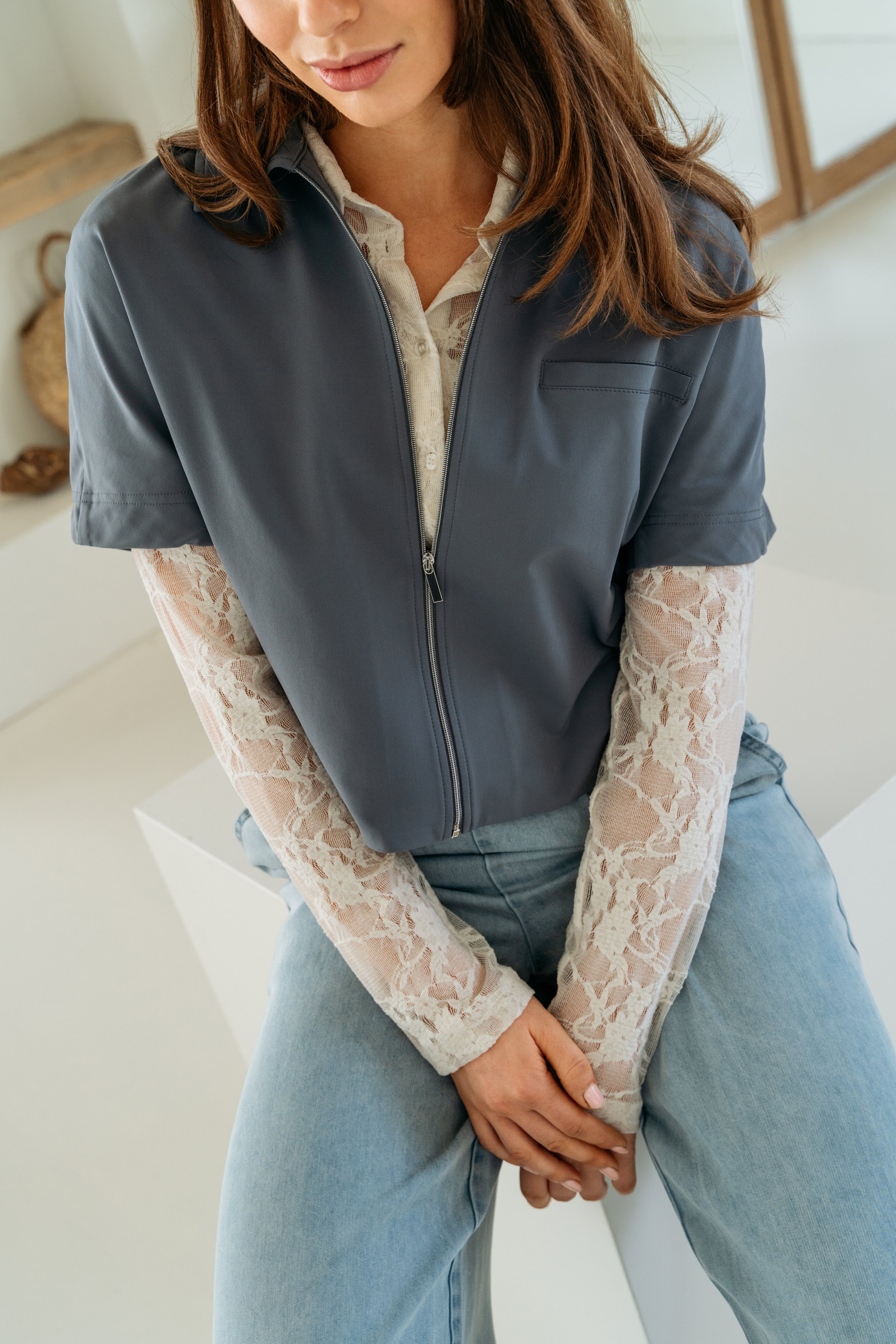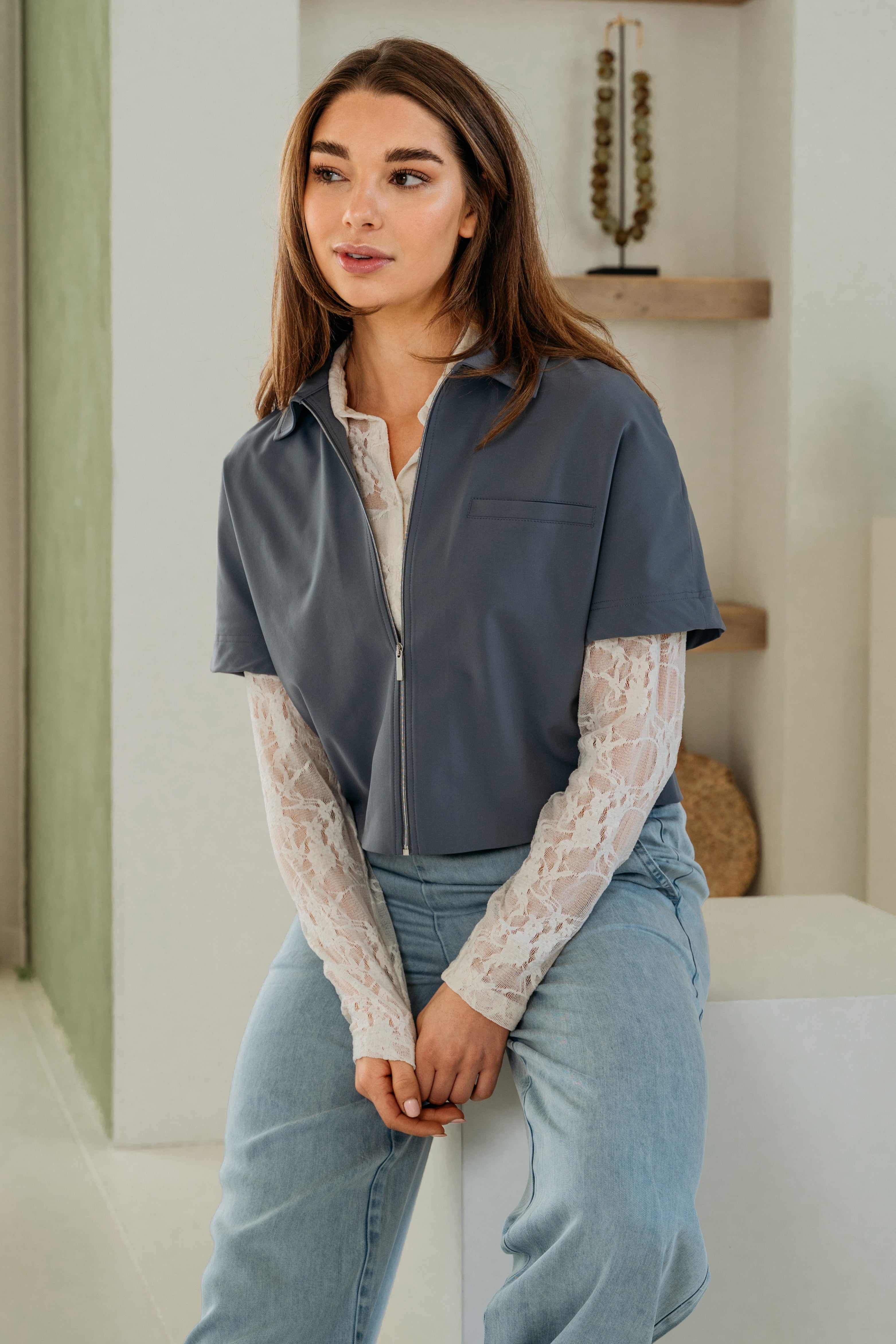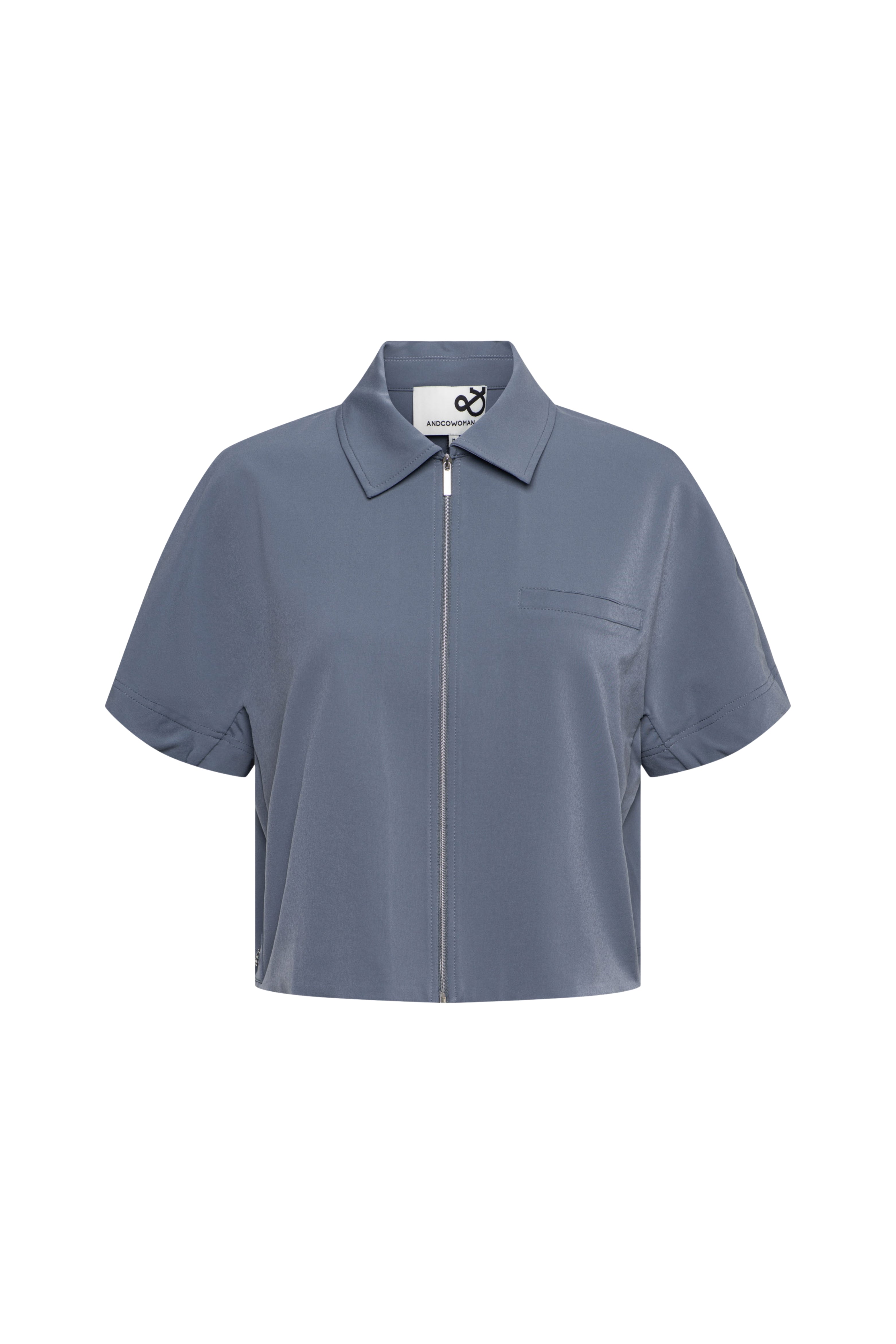 De Travel Blouse Peike Dark Slate van &Co woman is een moderne blouse met klassieke kraag. De gladde travel-look en praktische ritssluiting maken het item tijdloos en kreukarm. Perfect voor werk en onderweg.
