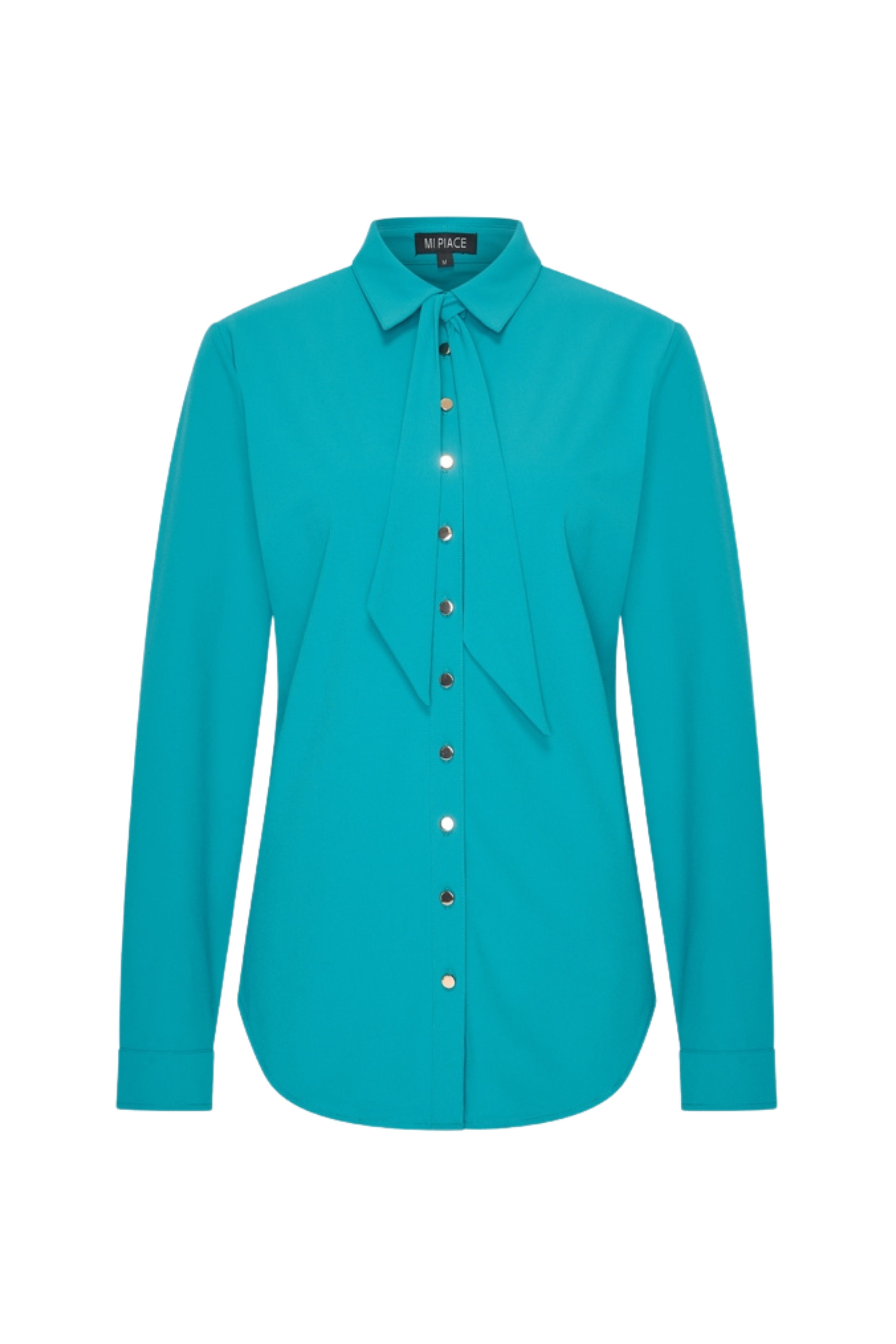 De Travel Blouse Petrol van Mi Piace is een soepele traveltop met klassieke kraag en lange mouwen. Strikdetail langs de knoopsluiting en kreukarme stretch. Ideaal voor kantoor en reizen.