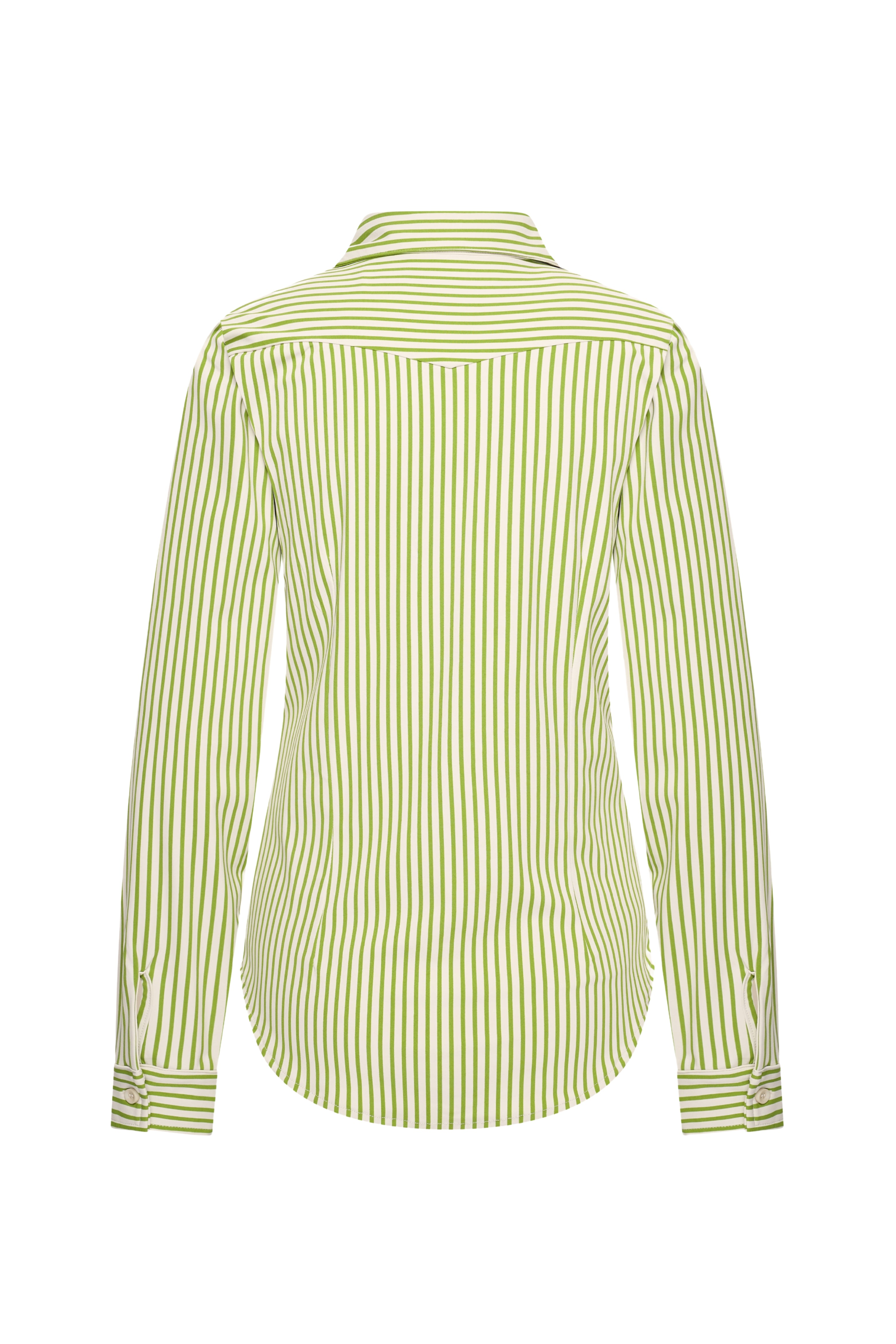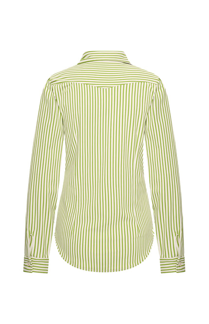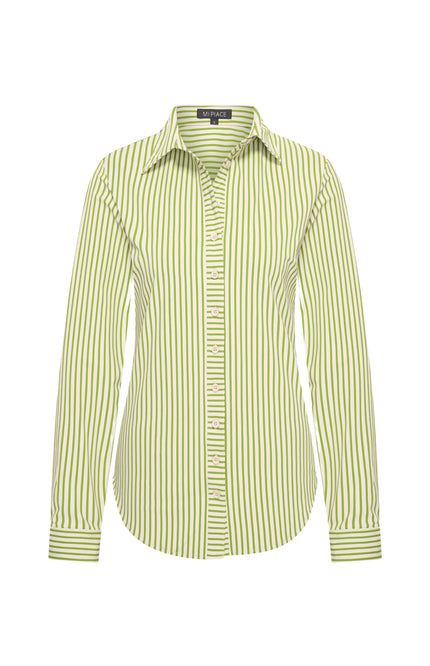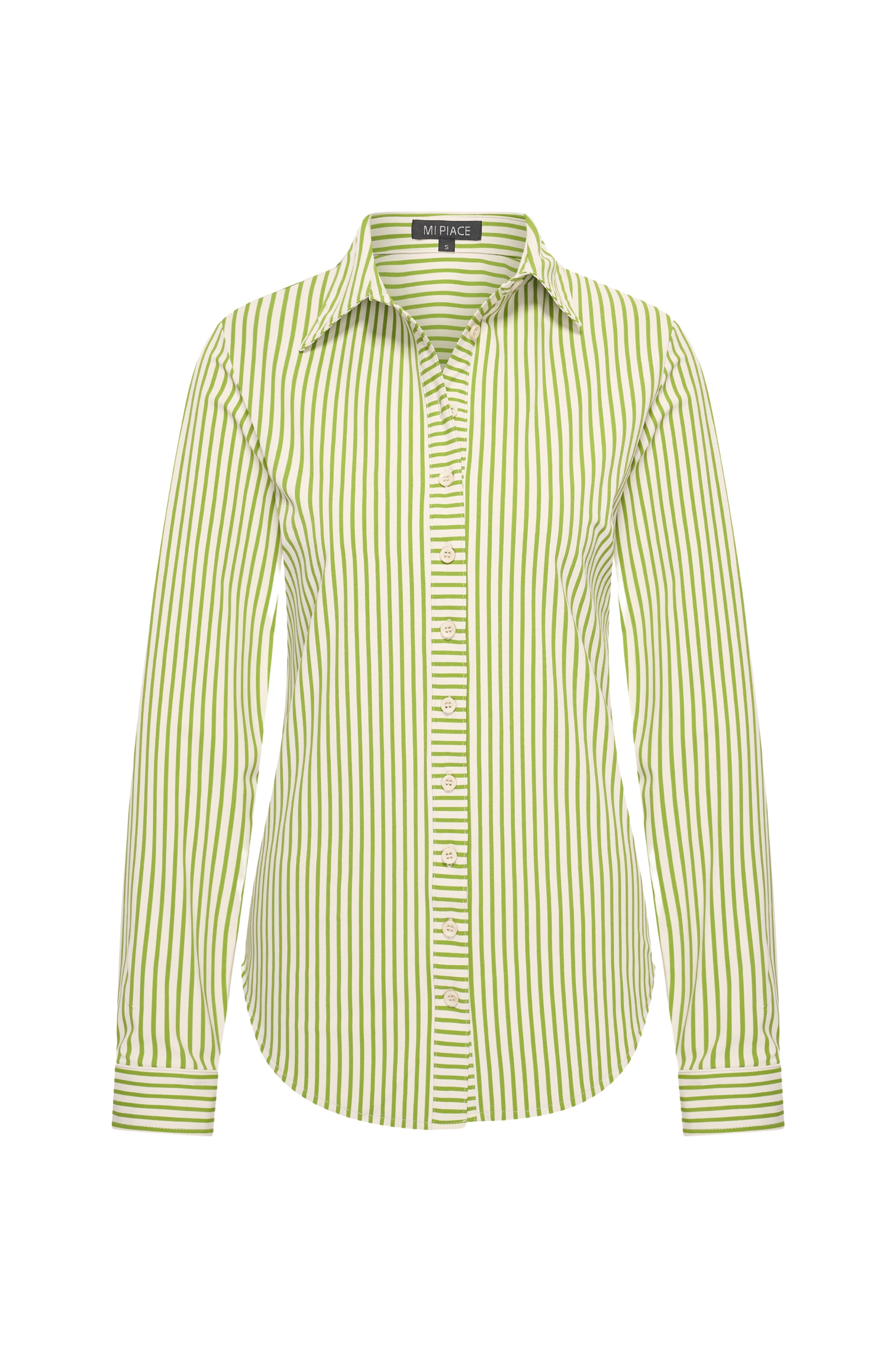 De Travel Blouse Streep Print Kelp Forest Kit van Mi Piace is een stijlvolle blouse met verticale strepen, lange mouwen en een klassieke kraag. Gemaakt van comfortabele travelstof.