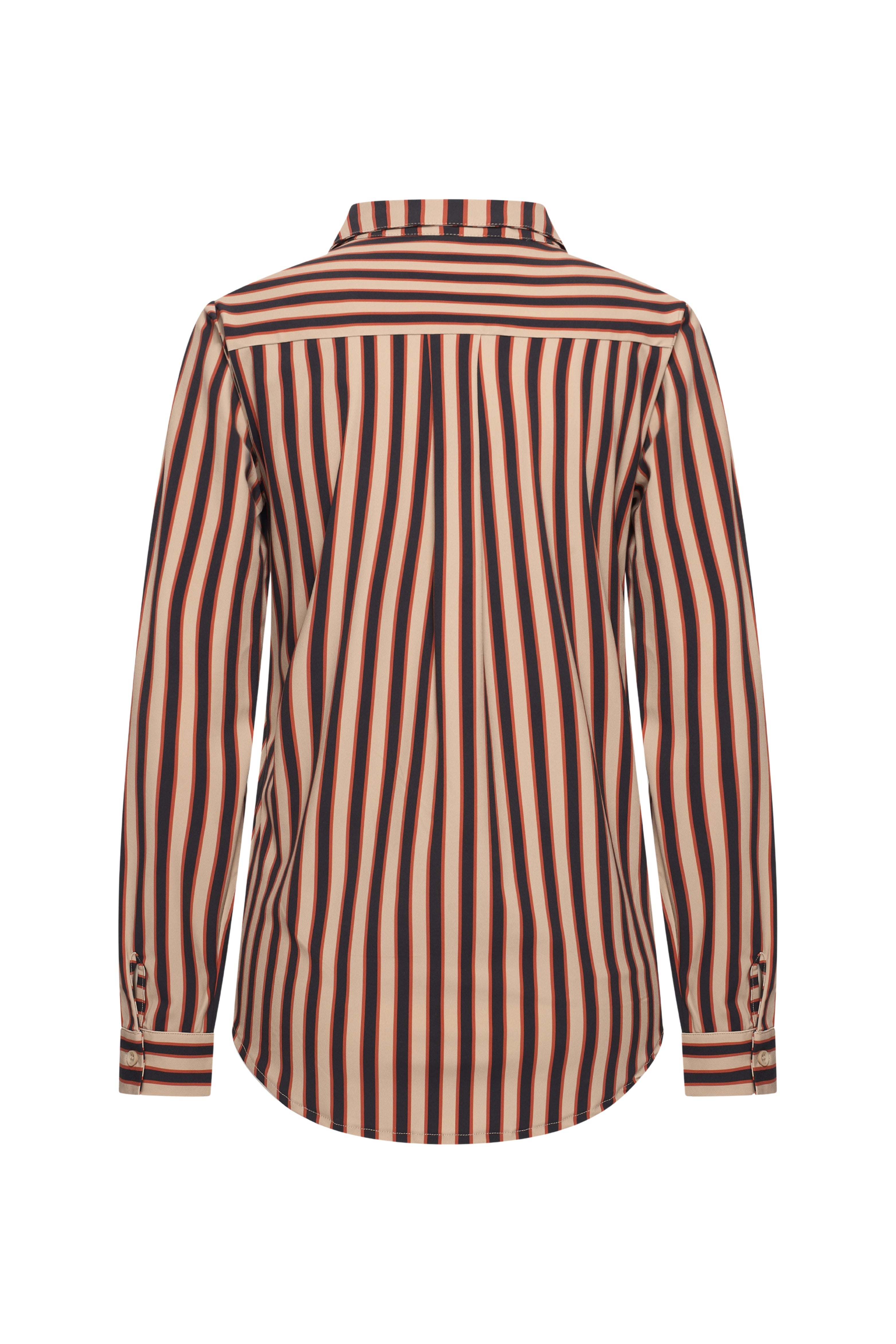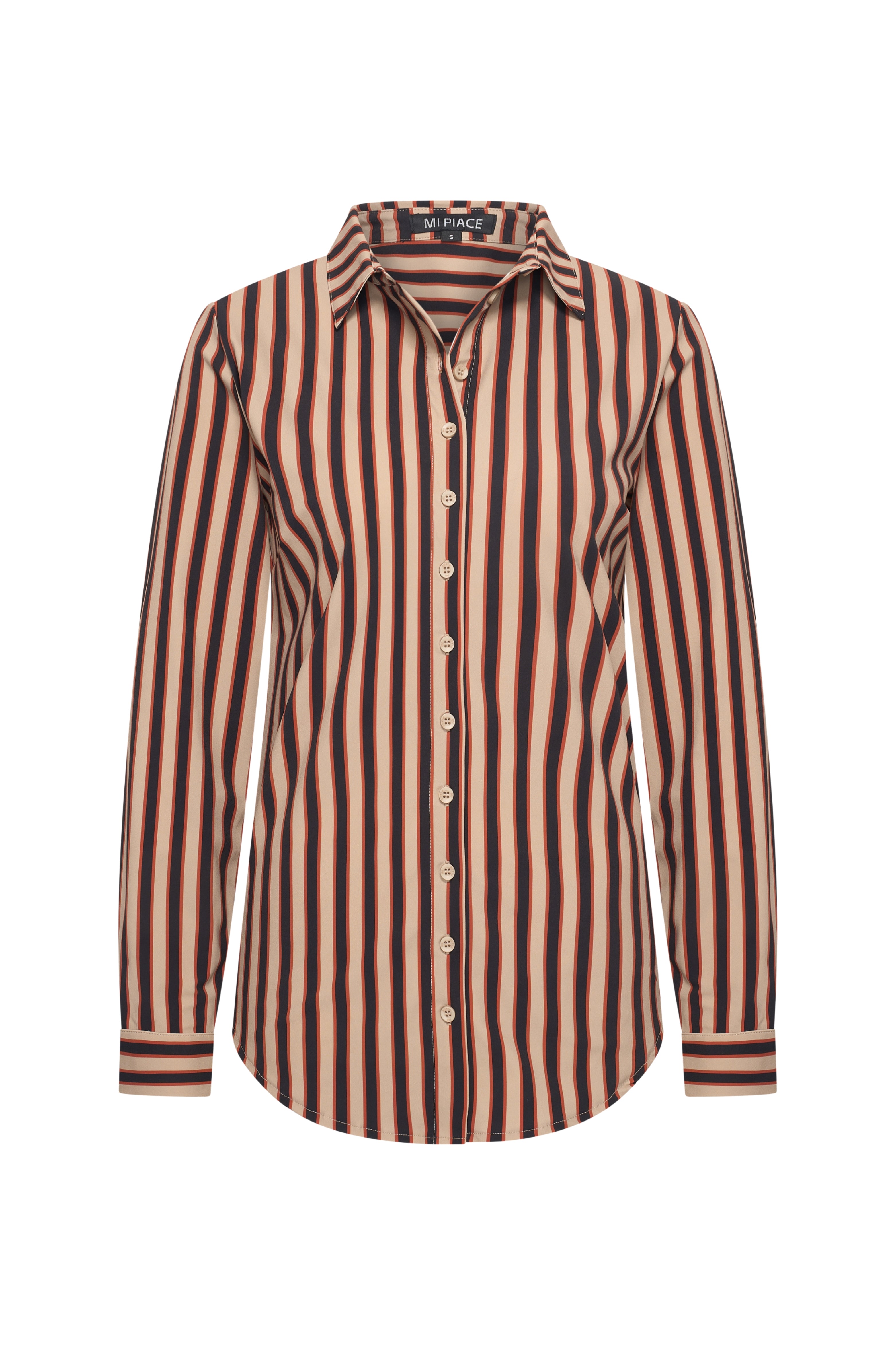 Travel Blouse Stripe Print Espresso Latte van Mi Piace is een stijlvolle blouse in travelstof met een moderne twist. Het bruine streepdessin met rode accenten geeft een frisse, eigentijdse uitstraling. Afgewerkt met een knoopsluiting en kraag voor een klassieke look.