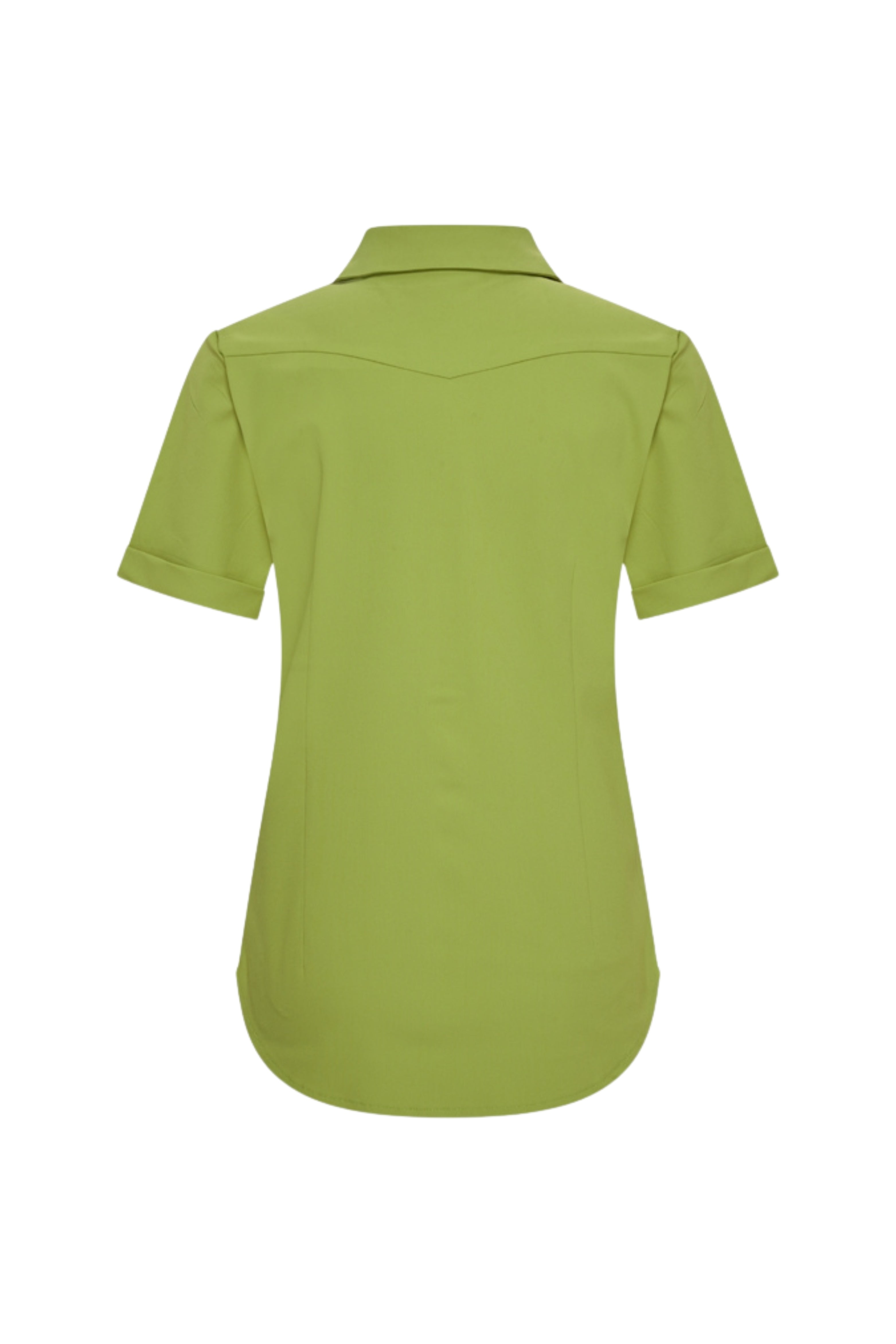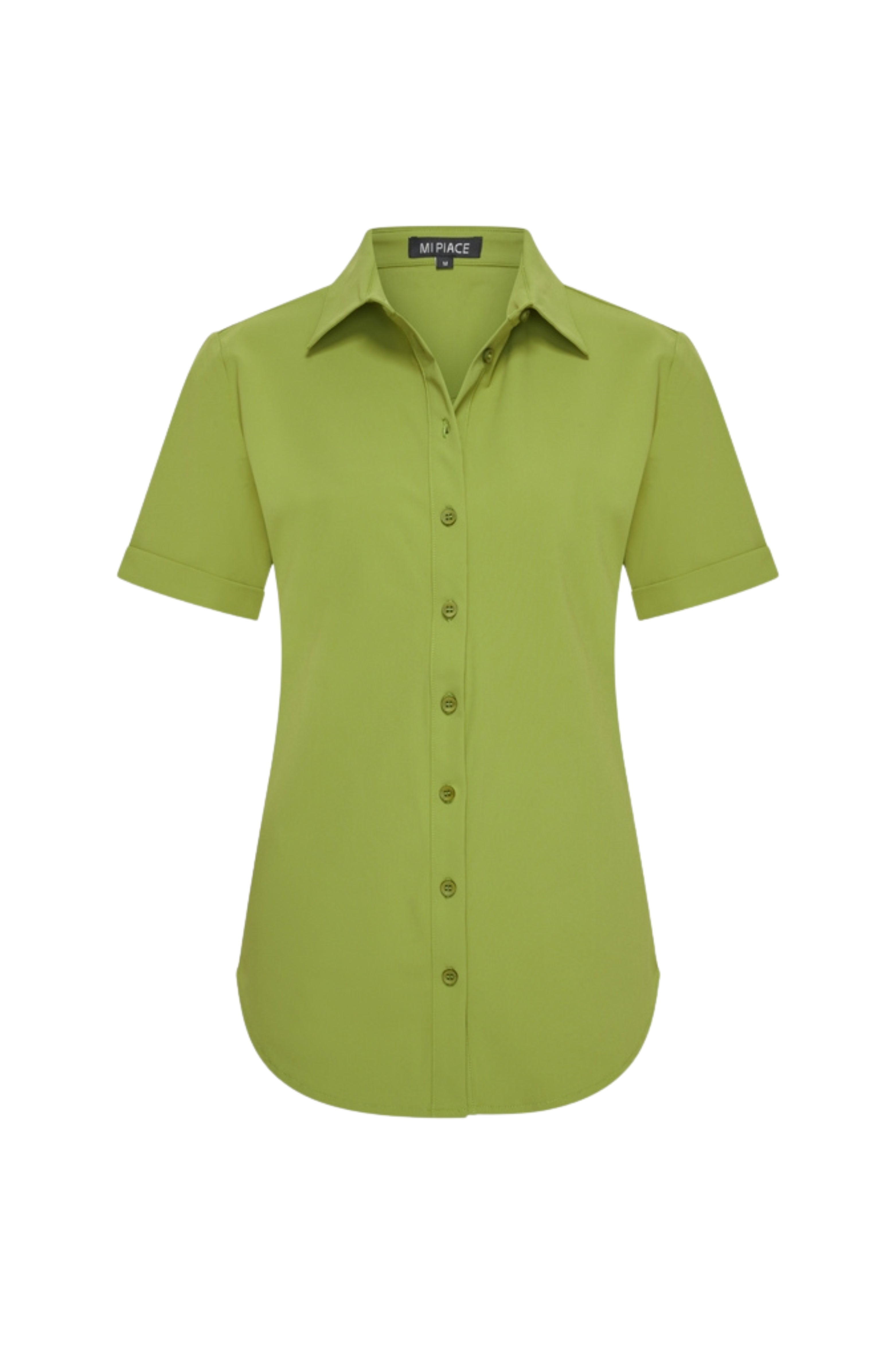 Travel Blouse Turtle Green van Mi Piace is een stijlvolle blouse met een frisse en moderne uitstraling. De comfortabele travelkwaliteit zorgt voor een soepele valling en prettig draagcomfort. De klassieke kraag, doorknoopsluiting en korte mouwen geven dit model een verzorgde en veelzijdige look.