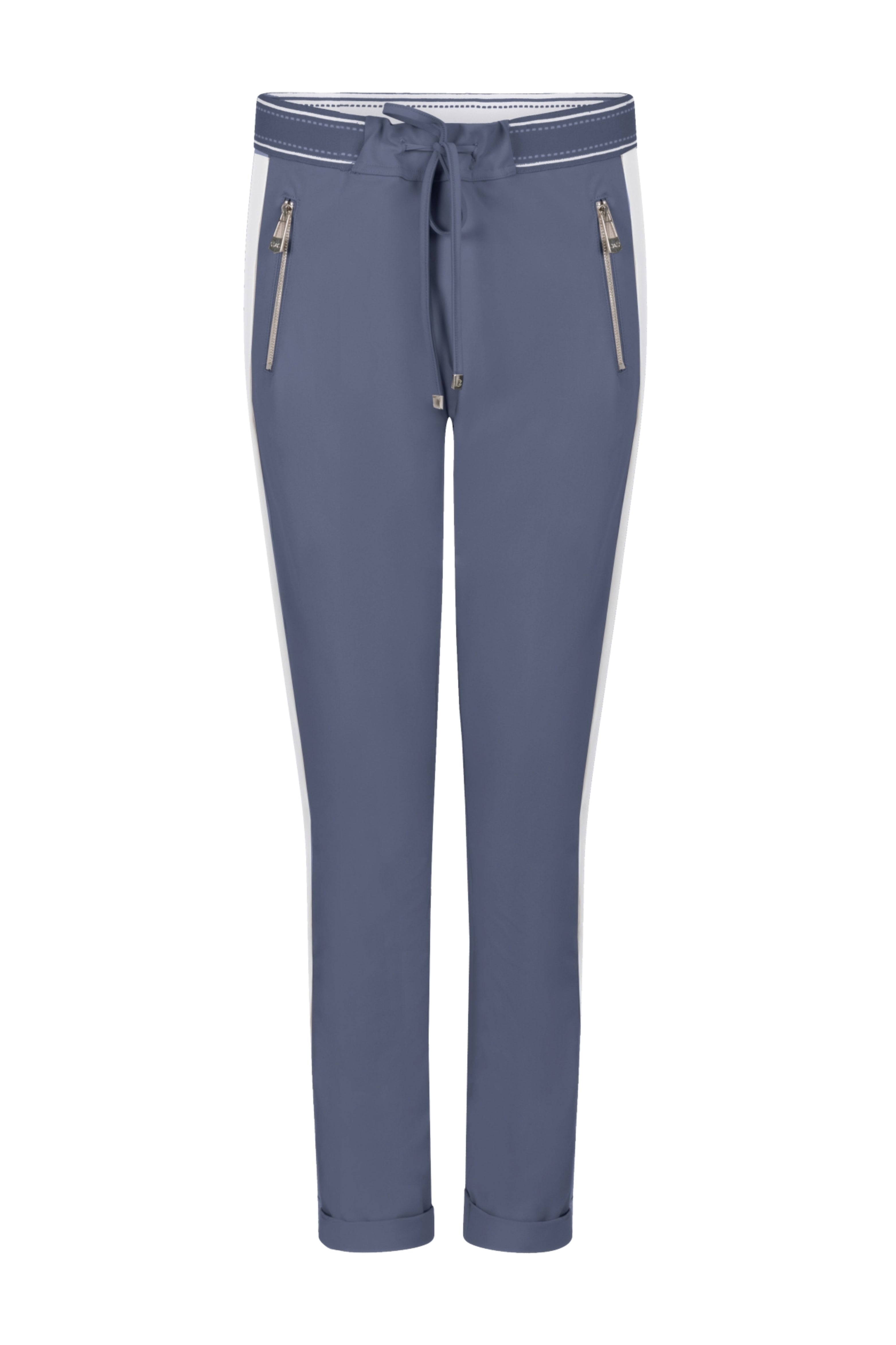 Travel Broek Eve Blue van Zoso is een comfortabele en sportieve broek met een elastische tailleband en strikkoord. De smalle pasvorm, sierlijke bies langs de zijkant en ritszakken geven de broek een moderne en stijlvolle uitstraling.