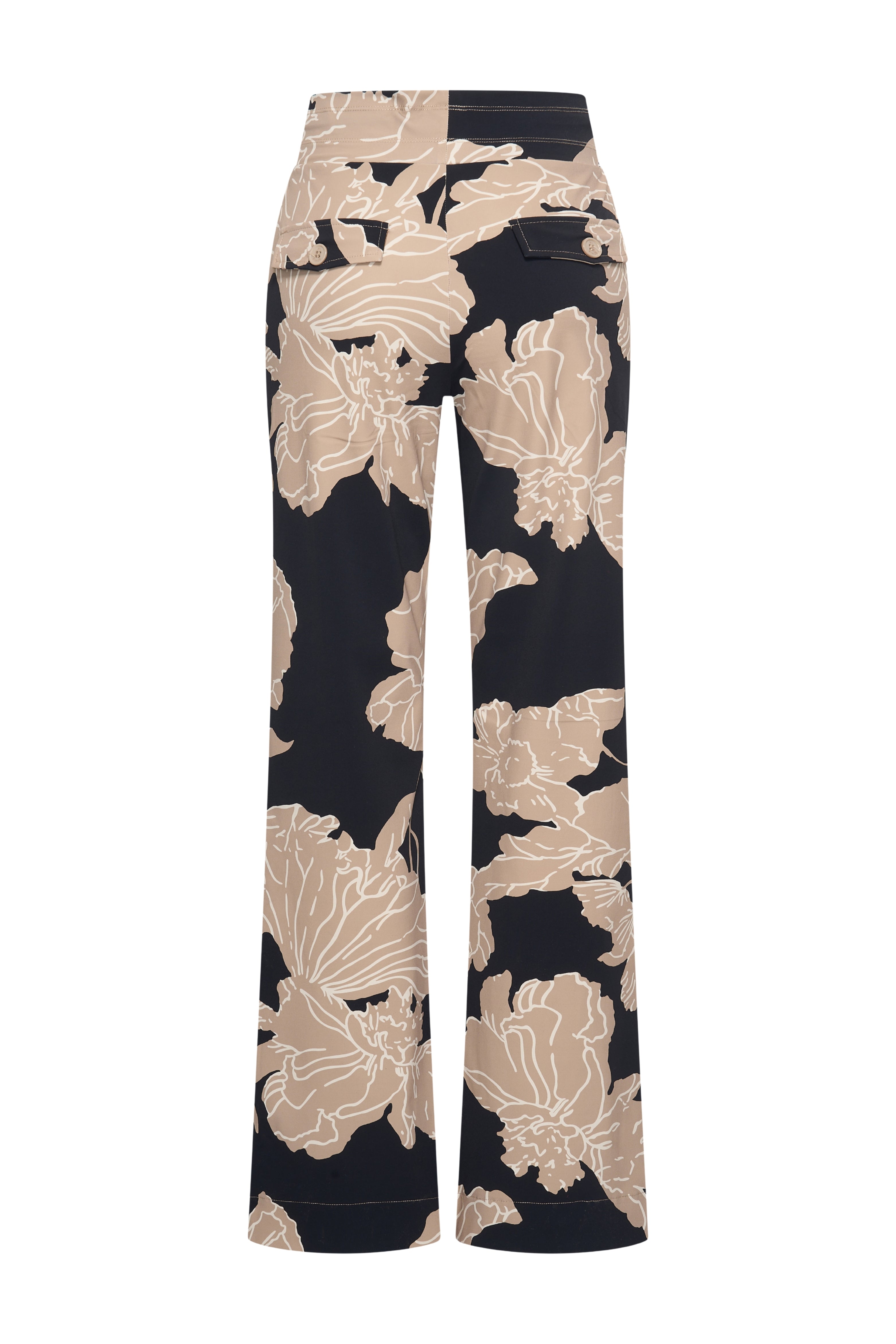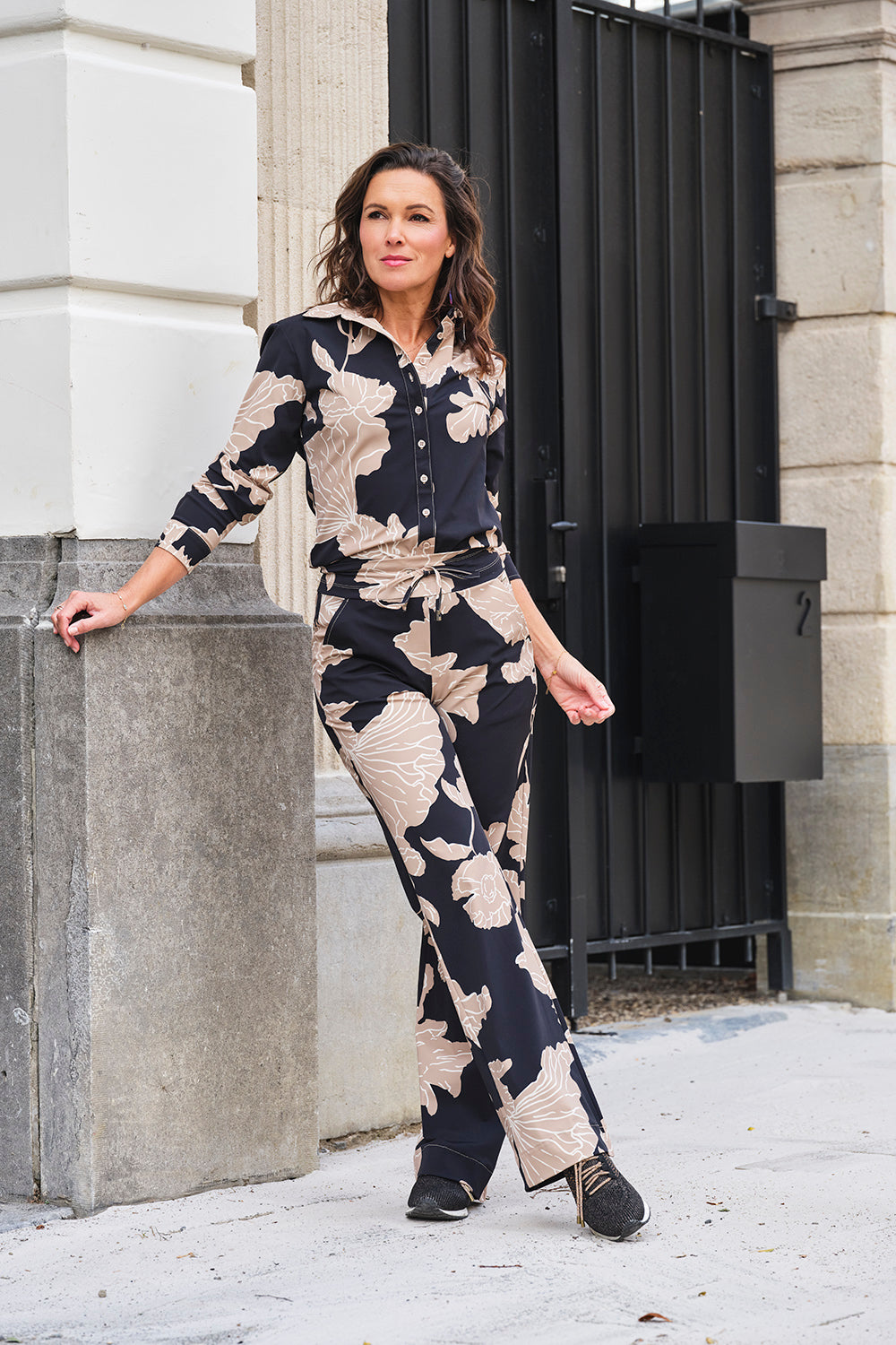 De Travel Broek Flared Big Flower Print Black van Mi Piace is een elegante broek met uitlopende pijpen, gemaakt van comfortabele travelstof. Ideaal voor een stijlvolle look, combineerbaar met blouses, tops of blazers. Kreukvrij en onderhoudsvriendelijk.