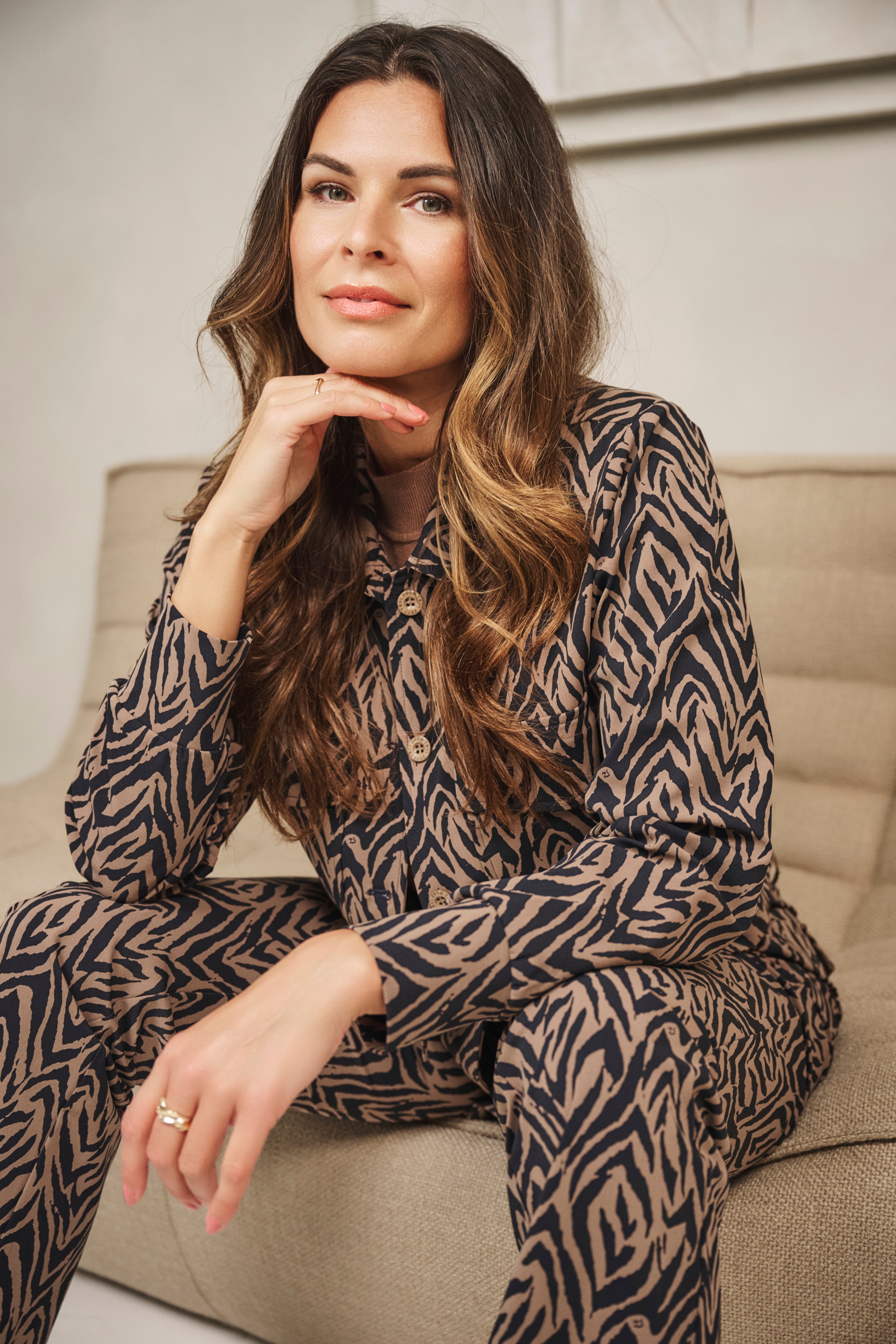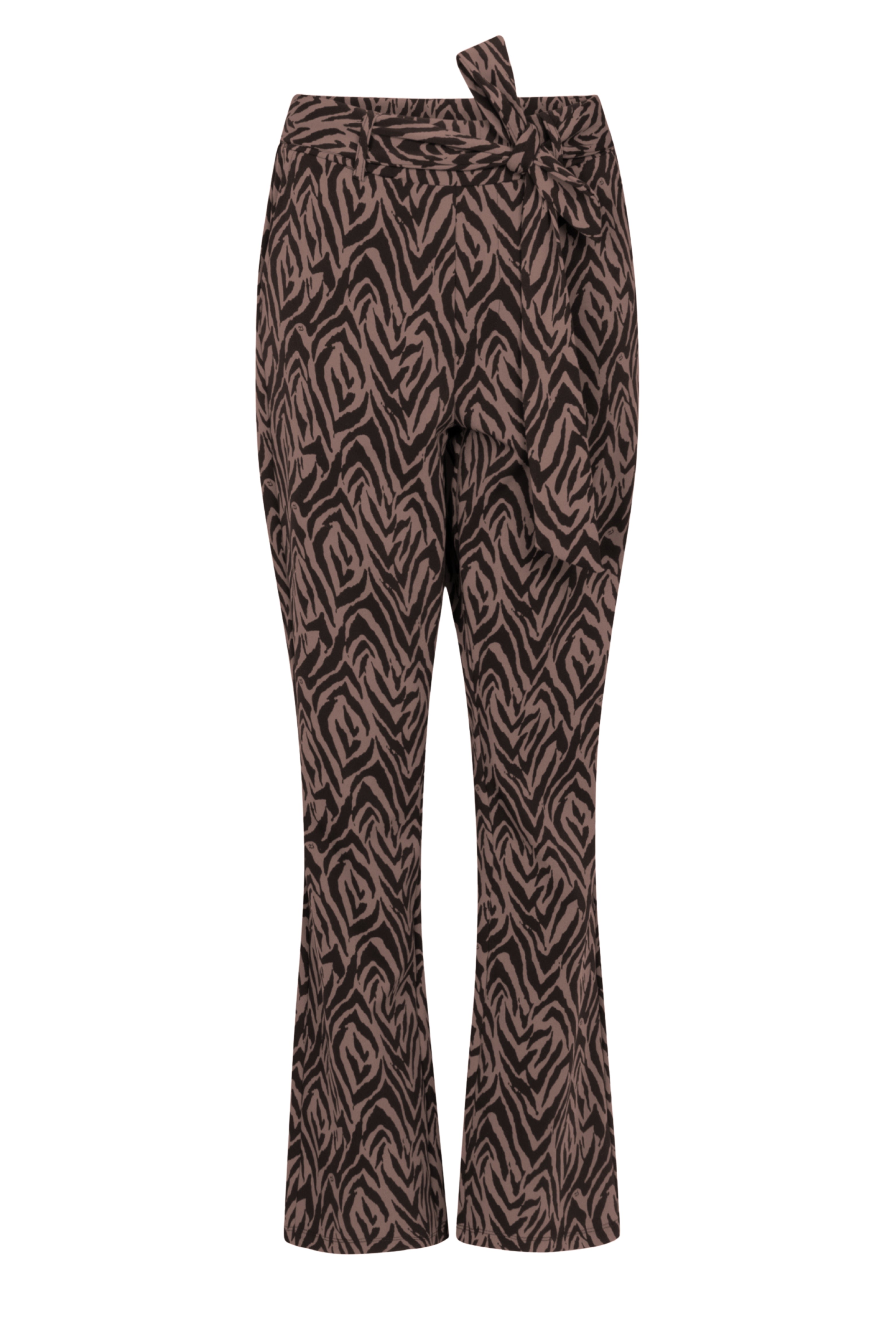 Travel broek Marceline Mocha Navy van Zoso is een stijlvolle musthave met een opvallende zebraprint. De flared pijpen en strikceintuur geven een flatterende pasvorm, ideaal voor zowel casual als geklede looks.