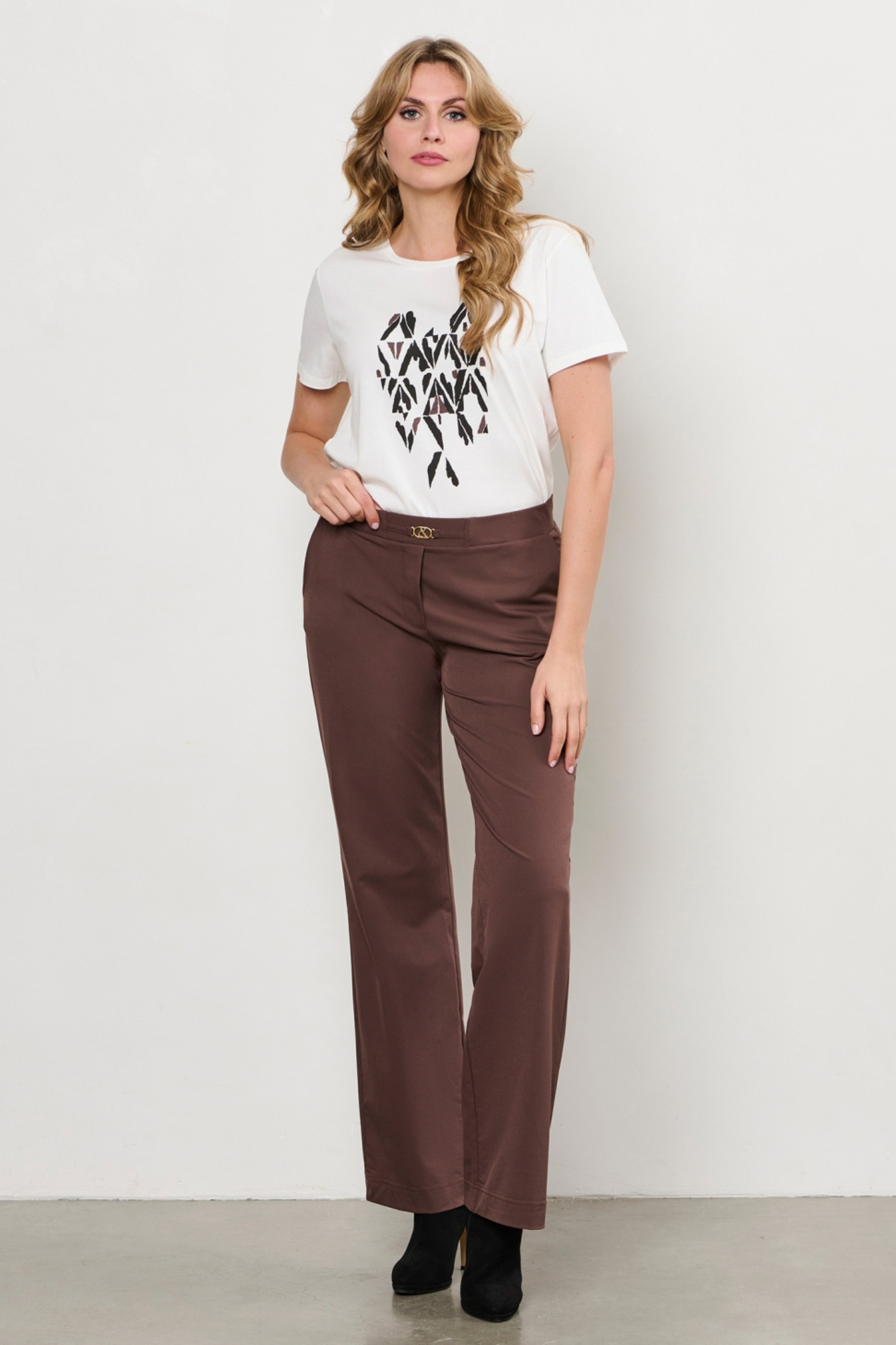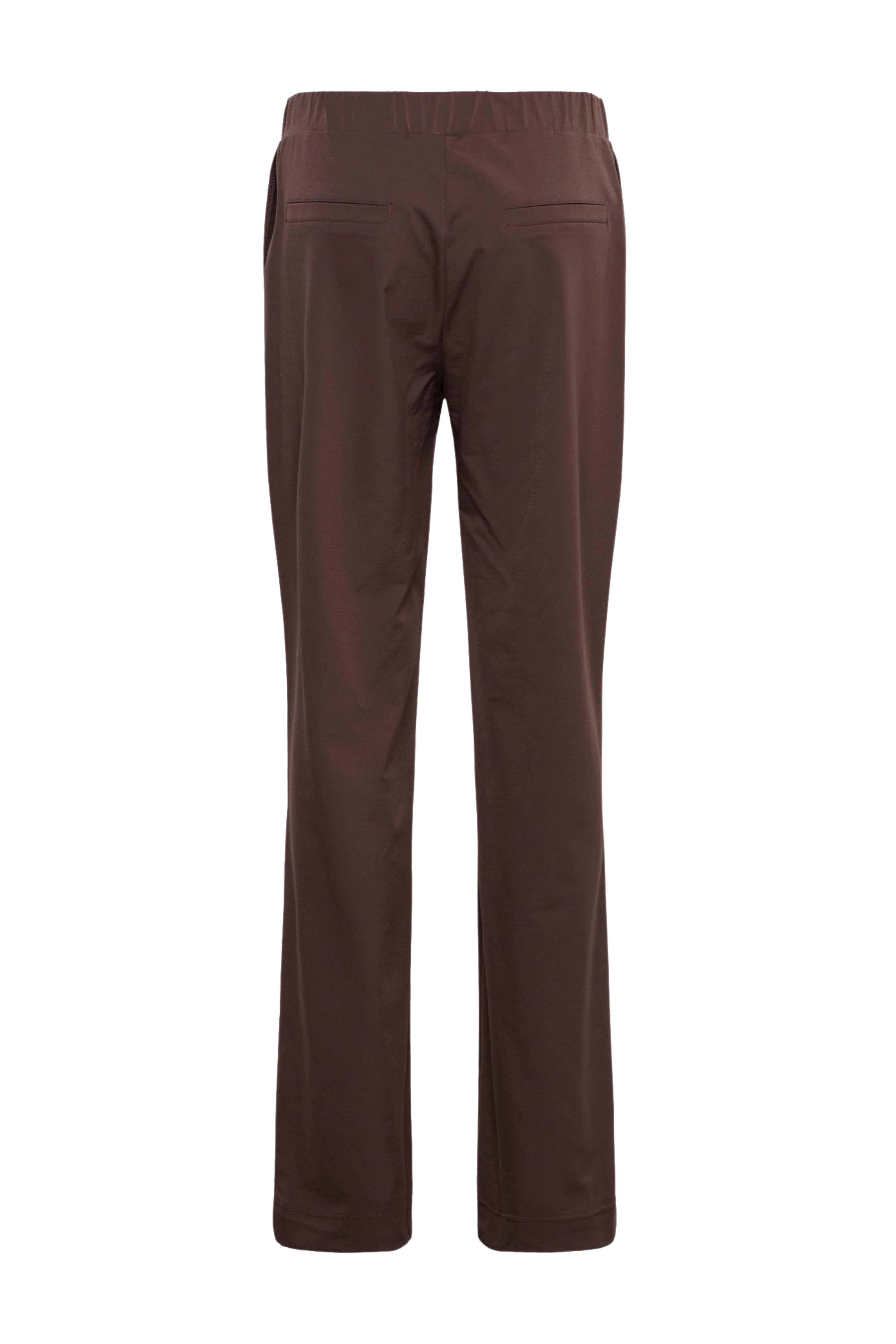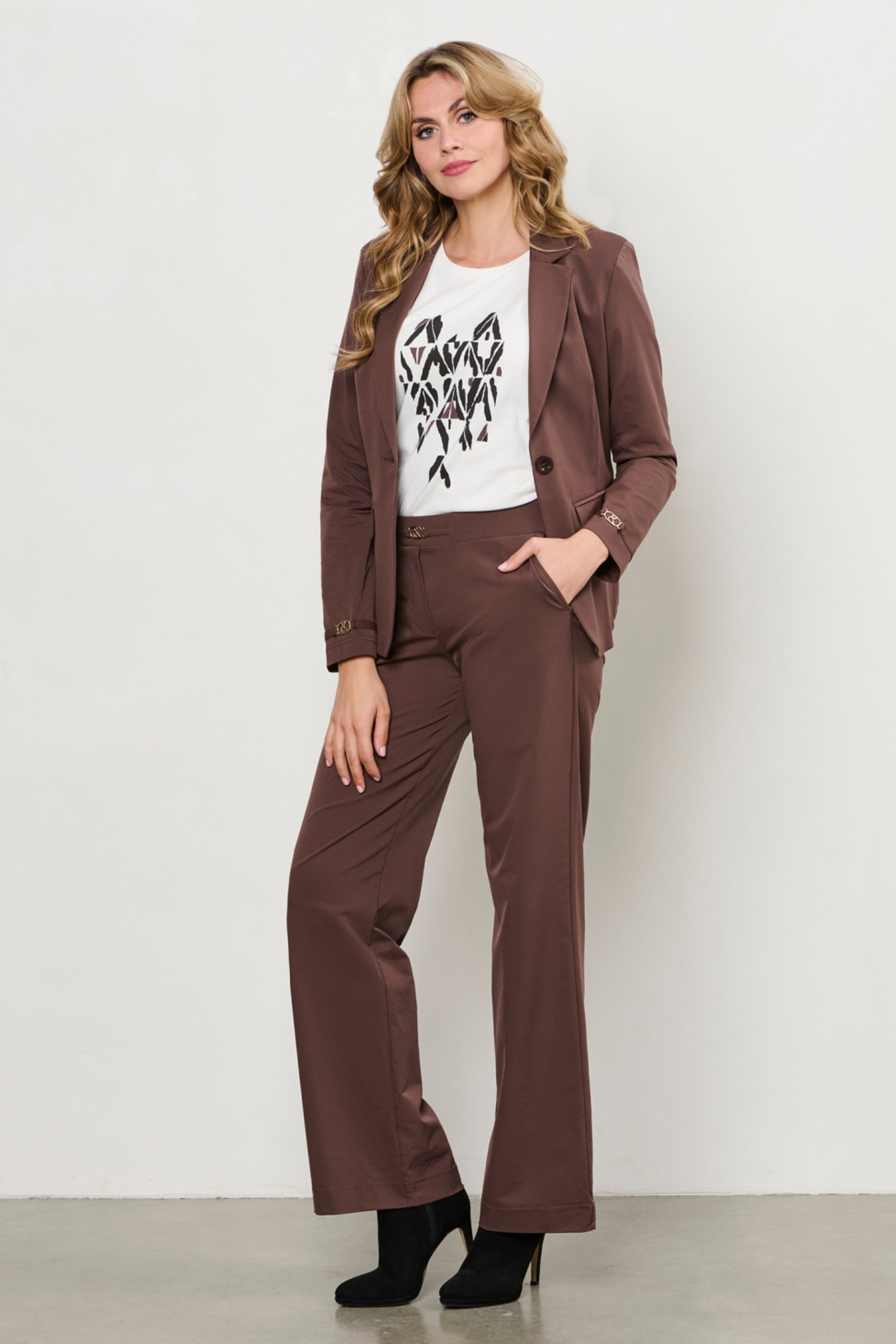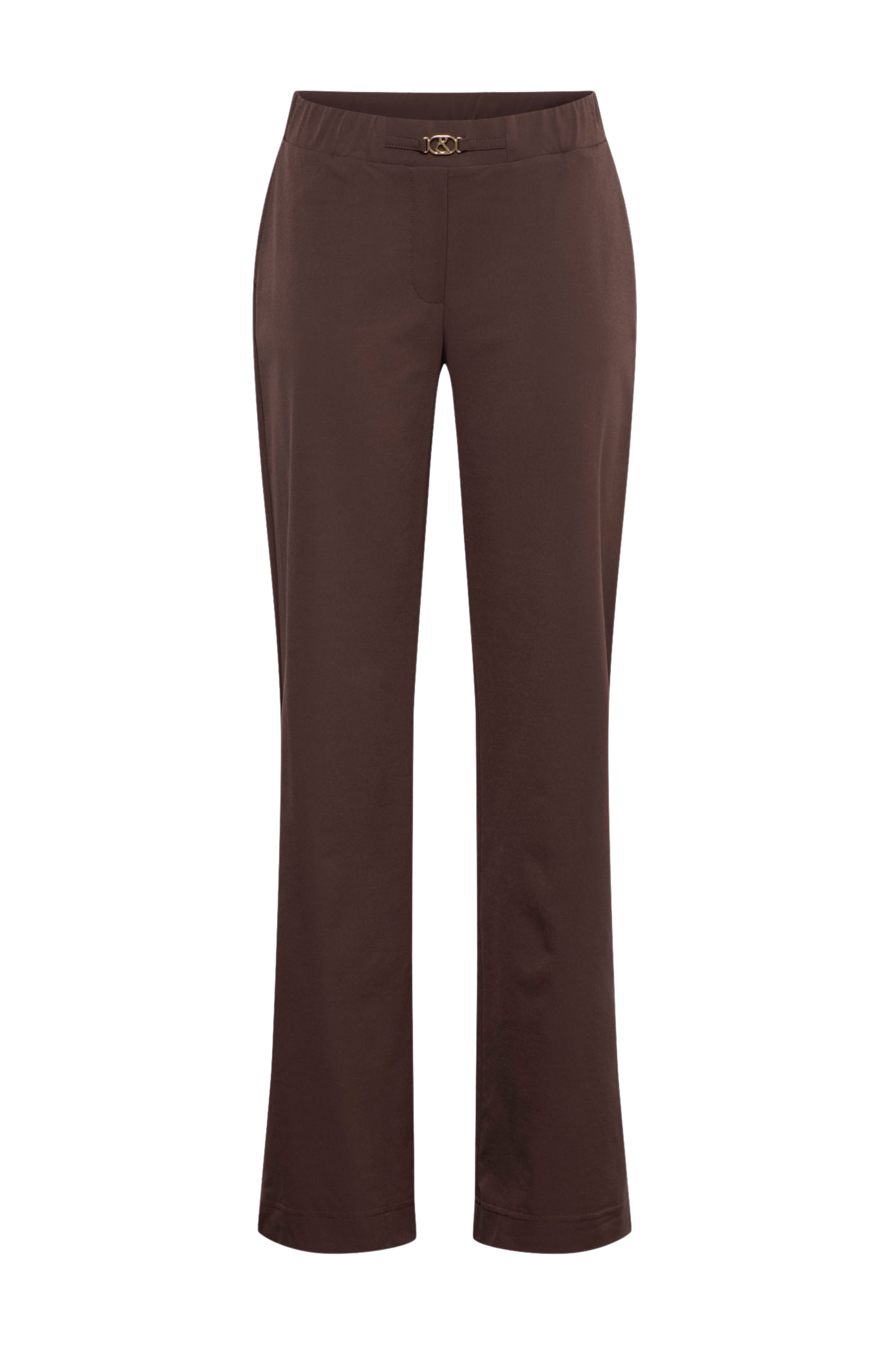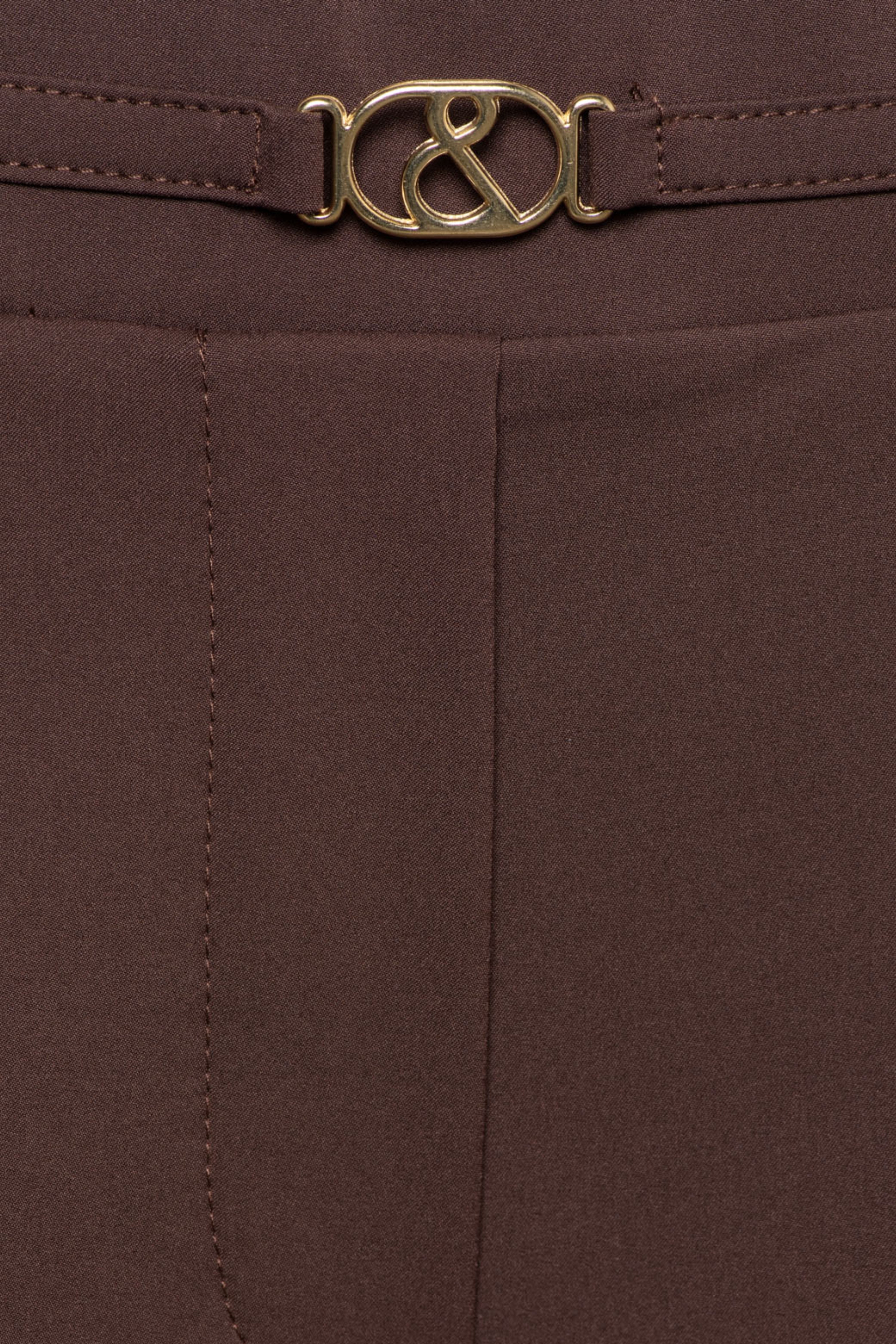 Travel Broek Perrine Chocolate van &Co Woman is een elegante broek met een aangesloten pasvorm en subtiele flare. Gemaakt van comfortabele stretch travelstof die mooi aansluit en soepel valt. De goudkleurige siergesp in de taille zorgt voor een elegant detail.