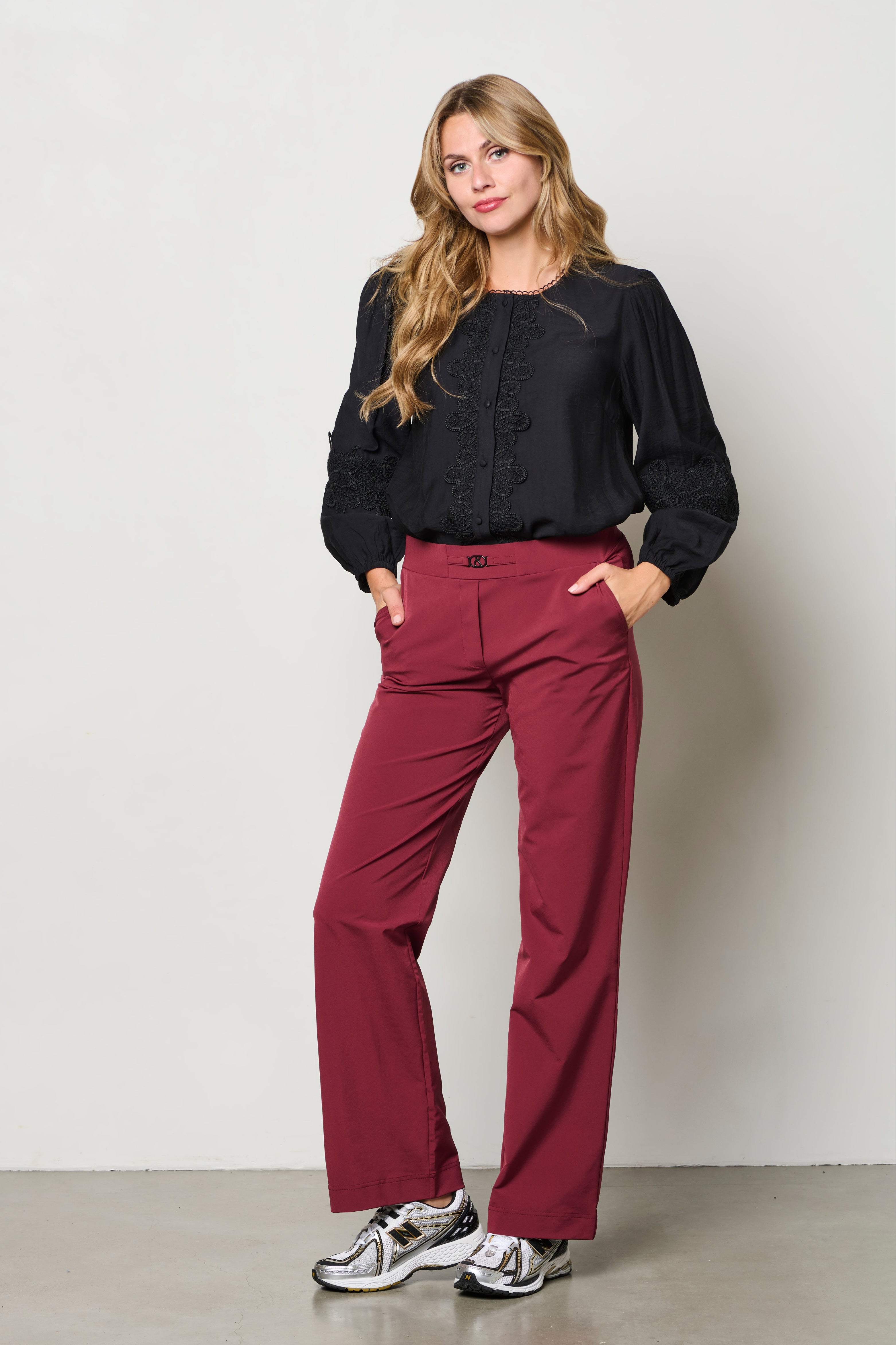 De Travel Broek Perrine Wine Red van &Co Woman is een elegante flared broek in comfortabele travelkwaliteit. De rijke rode tint en uitlopende pijpen geven elke look een stijlvolle boost.
