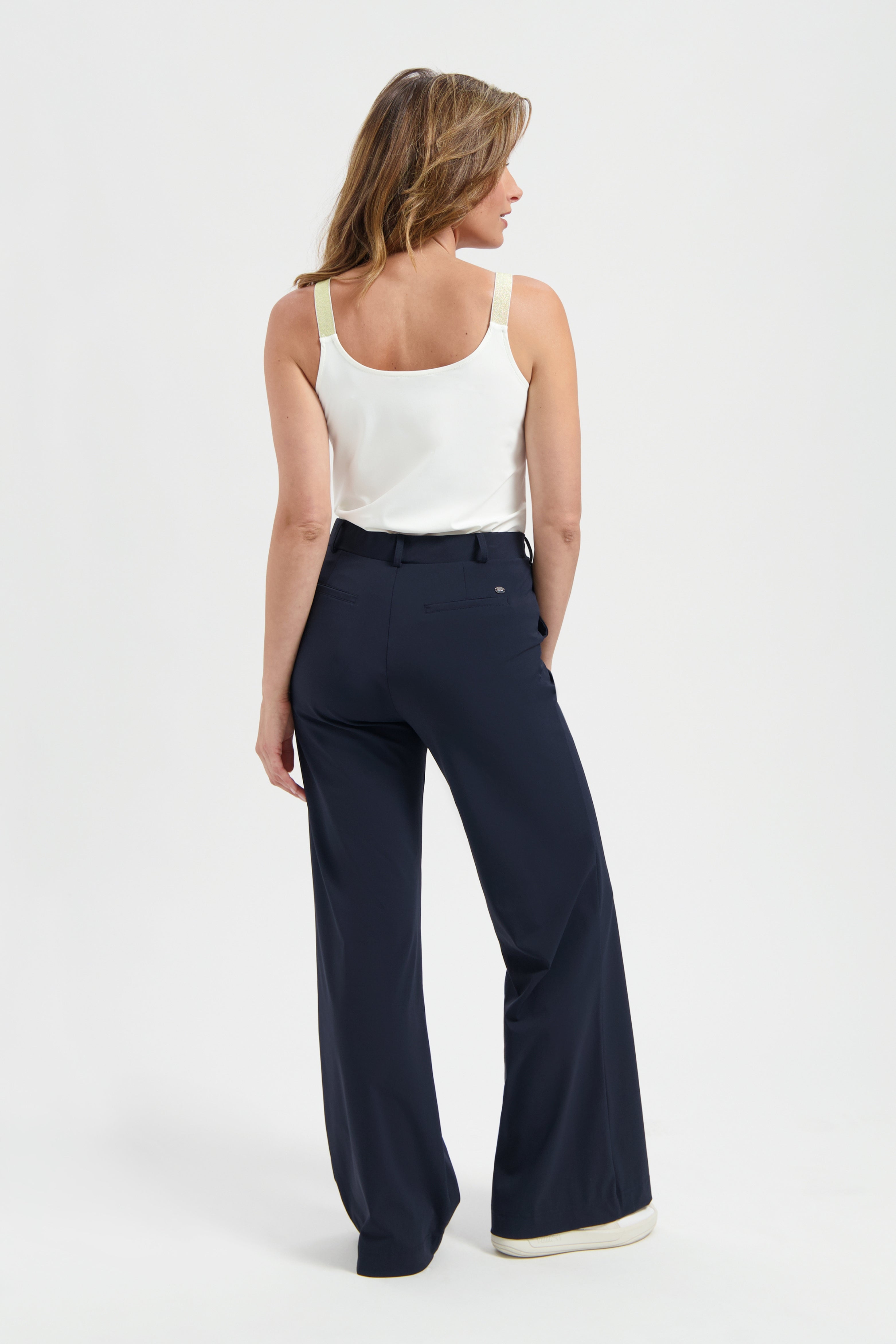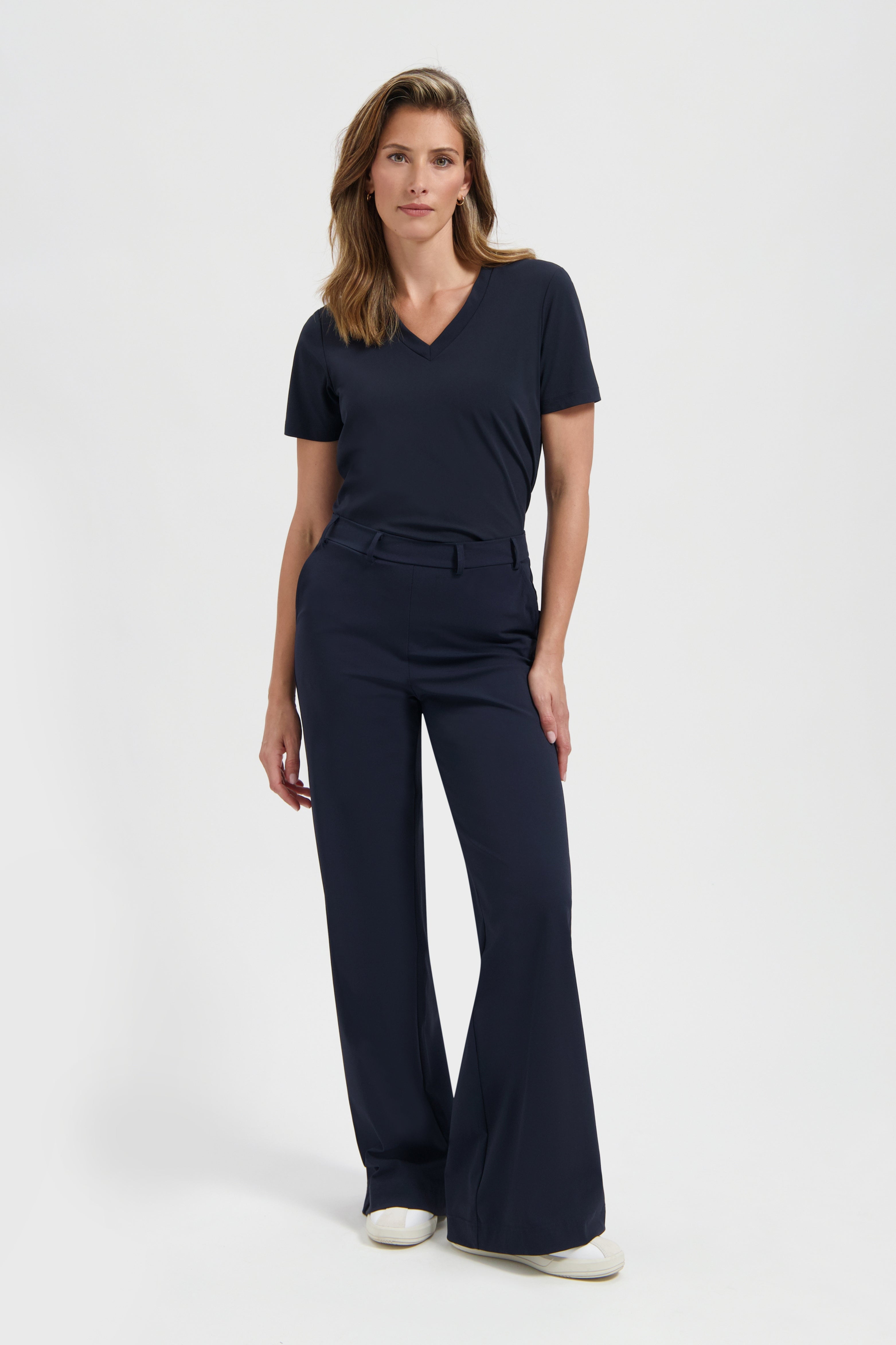 De Travel Broek Phoenix Blue van Lady Day is een comfortabele travelbroek met hoge taille. Van stretchy Travelstof en de flared pijpen geven lengte. Perfect voor kantoor en reizen.