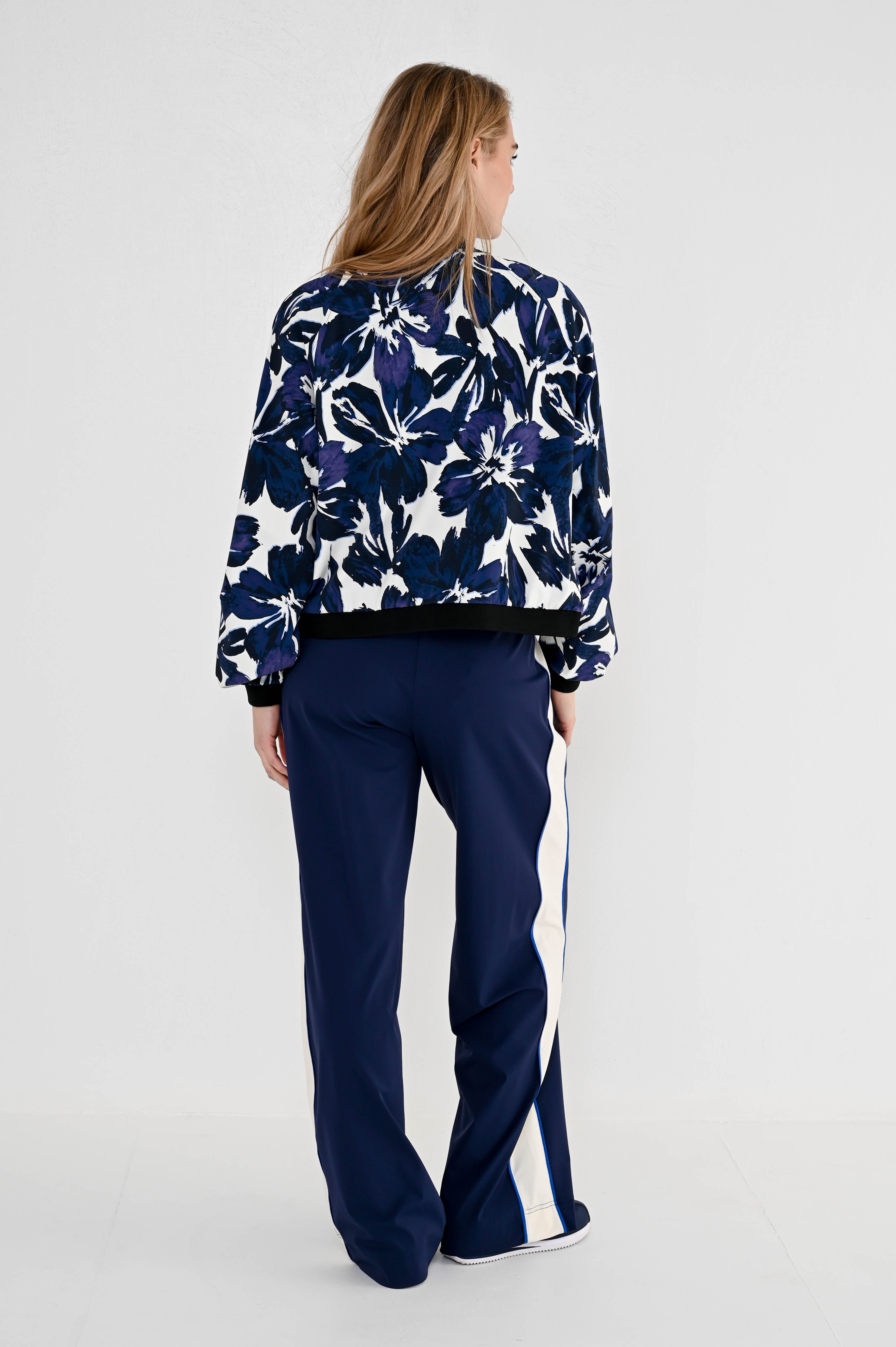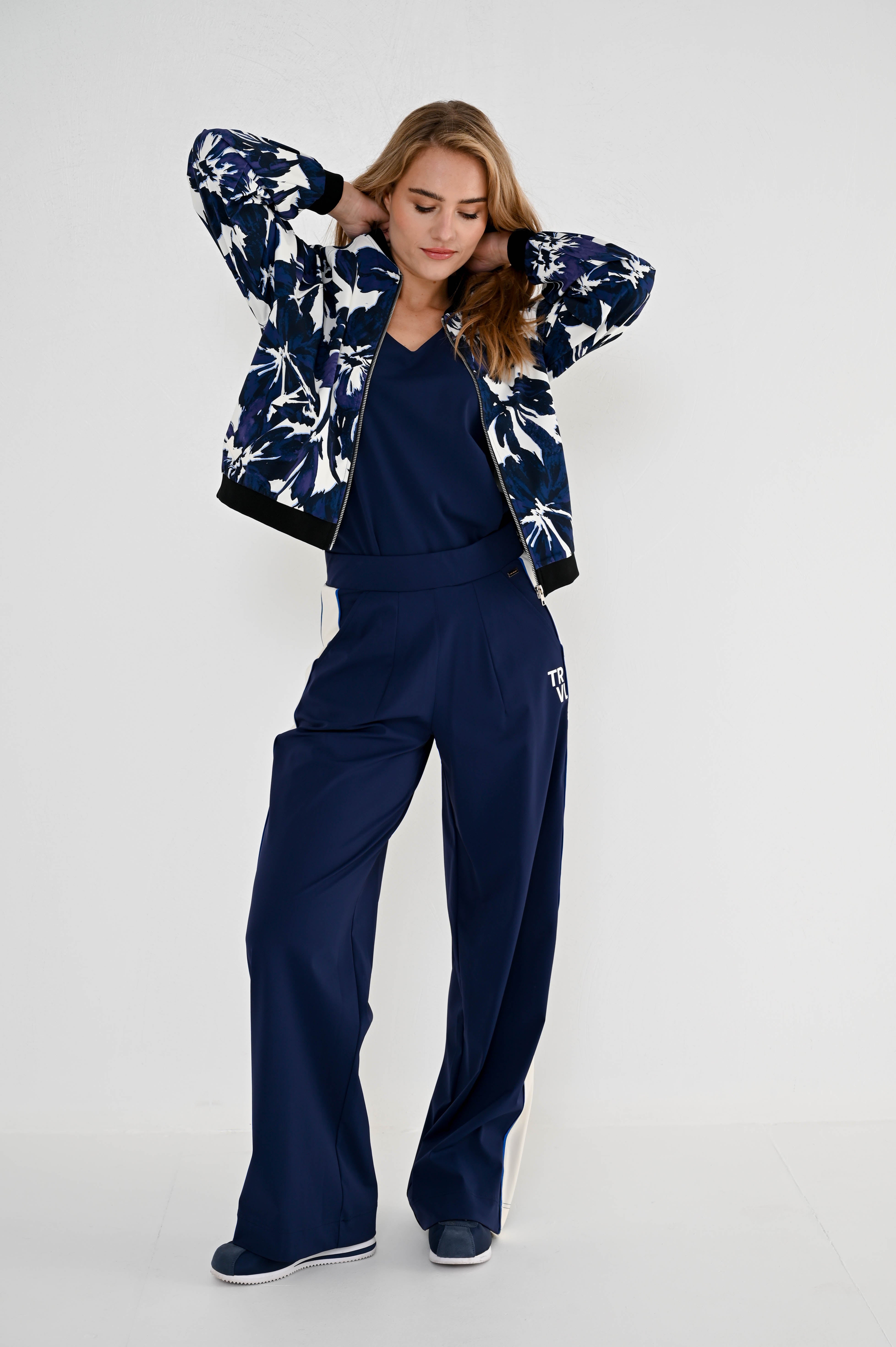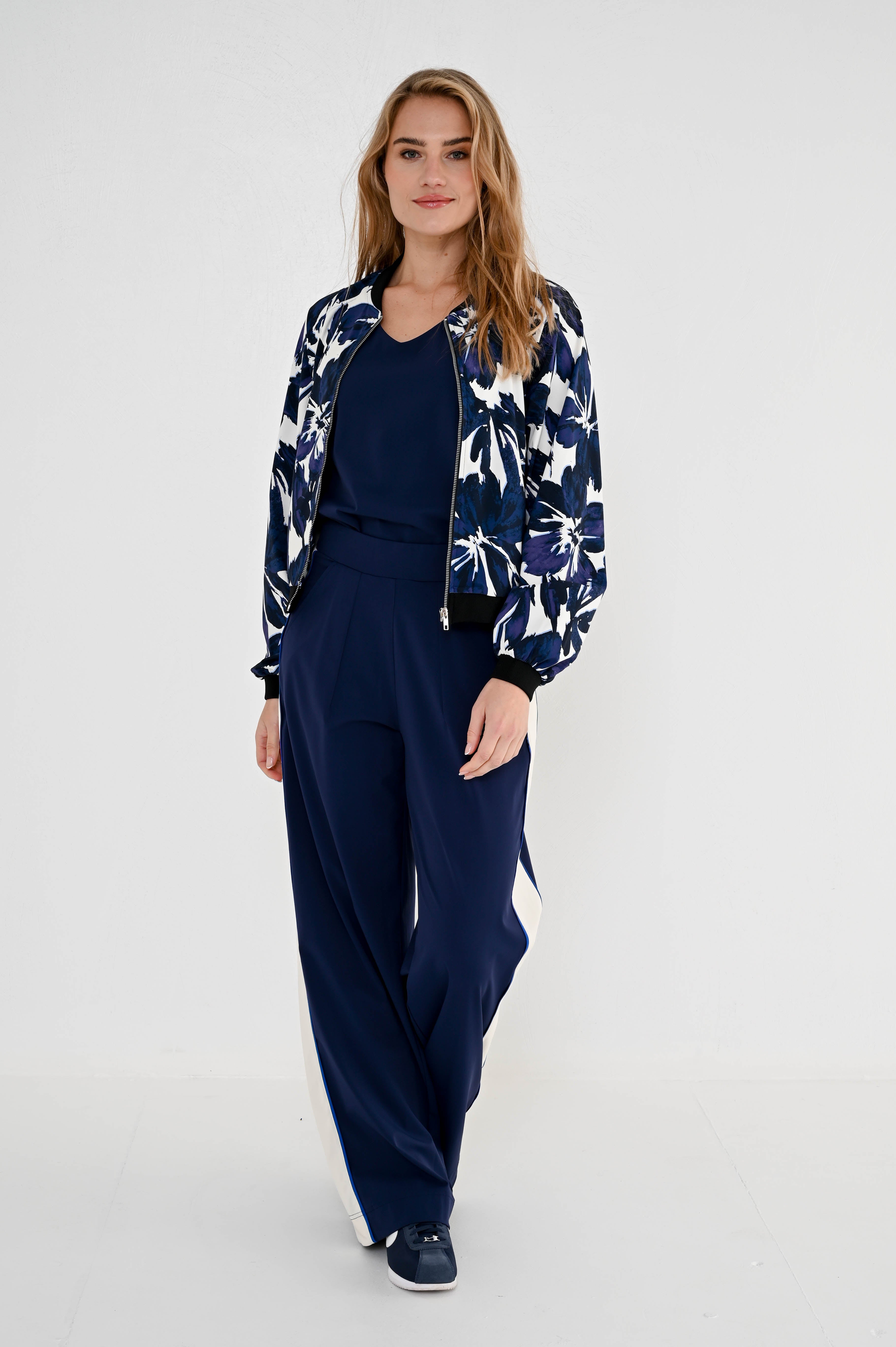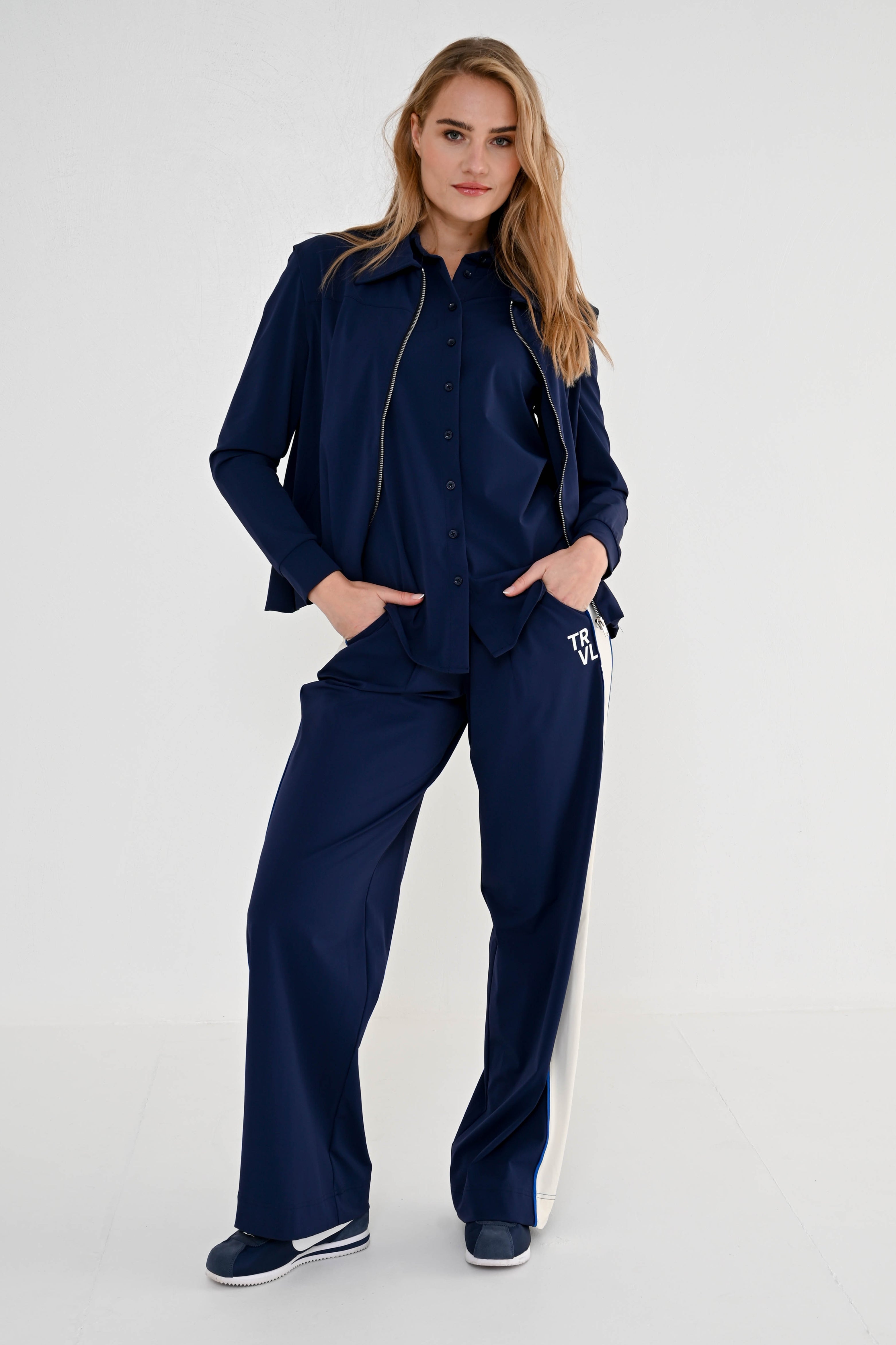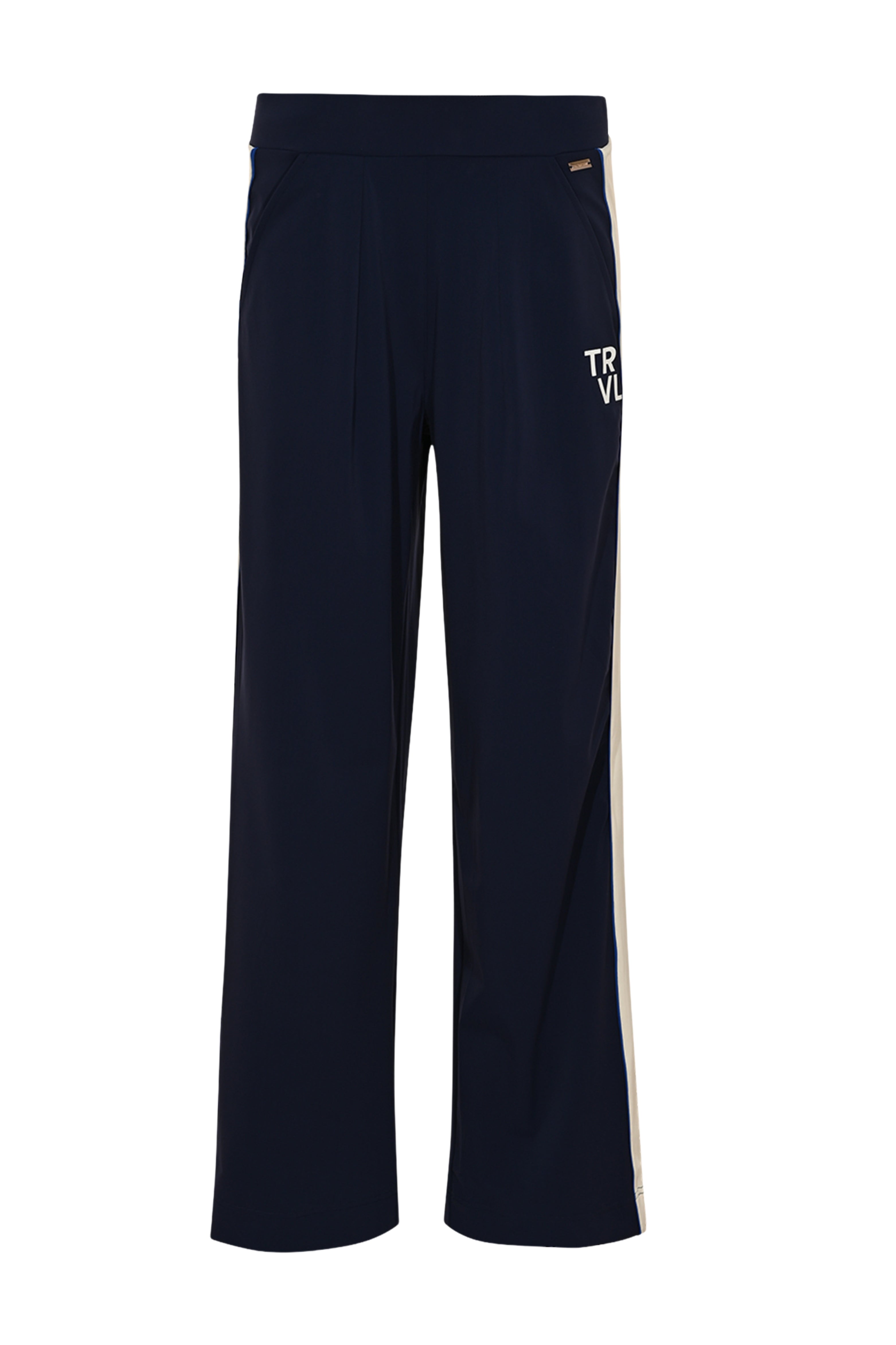 De Travel Broek Rina Navy combineert sportieve details met een comfortabele pasvorm. De zachte travelstof en elastische tailleband zorgen voor een fijn draaggevoel, terwijl de contrasterende bies langs de pijpen een moderne uitstraling geeft.