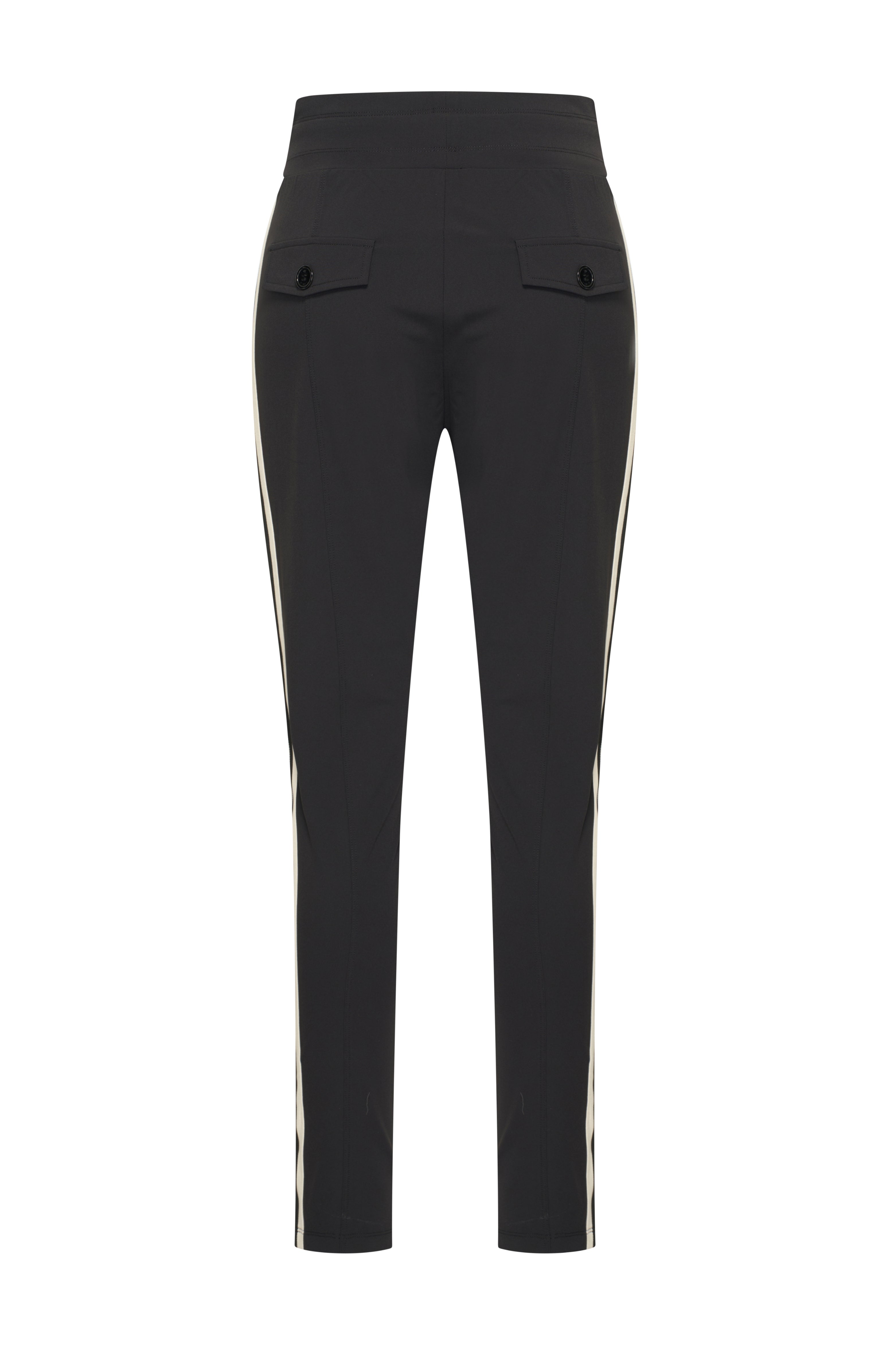 De travel broek Tape in zwart van Mi Piace biedt een perfecte balans tussen comfort en stijl. Dankzij de rekbare travelstof geniet je van optimale bewegingsvrijheid, terwijl de verzorgde afwerking en subtiele details zorgen voor een moderne uitstraling. Combineer deze broek eenvoudig met de bijpassende blazer of top voor een complete en elegante look.