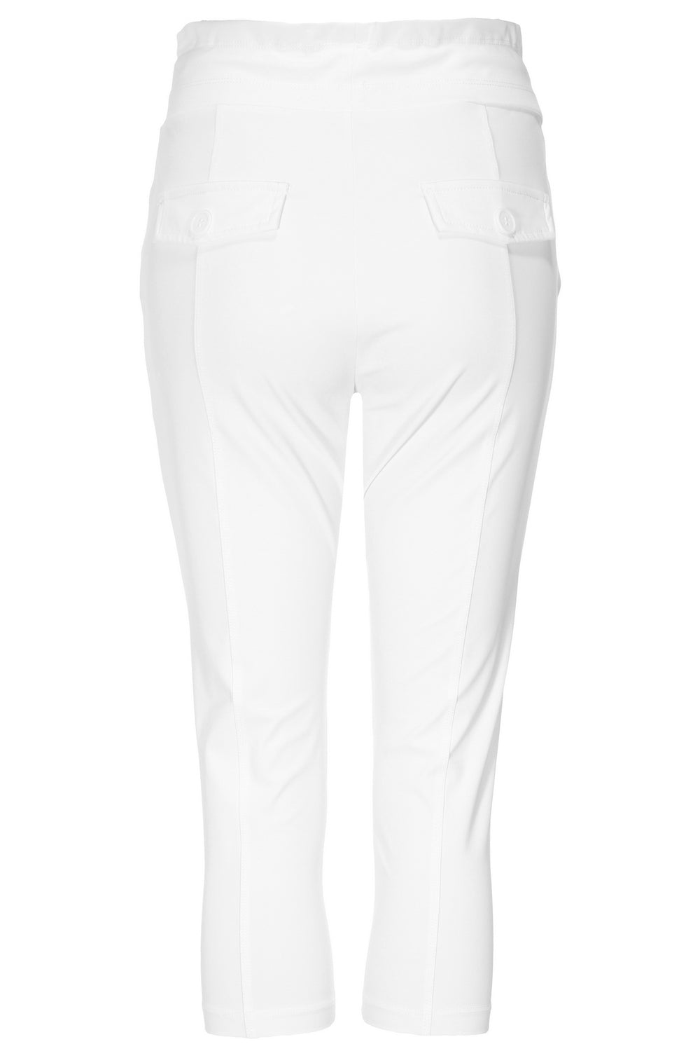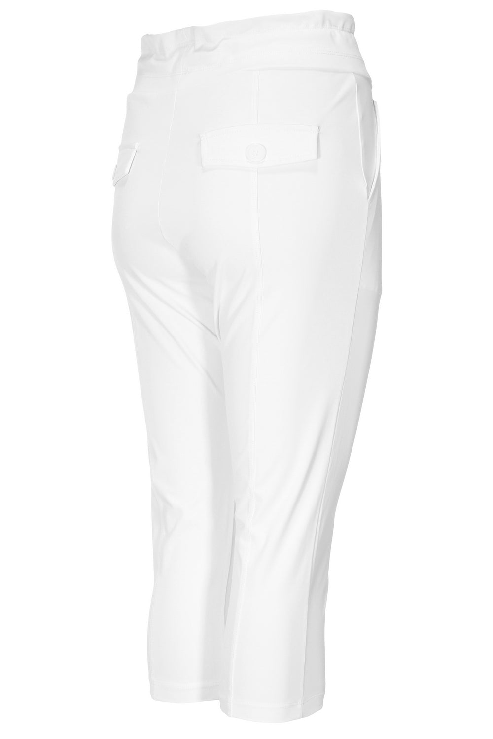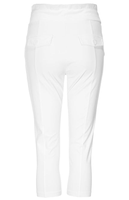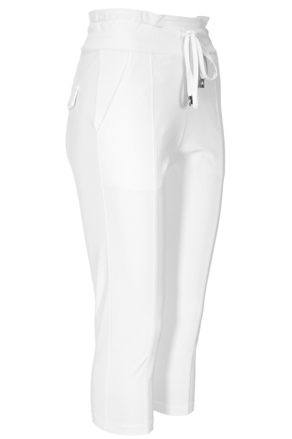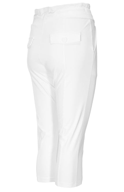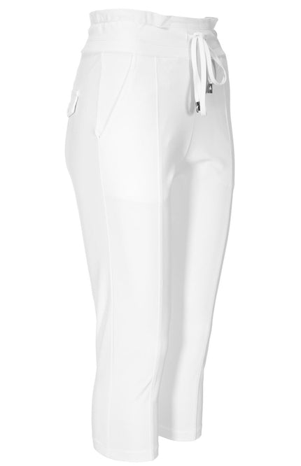 Ontdek de elegante Travel Capri Wit van het merk Mi Piace, een veelzijdige toevoeging aan je zomergarderobe. Deze capri-broek heeft een stijlvolle lengte die net boven de enkels valt en is uitgevoerd in een klassieke witte kleur.
